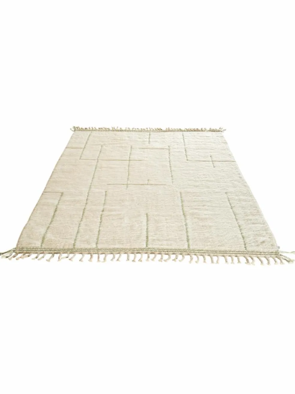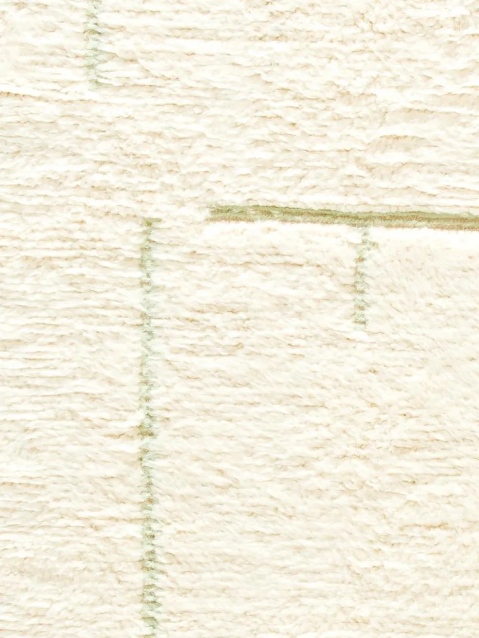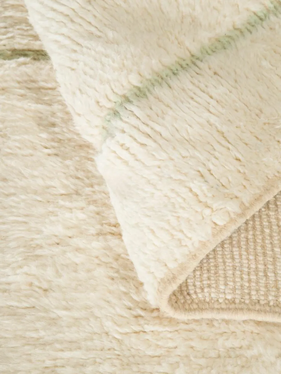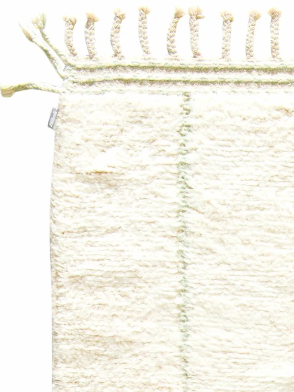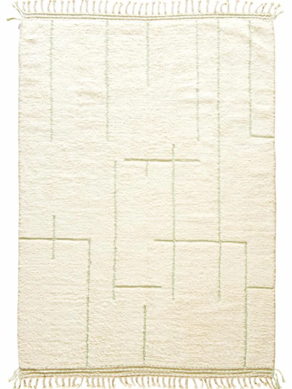 . Die Teppiche sind fast immer weißgrundig und zeichnen sich durch schwarze Zickzack-, Gitter- oder Rauten-Muster sowie einem wohnlich-zotteligen Flor aus. Kaum eine andere Teppichprovenienz passt mit ihren ursprünglichen nomadischen Designs besser in einen minimalistischen Wohnstil. Wie viele andere Nomadenteppiche auch, wurden dieBeni Ourain