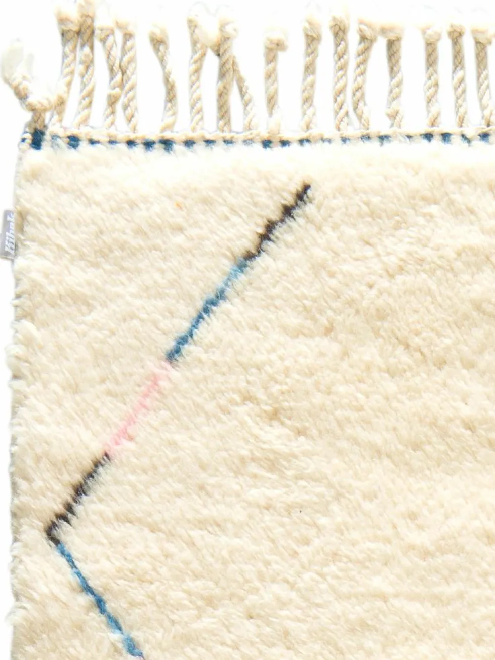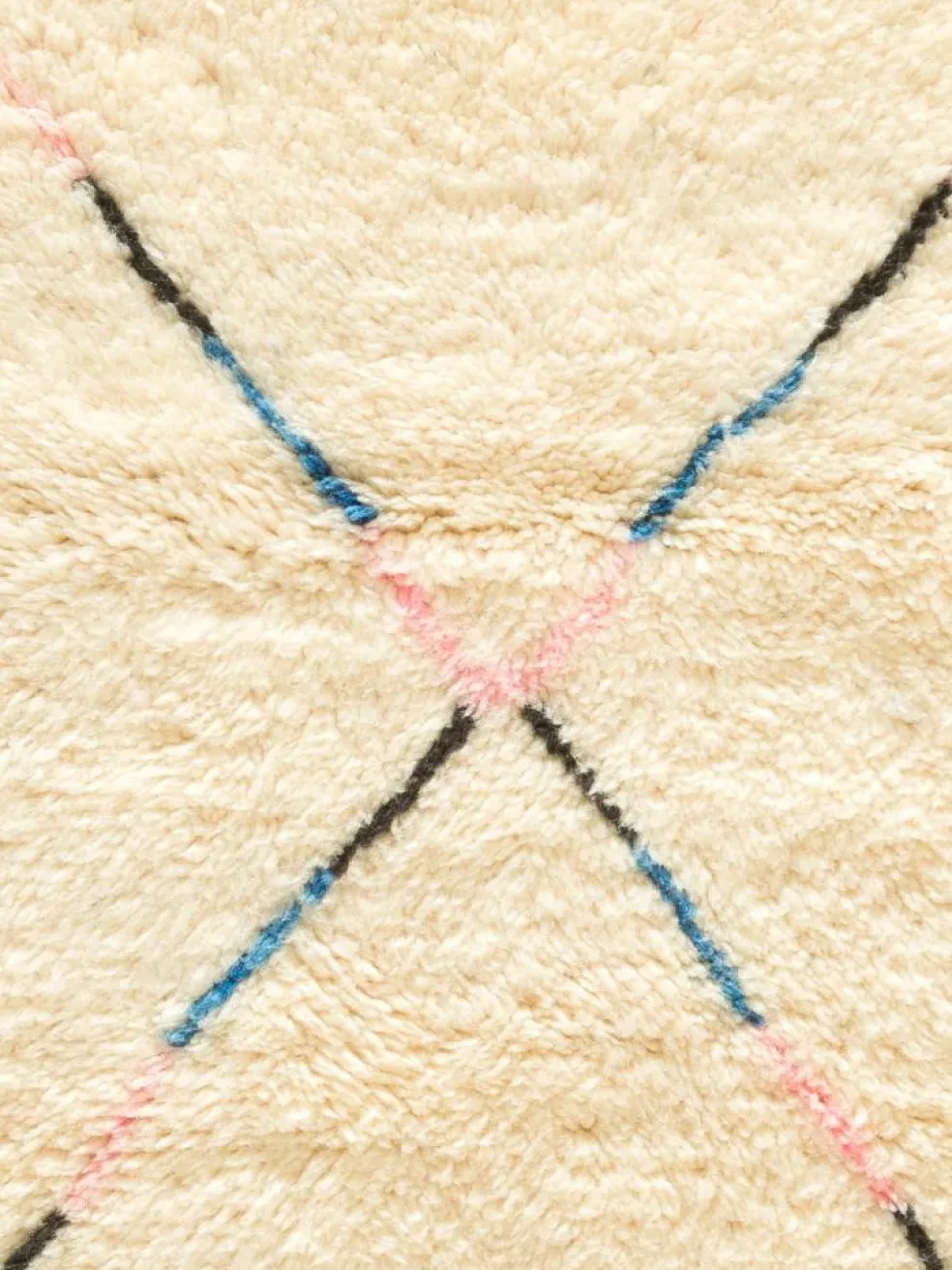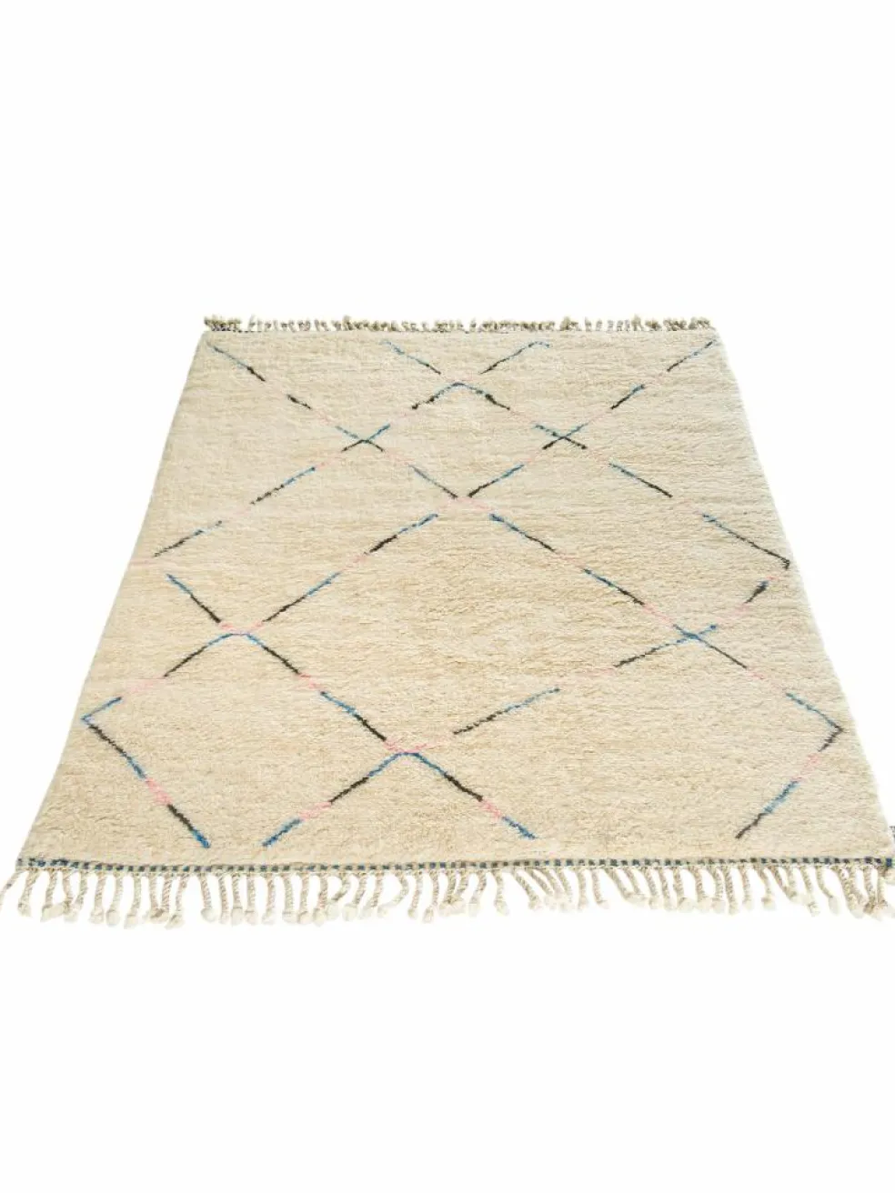 . Die Teppiche sind fast immer weißgrundig und zeichnen sich durch schwarze Zickzack-, Gitter- oder Rauten-Muster sowie einem wohnlich-zotteligen Flor aus. Kaum eine andere Teppichprovenienz passt mit ihren ursprünglichen nomadischen Designs besser in einen minimalistischen Wohnstil. Wie viele andere Nomadenteppiche auch, wurden dieBeni Ourain