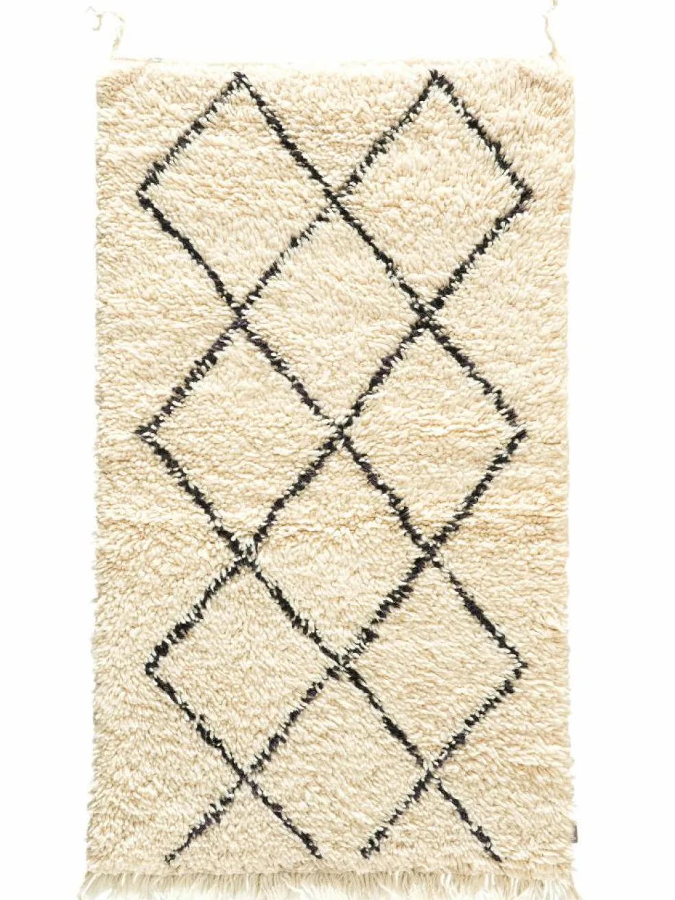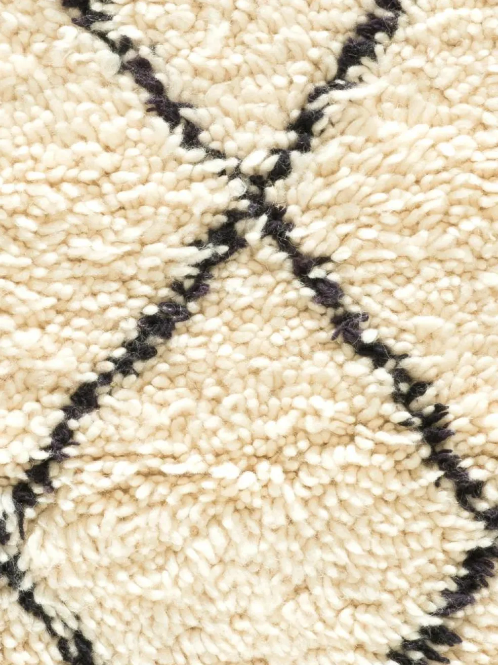 . Die Teppiche sind fast immer weißgrundig und zeichnen sich durch schwarze Zickzack-, Gitter- oder Rauten-Muster sowie einem wohnlich-zotteligen Flor aus. Kaum eine andere Teppichprovenienz passt mit ihren ursprünglichen nomadischen Designs besser in einen minimalistischen Wohnstil. Wie viele andere Nomadenteppiche auch, wurden dieBeni Ourain