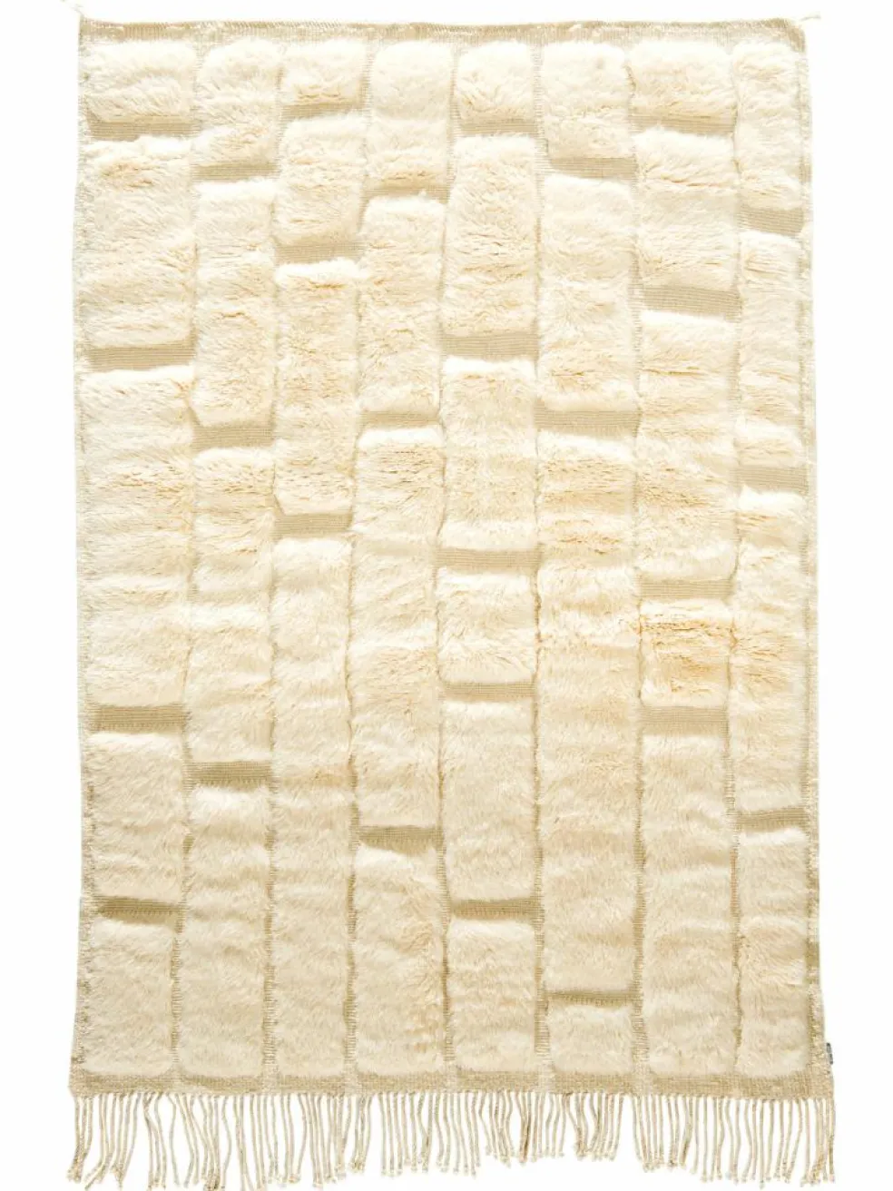 . Die Teppiche sind fast immer weißgrundig und zeichnen sich durch schwarze Zickzack-, Gitter- oder Rauten-Muster sowie einem wohnlich-zotteligen Flor aus. Kaum eine andere Teppichprovenienz passt mit ihren ursprünglichen nomadischen Designs besser in einen minimalistischen Wohnstil. Wie viele andere Nomadenteppiche auch, wurden dieBeni Ourain
