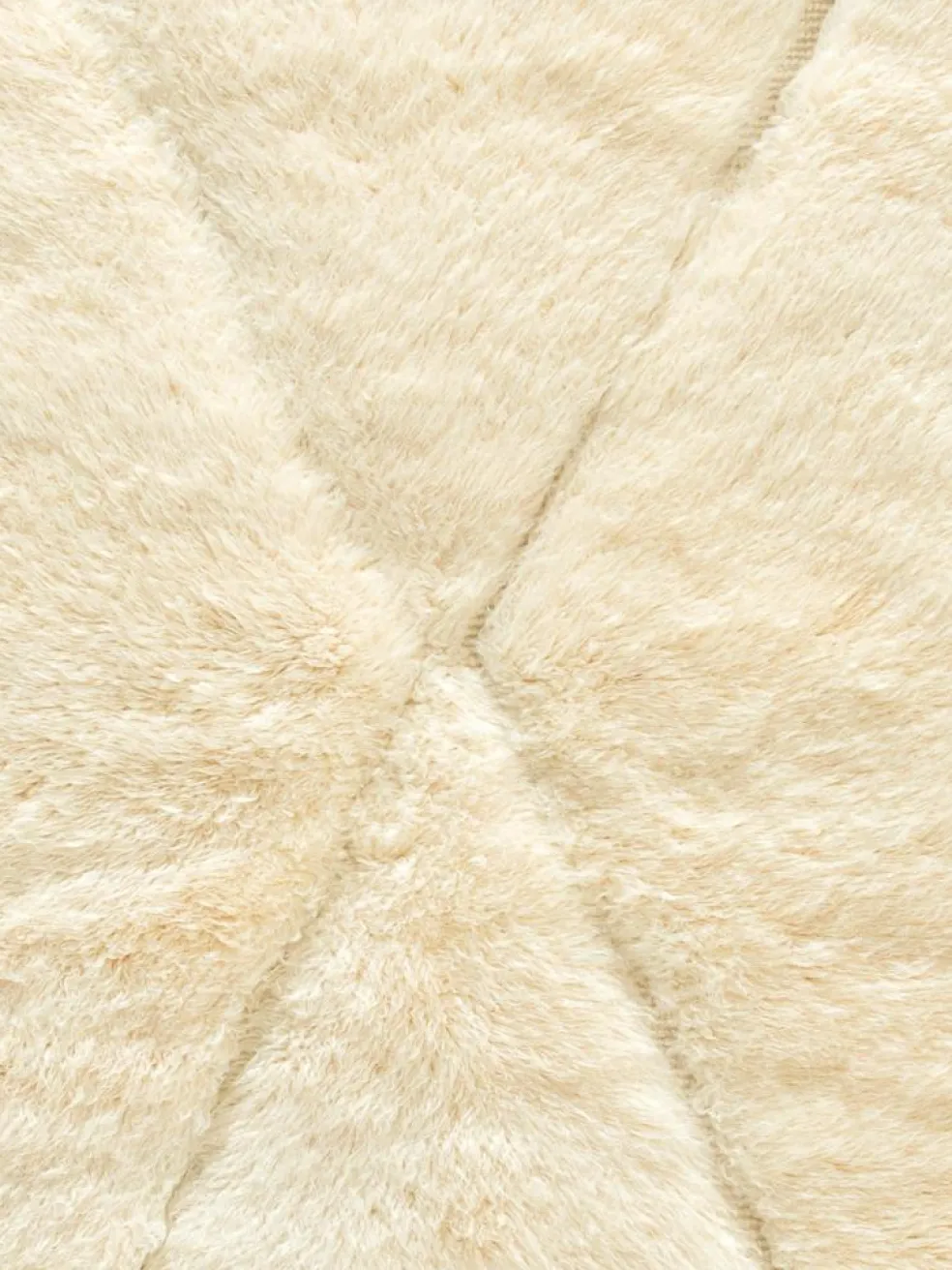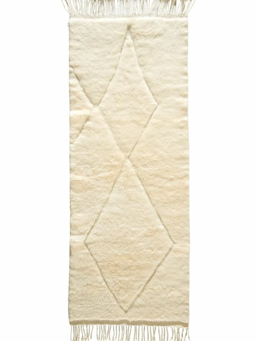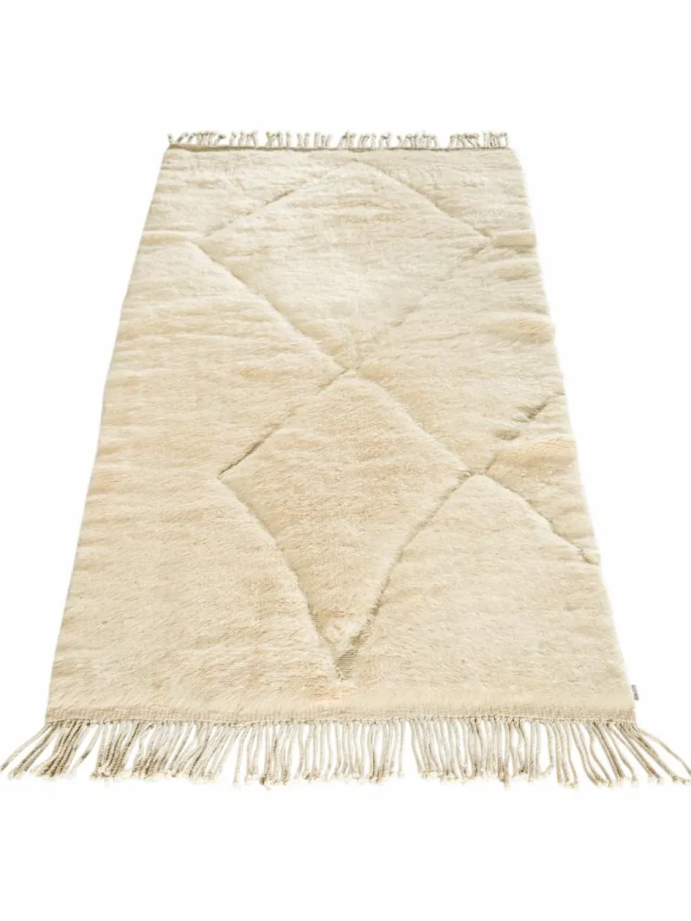 . Die Teppiche sind fast immer weißgrundig und zeichnen sich durch schwarze Zickzack-, Gitter- oder Rauten-Muster sowie einem wohnlich-zotteligen Flor aus. Kaum eine andere Teppichprovenienz passt mit ihren ursprünglichen nomadischen Designs besser in einen minimalistischen Wohnstil. Wie viele andere Nomadenteppiche auch, wurden dieBeni Ourain