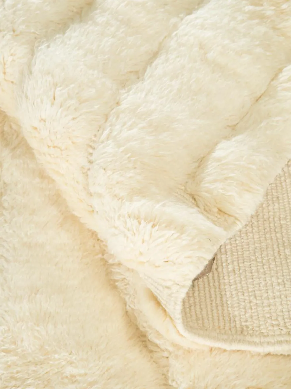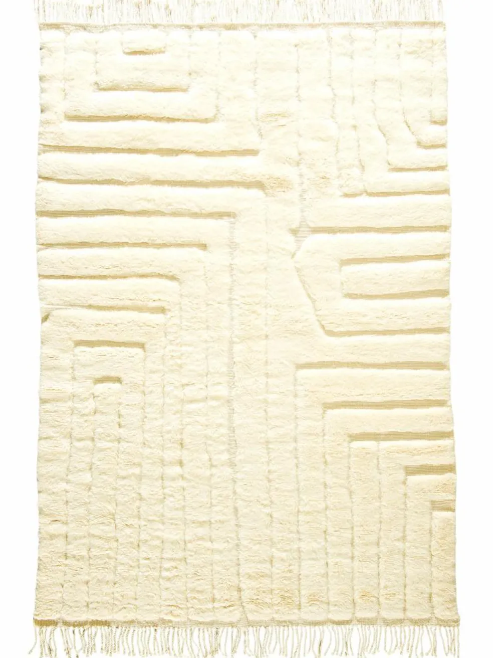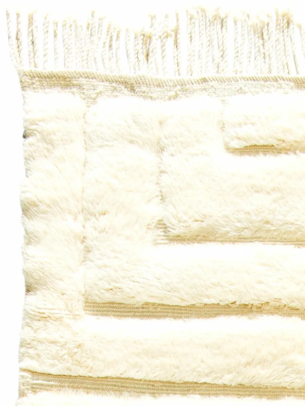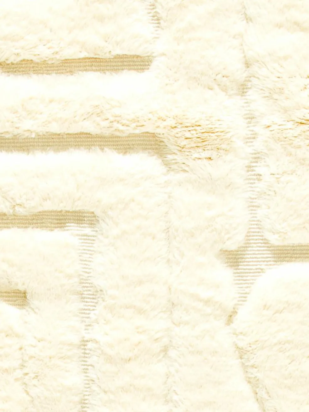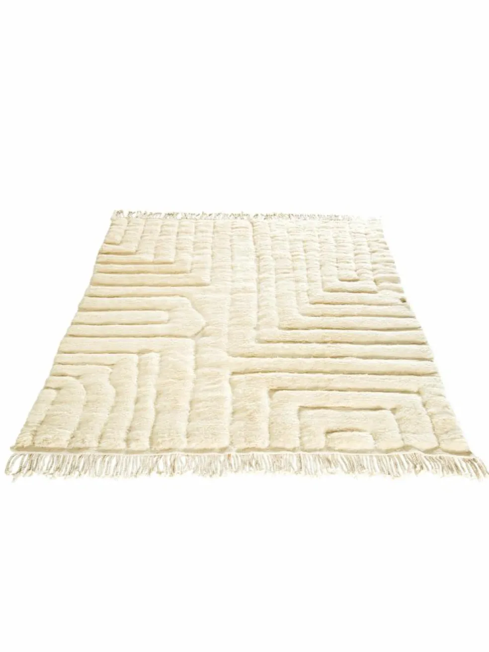 . Die Teppiche sind fast immer weißgrundig und zeichnen sich durch schwarze Zickzack-, Gitter- oder Rauten-Muster sowie einem wohnlich-zotteligen Flor aus. Kaum eine andere Teppichprovenienz passt mit ihren ursprünglichen nomadischen Designs besser in einen minimalistischen Wohnstil. Wie viele andere Nomadenteppiche auch, wurden dieBeni Ourain