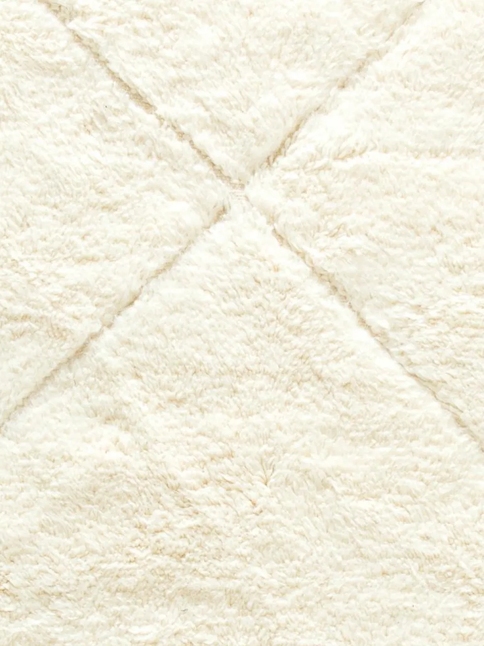 . Die Teppiche sind fast immer weißgrundig und zeichnen sich durch schwarze Zickzack-, Gitter- oder Rauten-Muster sowie einem wohnlich-zotteligen Flor aus. Kaum eine andere Teppichprovenienz passt mit ihren ursprünglichen nomadischen Designs besser in einen minimalistischen Wohnstil. Wie viele andere Nomadenteppiche auch, wurden dieBeni Ourain