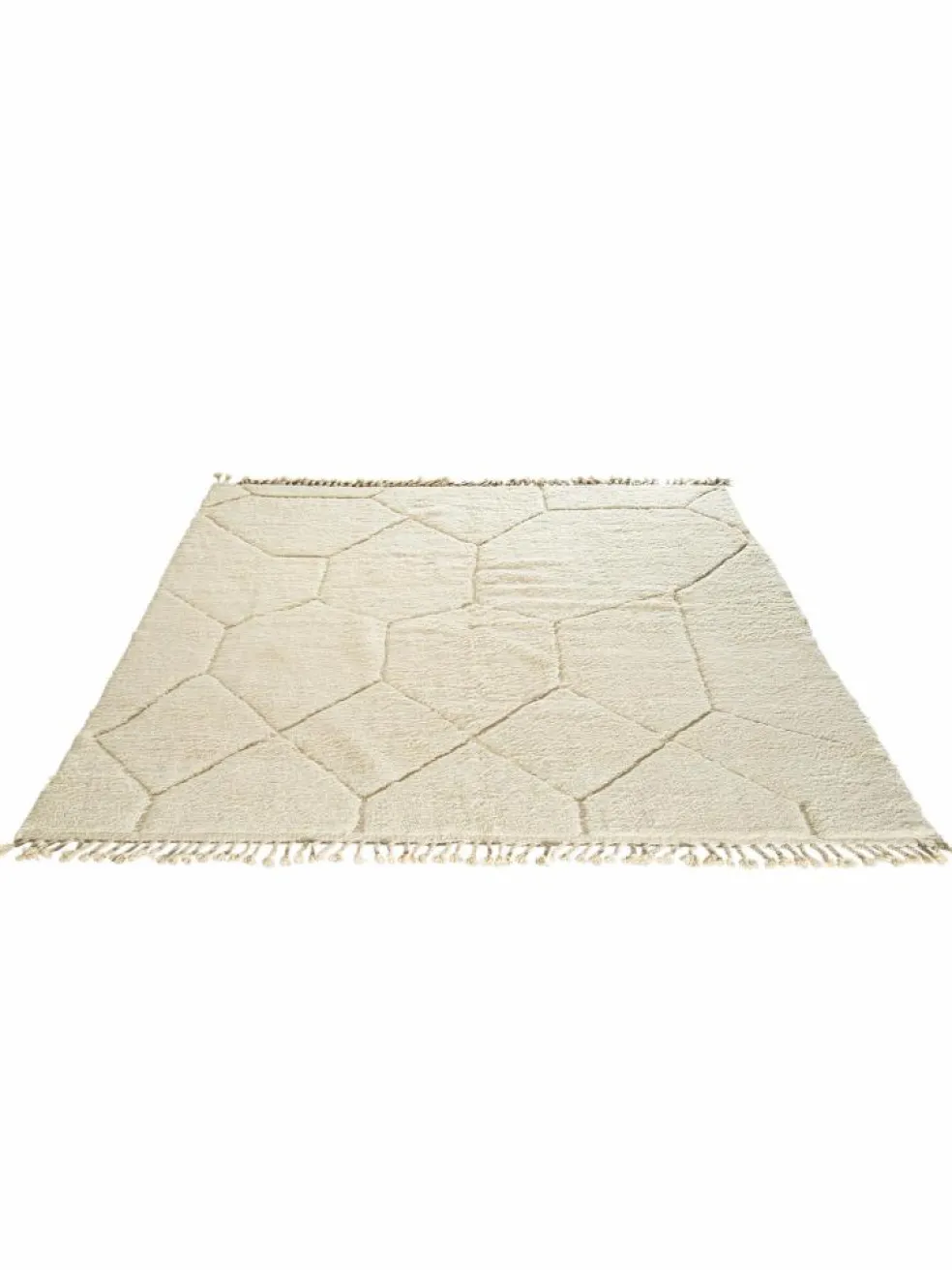 . Die Teppiche sind fast immer weißgrundig und zeichnen sich durch schwarze Zickzack-, Gitter- oder Rauten-Muster sowie einem wohnlich-zotteligen Flor aus. Kaum eine andere Teppichprovenienz passt mit ihren ursprünglichen nomadischen Designs besser in einen minimalistischen Wohnstil. Wie viele andere Nomadenteppiche auch, wurden dieBeni Ourain