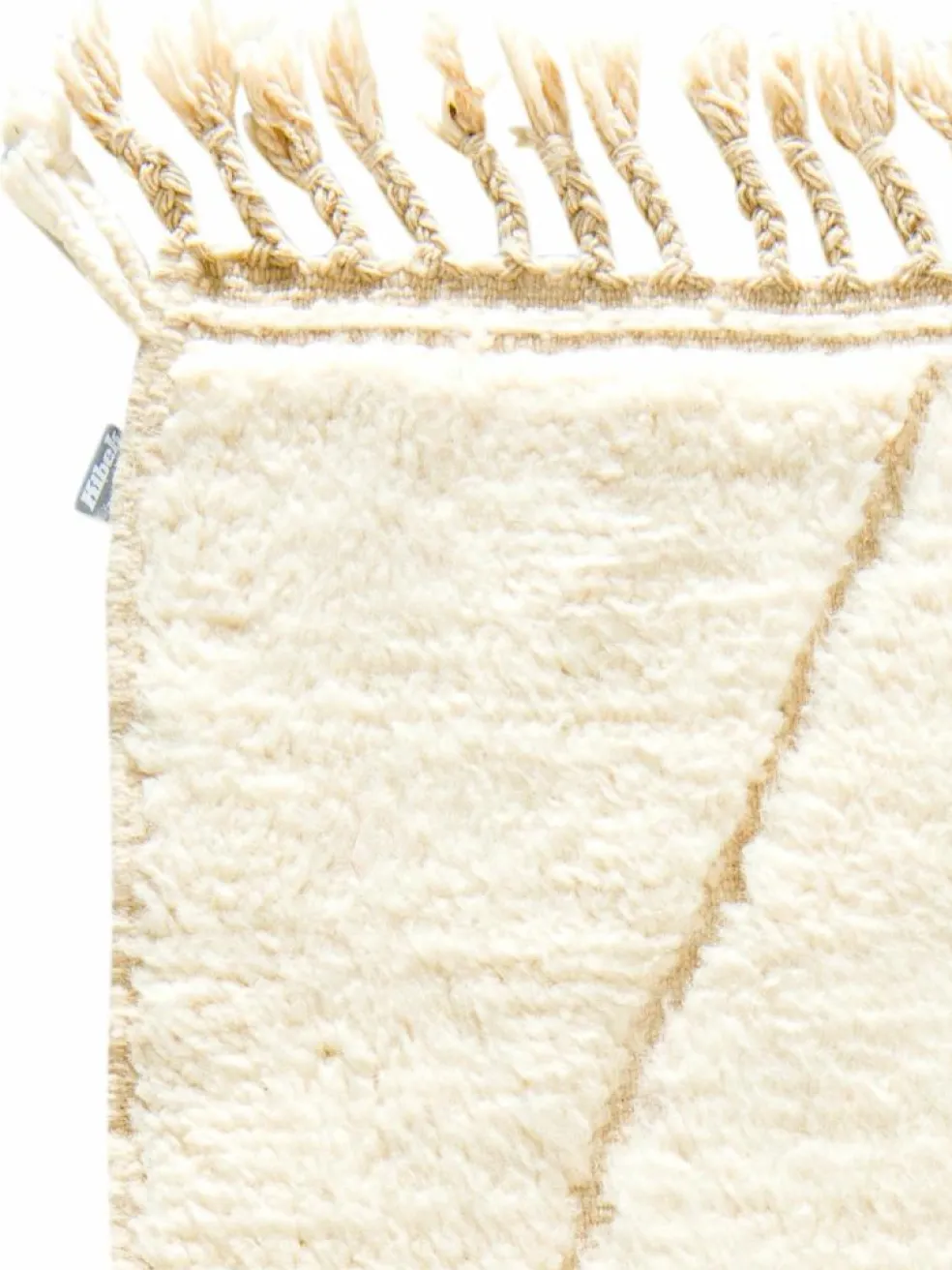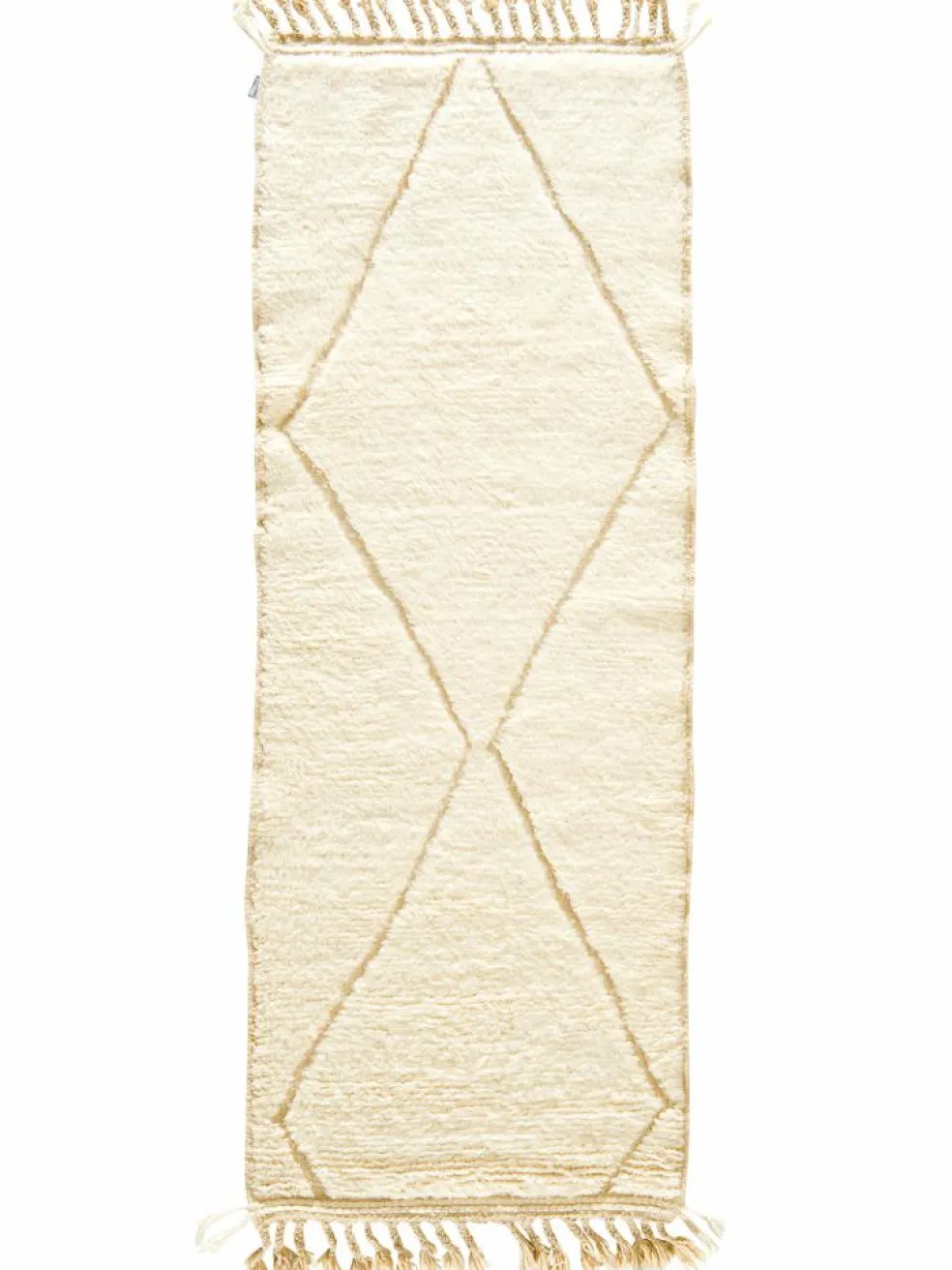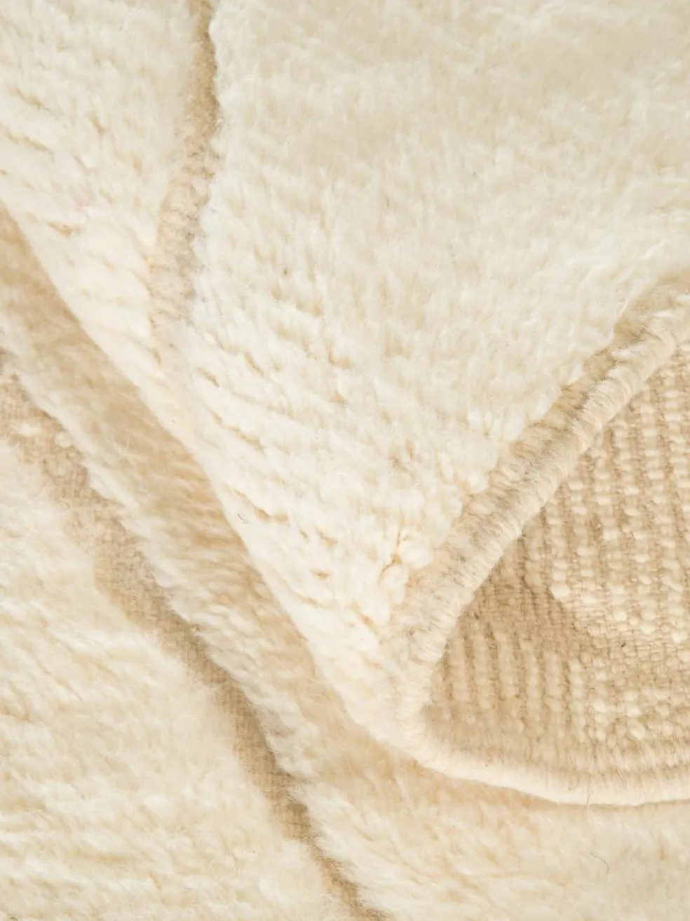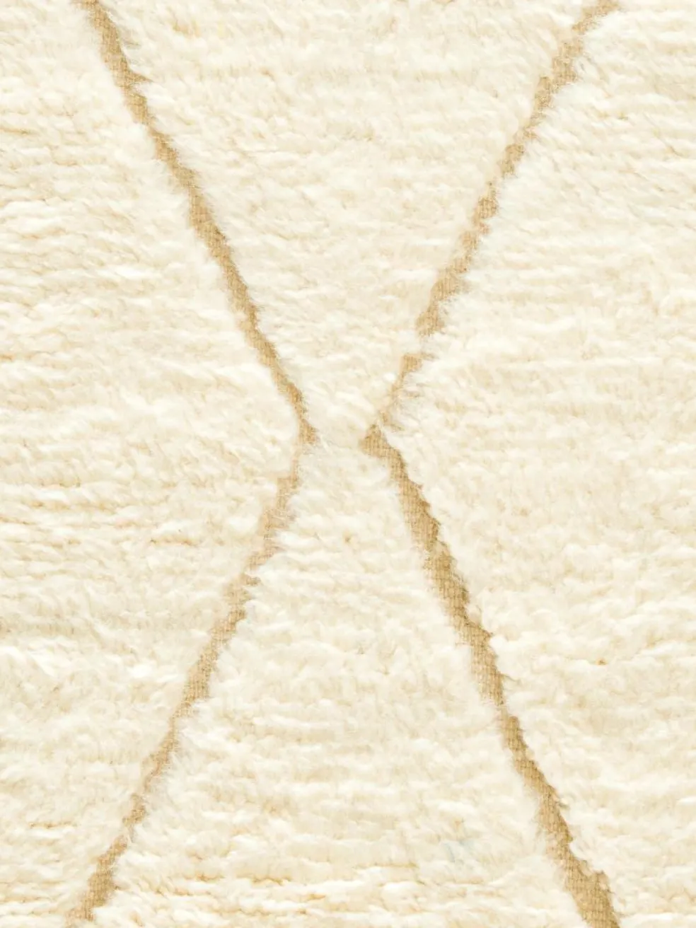 . Die Teppiche sind fast immer weißgrundig und zeichnen sich durch schwarze Zickzack-, Gitter- oder Rauten-Muster sowie einem wohnlich-zotteligen Flor aus. Kaum eine andere Teppichprovenienz passt mit ihren ursprünglichen nomadischen Designs besser in einen minimalistischen Wohnstil. Wie viele andere Nomadenteppiche auch, wurden dieBeni Ourain