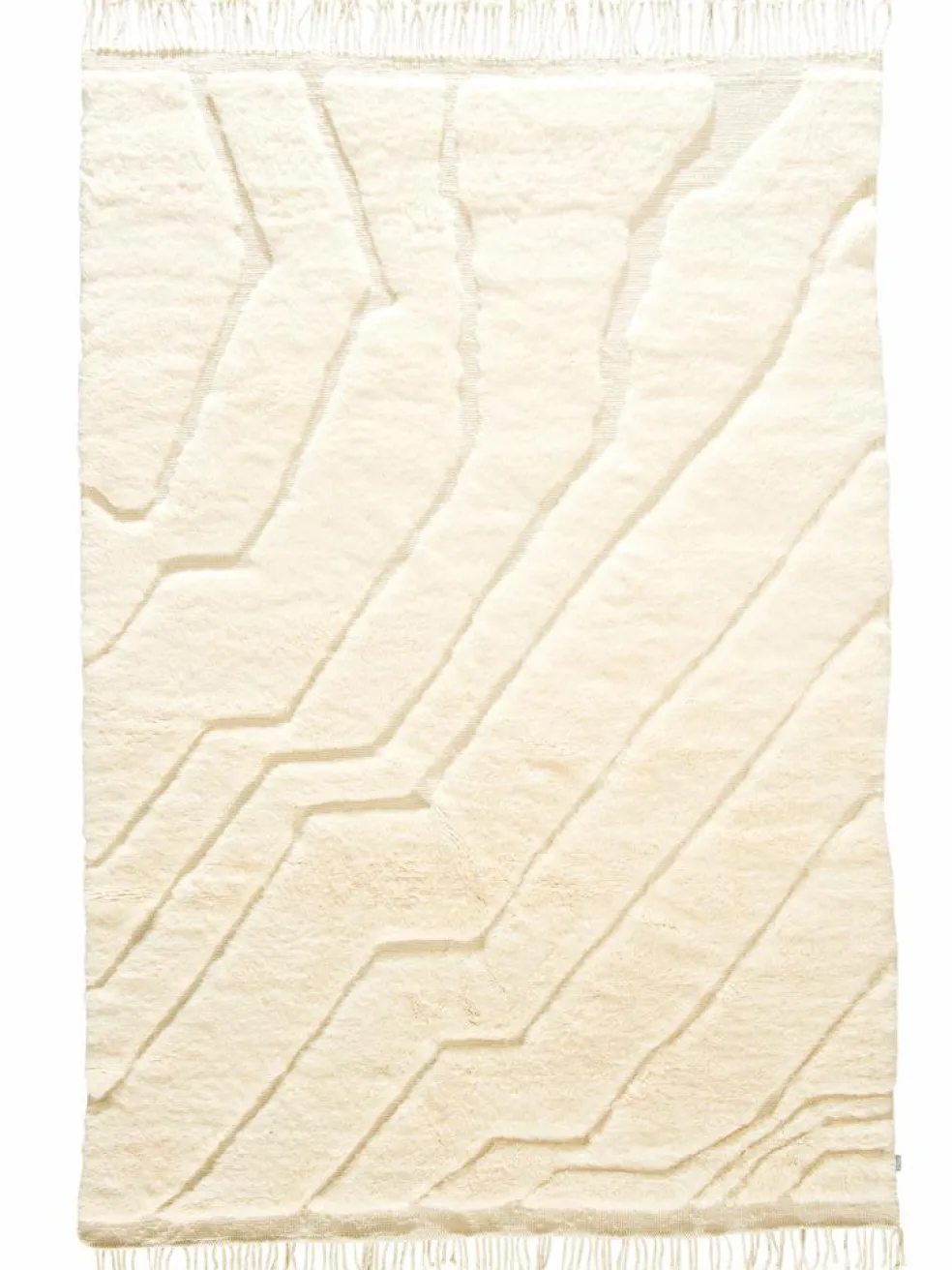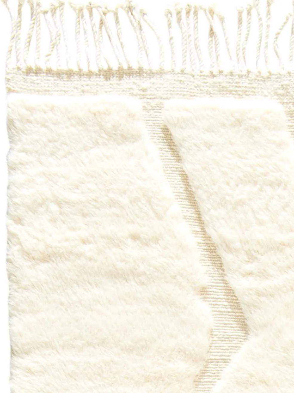. Die Teppiche sind fast immer weißgrundig und zeichnen sich durch schwarze Zickzack-, Gitter- oder Rauten-Muster sowie einem wohnlich-zotteligen Flor aus. Kaum eine andere Teppichprovenienz passt mit ihren ursprünglichen nomadischen Designs besser in einen minimalistischen Wohnstil. Wie viele andere Nomadenteppiche auch, wurden dieBeni Ourain