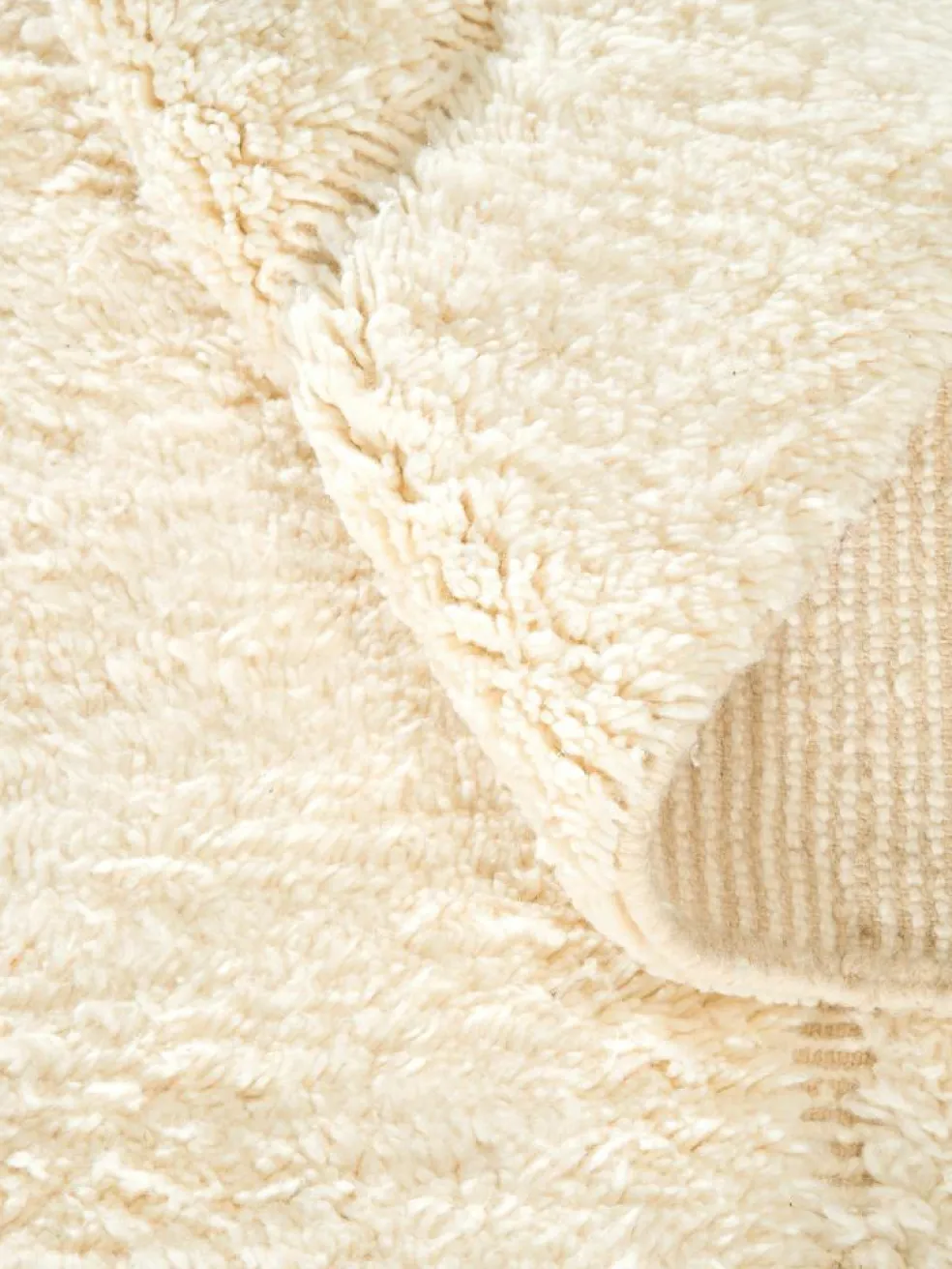 . Die Teppiche sind fast immer weißgrundig und zeichnen sich durch schwarze Zickzack-, Gitter- oder Rauten-Muster sowie einem wohnlich-zotteligen Flor aus. Kaum eine andere Teppichprovenienz passt mit ihren ursprünglichen nomadischen Designs besser in einen minimalistischen Wohnstil. Wie viele andere Nomadenteppiche auch, wurden dieBeni Ourain
