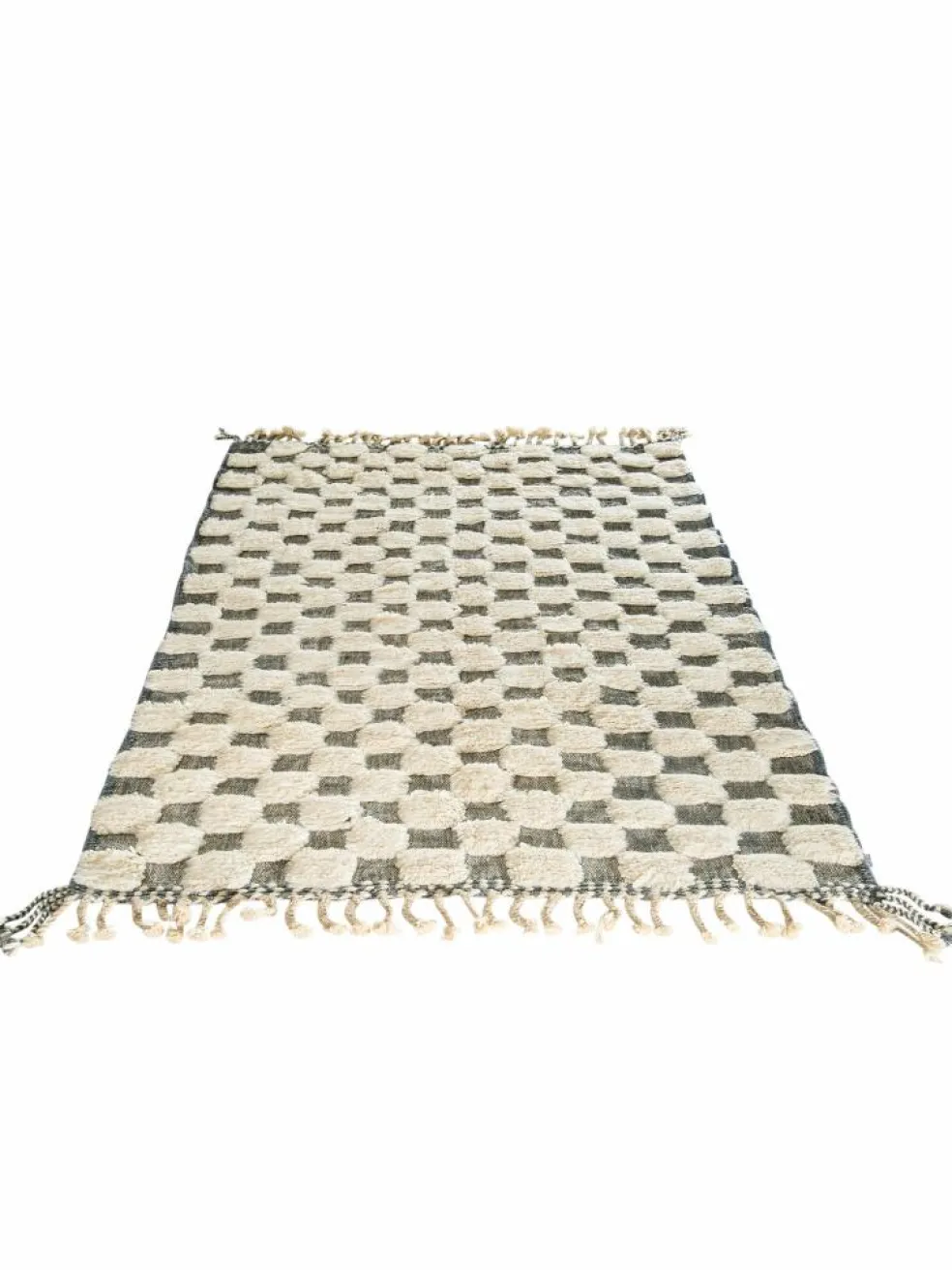 . Die Teppiche sind fast immer weißgrundig und zeichnen sich durch schwarze Zickzack-, Gitter- oder Rauten-Muster sowie einem wohnlich-zotteligen Flor aus. Kaum eine andere Teppichprovenienz passt mit ihren ursprünglichen nomadischen Designs besser in einen minimalistischen Wohnstil. Wie viele andere Nomadenteppiche auch, wurden dieBeni Ourain