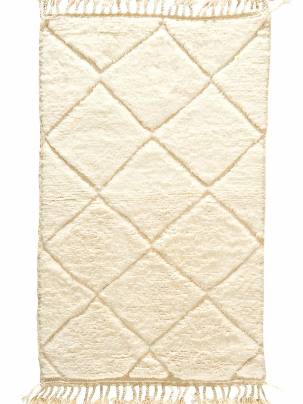 . Die Teppiche sind fast immer weißgrundig und zeichnen sich durch schwarze Zickzack-, Gitter- oder Rauten-Muster sowie einem wohnlich-zotteligen Flor aus. Kaum eine andere Teppichprovenienz passt mit ihren ursprünglichen nomadischen Designs besser in einen minimalistischen Wohnstil. Wie viele andere Nomadenteppiche auch, wurden dieBeni Ourain