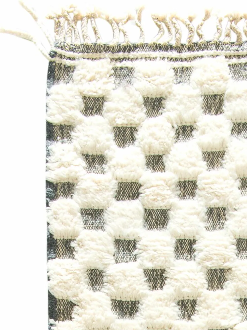 . Die Teppiche sind fast immer weißgrundig und zeichnen sich durch schwarze Zickzack-, Gitter- oder Rauten-Muster sowie einem wohnlich-zotteligen Flor aus. Kaum eine andere Teppichprovenienz passt mit ihren ursprünglichen nomadischen Designs besser in einen minimalistischen Wohnstil. Wie viele andere Nomadenteppiche auch, wurden dieBeni Ourain