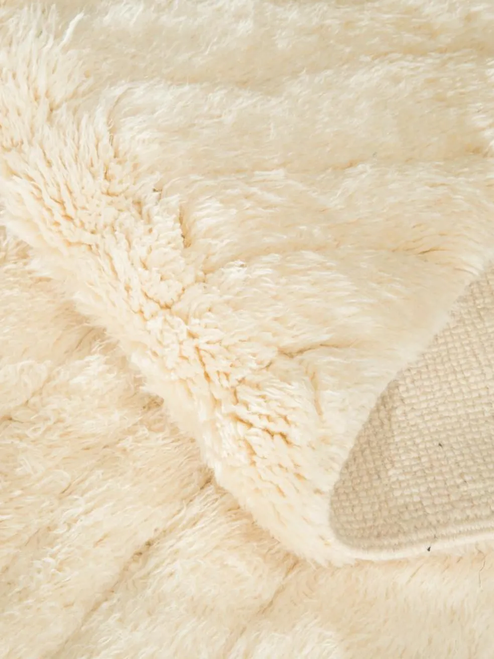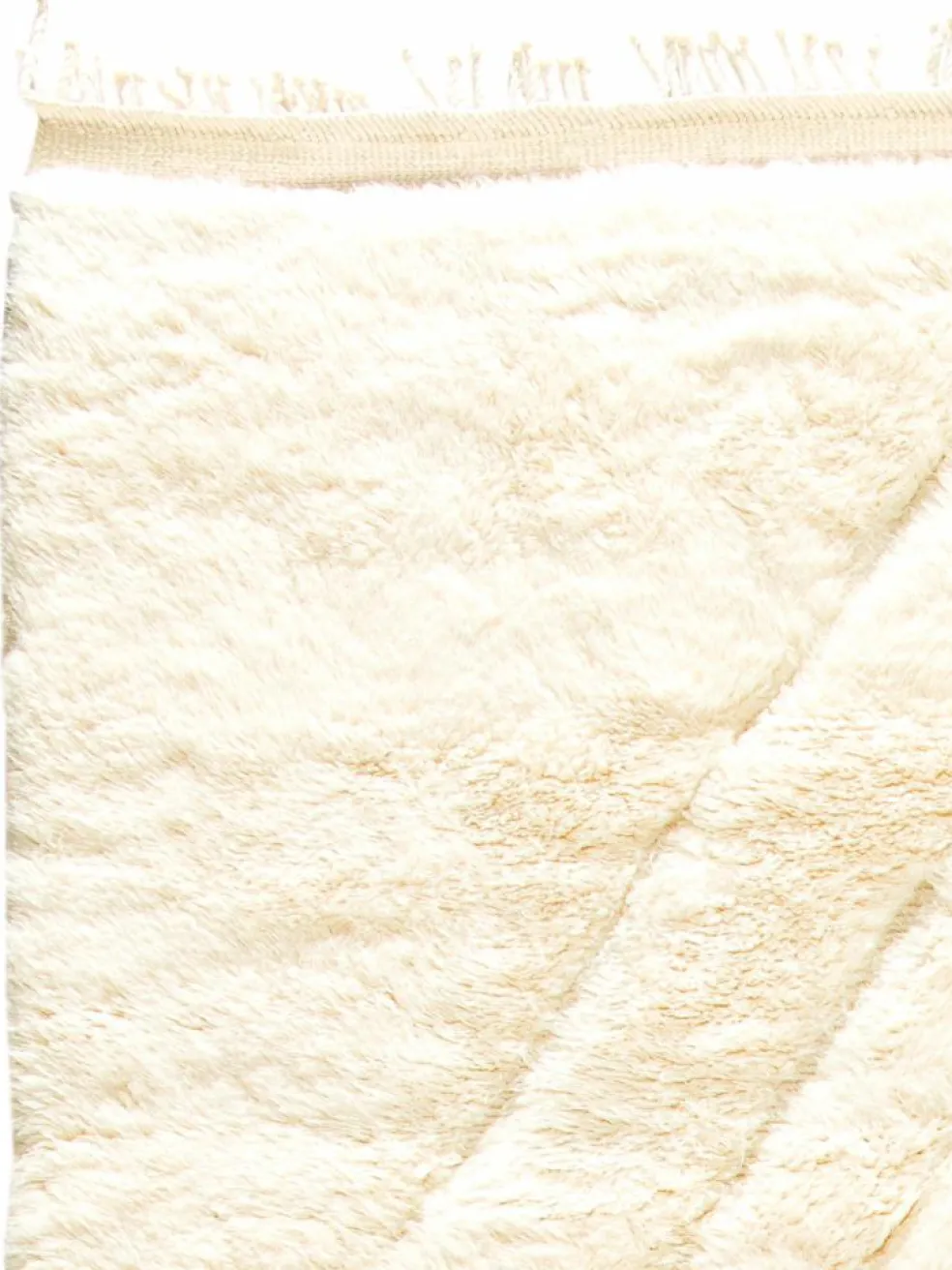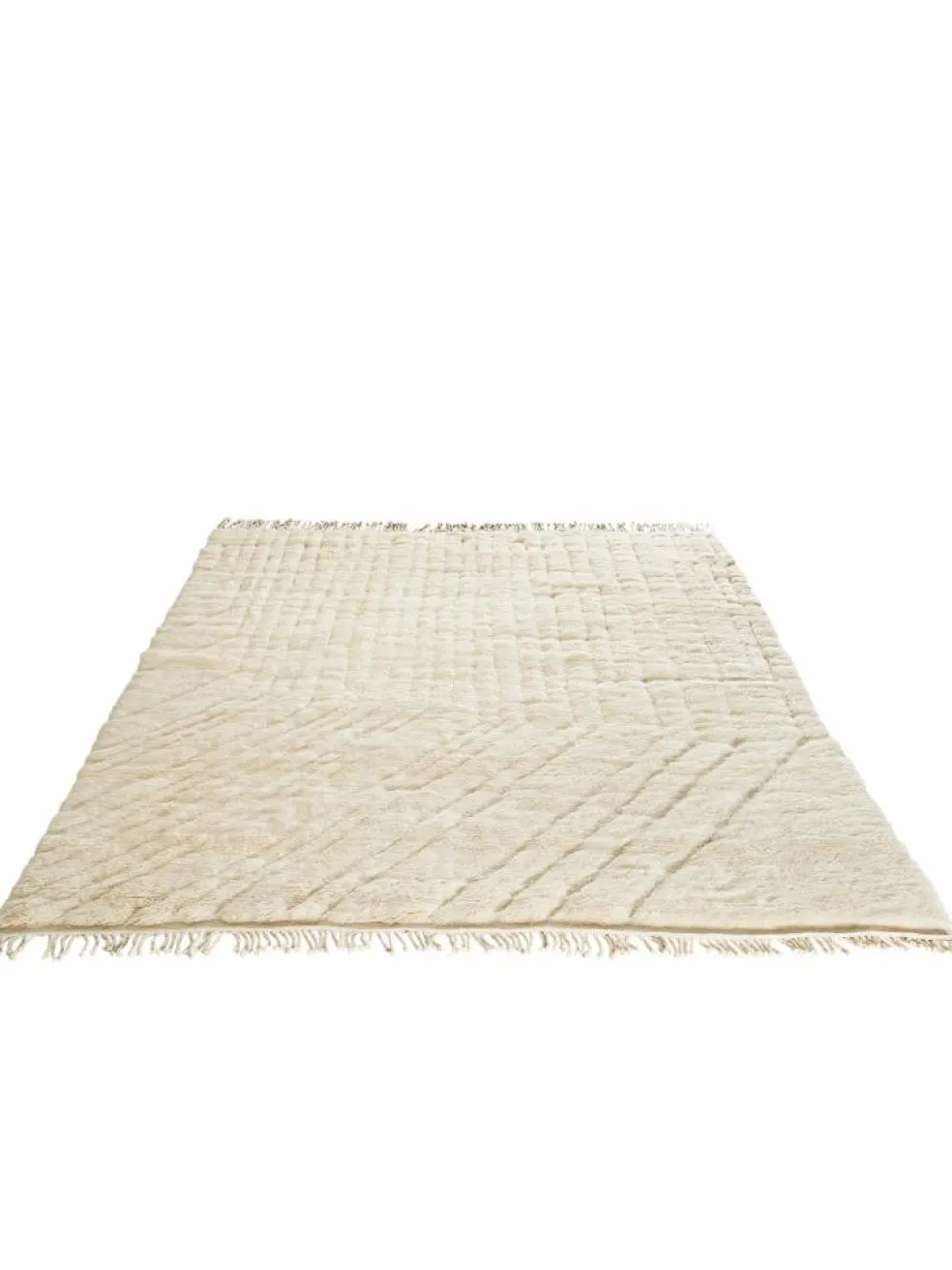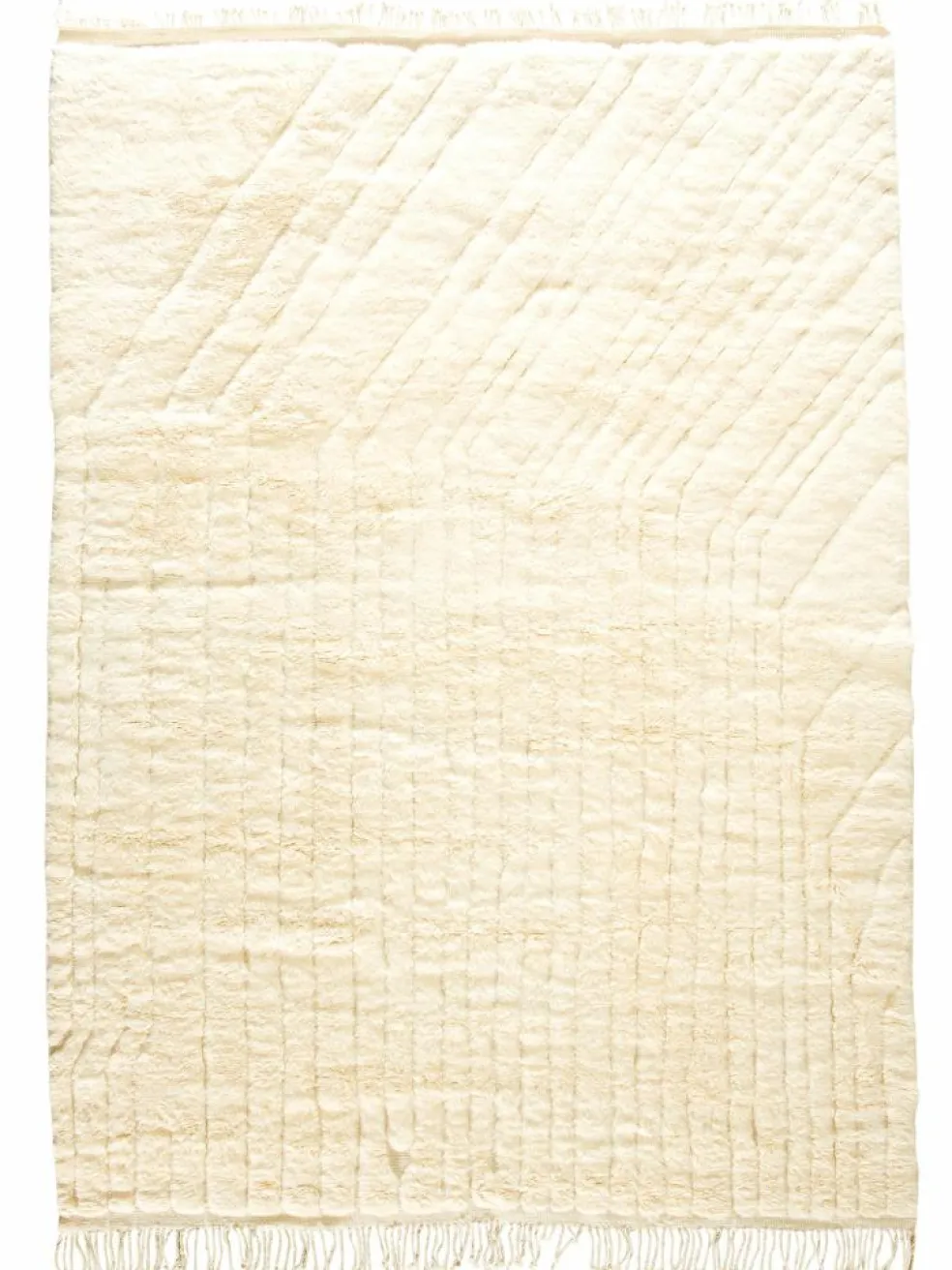 . Die Teppiche sind fast immer weißgrundig und zeichnen sich durch schwarze Zickzack-, Gitter- oder Rauten-Muster sowie einem wohnlich-zotteligen Flor aus. Kaum eine andere Teppichprovenienz passt mit ihren ursprünglichen nomadischen Designs besser in einen minimalistischen Wohnstil. Wie viele andere Nomadenteppiche auch, wurden dieBeni Ourain