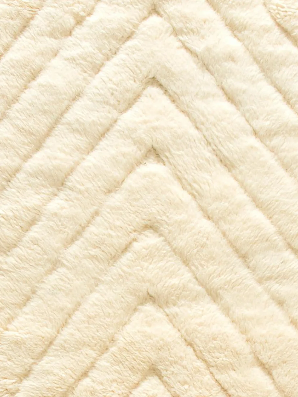 . Die Teppiche sind fast immer weißgrundig und zeichnen sich durch schwarze Zickzack-, Gitter- oder Rauten-Muster sowie einem wohnlich-zotteligen Flor aus. Kaum eine andere Teppichprovenienz passt mit ihren ursprünglichen nomadischen Designs besser in einen minimalistischen Wohnstil. Wie viele andere Nomadenteppiche auch, wurden dieBeni Ourain