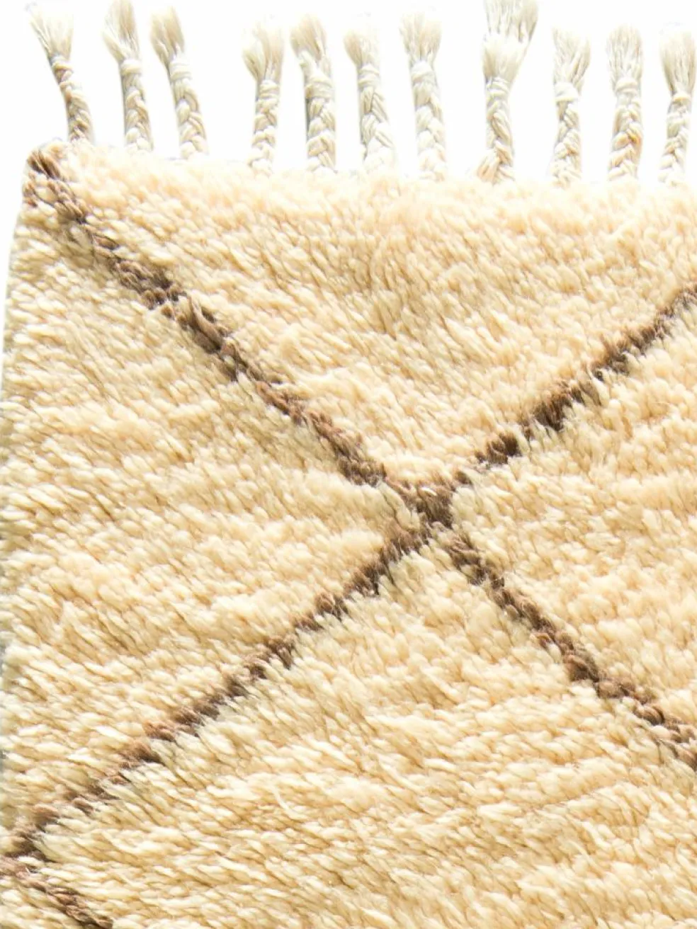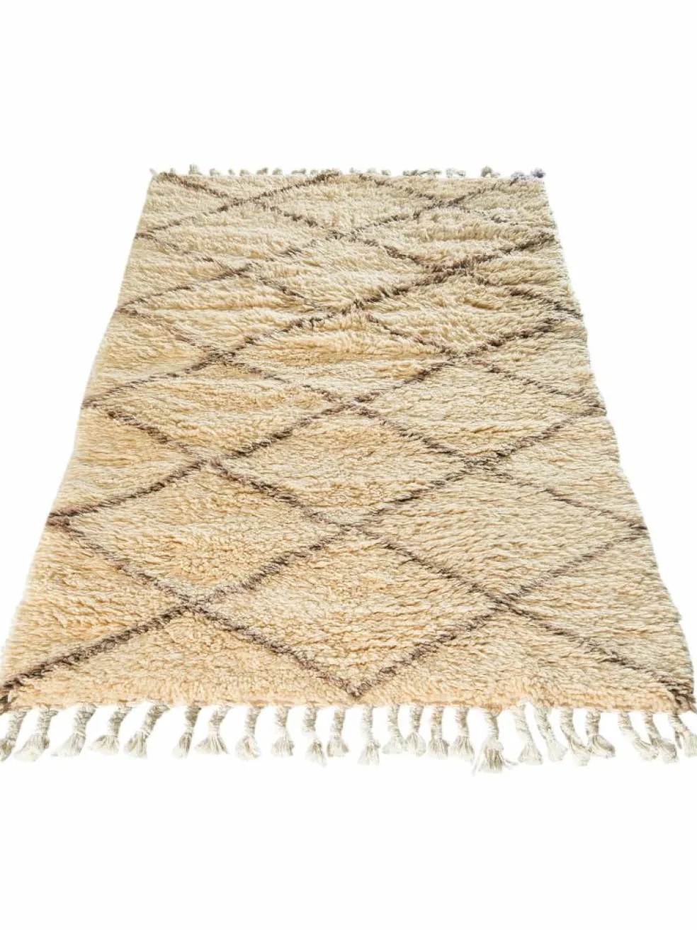 . Die Teppiche sind fast immer weißgrundig und zeichnen sich durch schwarze Zickzack-, Gitter- oder Rauten-Muster sowie einem wohnlich-zotteligen Flor aus. Kaum eine andere Teppichprovenienz passt mit ihren ursprünglichen nomadischen Designs besser in einen minimalistischen Wohnstil. Wie viele andere Nomadenteppiche auch, wurden dieBeni Ourain