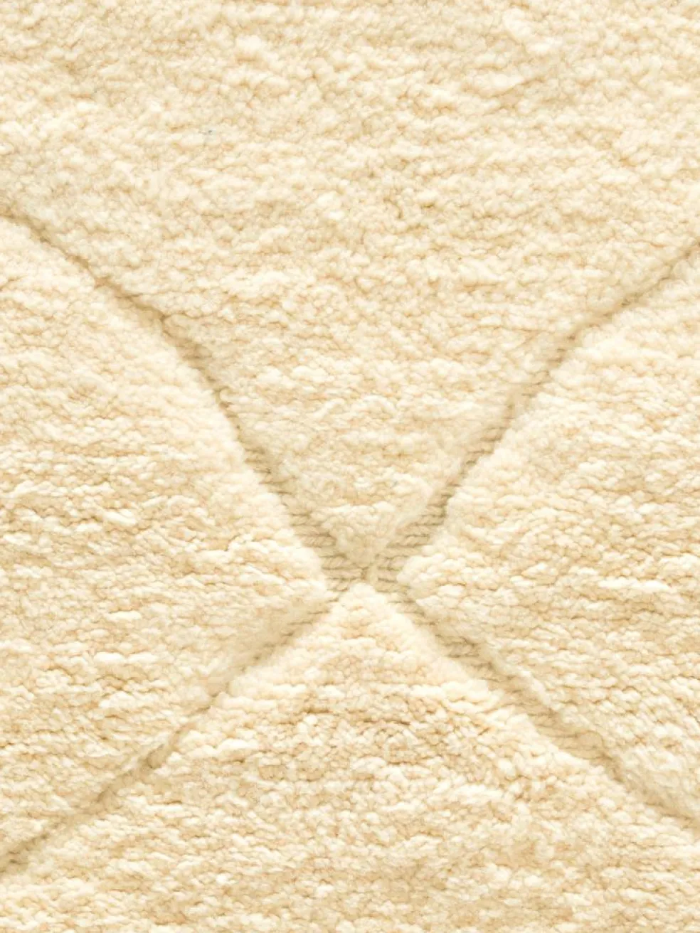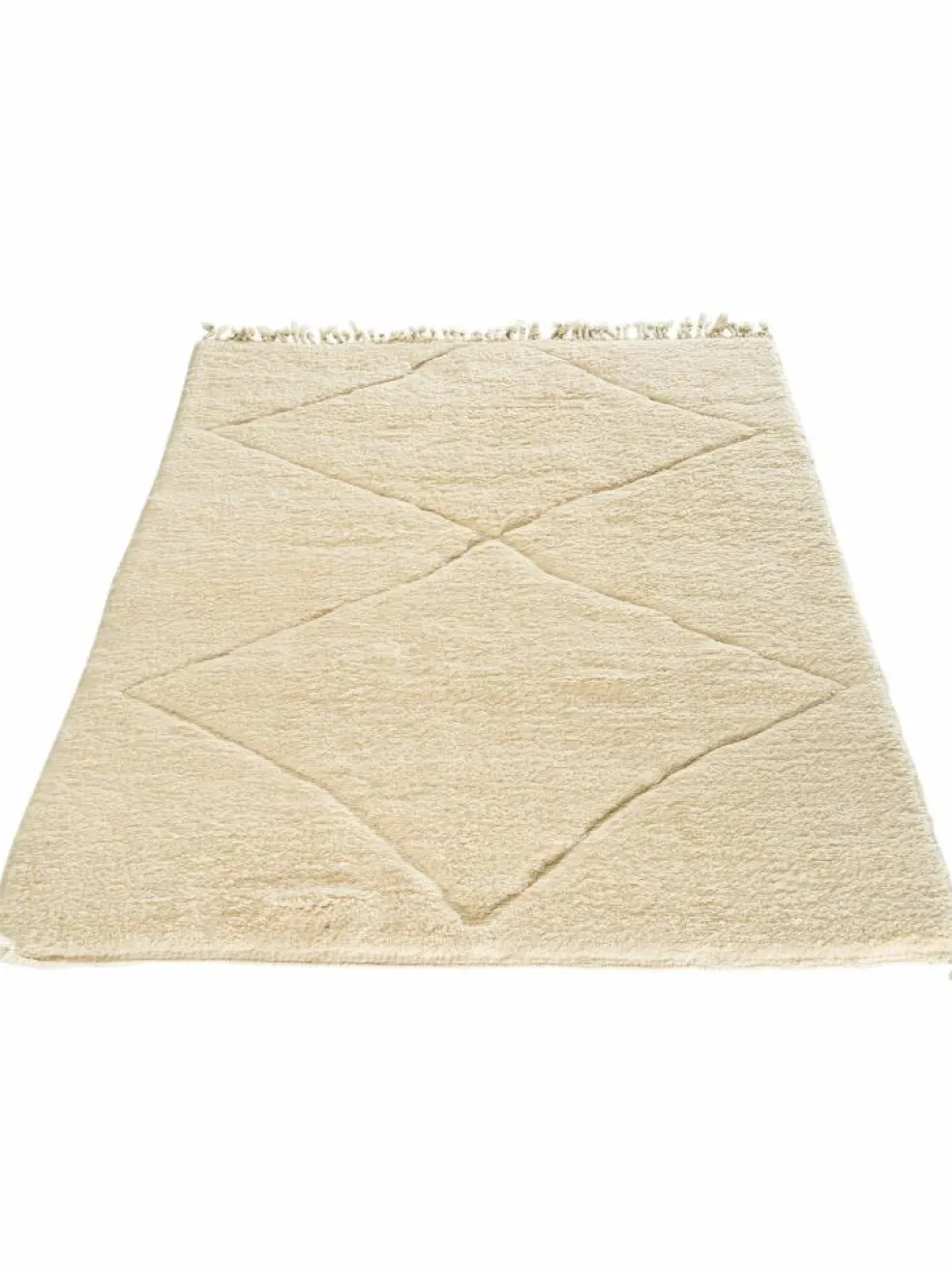 . Die Teppiche sind fast immer weißgrundig und zeichnen sich durch schwarze Zickzack-, Gitter- oder Rauten-Muster sowie einem wohnlich-zotteligen Flor aus. Kaum eine andere Teppichprovenienz passt mit ihren ursprünglichen nomadischen Designs besser in einen minimalistischen Wohnstil. Wie viele andere Nomadenteppiche auch, wurden dieBeni Ourain