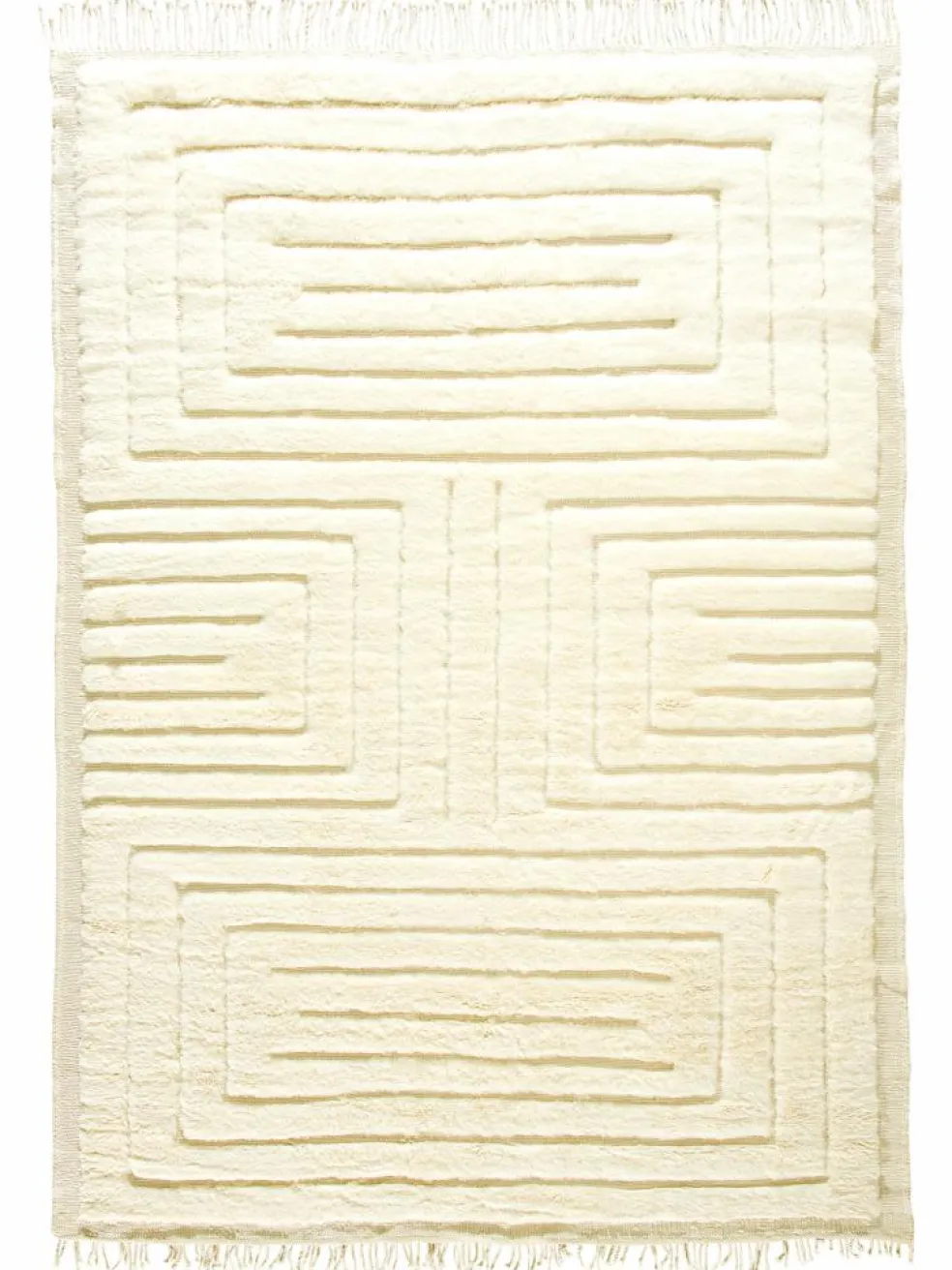. Die Teppiche sind fast immer weißgrundig und zeichnen sich durch schwarze Zickzack-, Gitter- oder Rauten-Muster sowie einem wohnlich-zotteligen Flor aus. Kaum eine andere Teppichprovenienz passt mit ihren ursprünglichen nomadischen Designs besser in einen minimalistischen Wohnstil. Wie viele andere Nomadenteppiche auch, wurden dieBeni Ourain