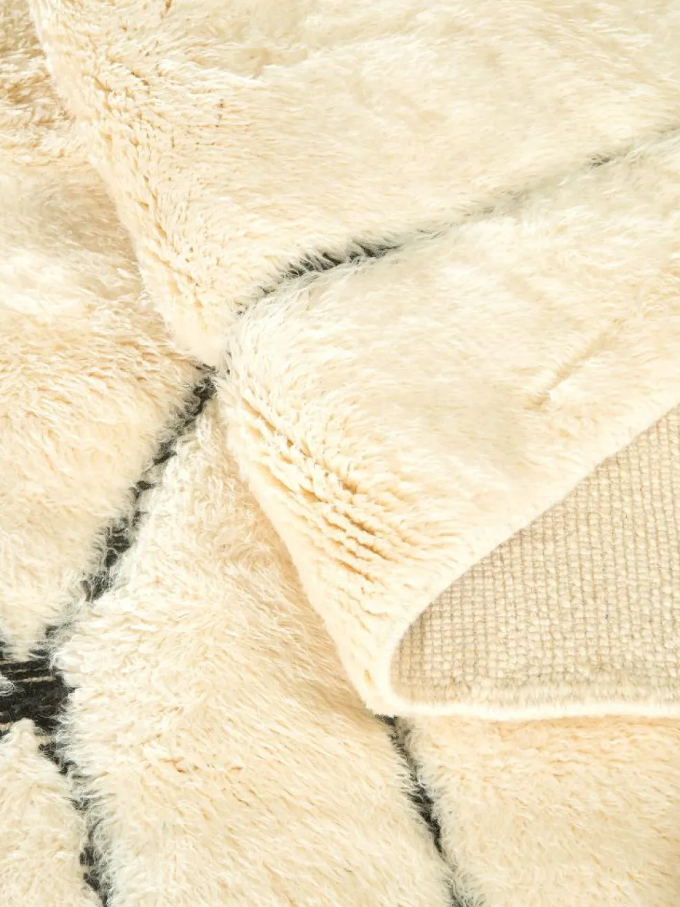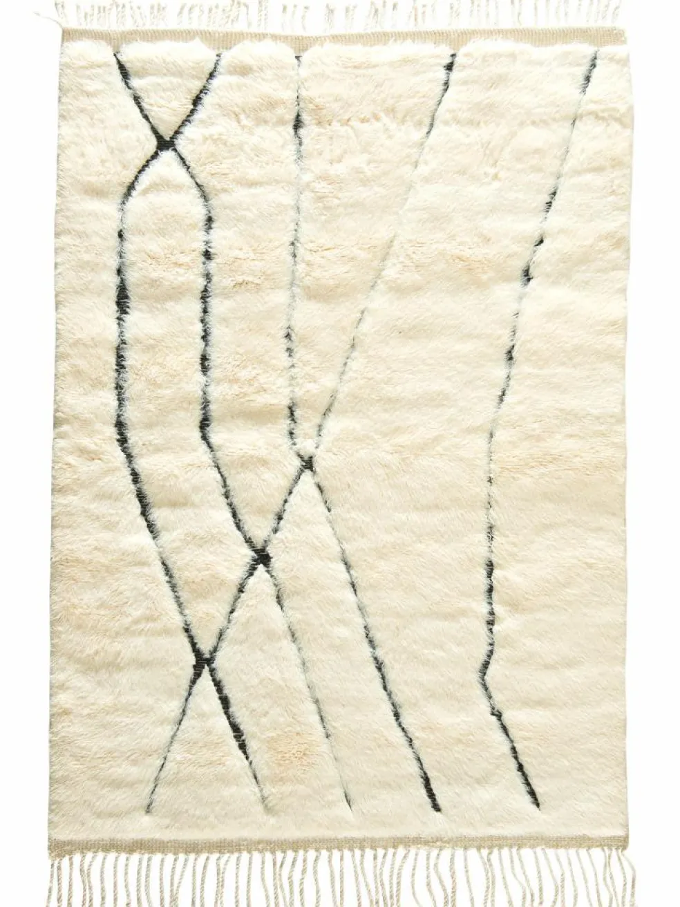 . Die Teppiche sind fast immer weißgrundig und zeichnen sich durch schwarze Zickzack-, Gitter- oder Rauten-Muster sowie einem wohnlich-zotteligen Flor aus. Kaum eine andere Teppichprovenienz passt mit ihren ursprünglichen nomadischen Designs besser in einen minimalistischen Wohnstil. Wie viele andere Nomadenteppiche auch, wurden dieBeni Ourain
