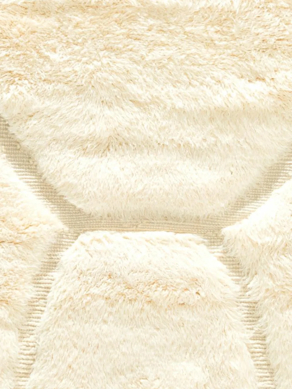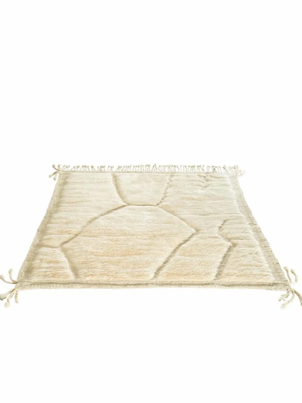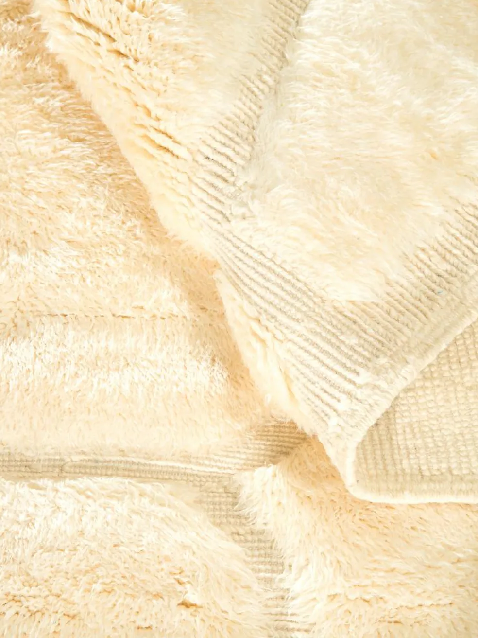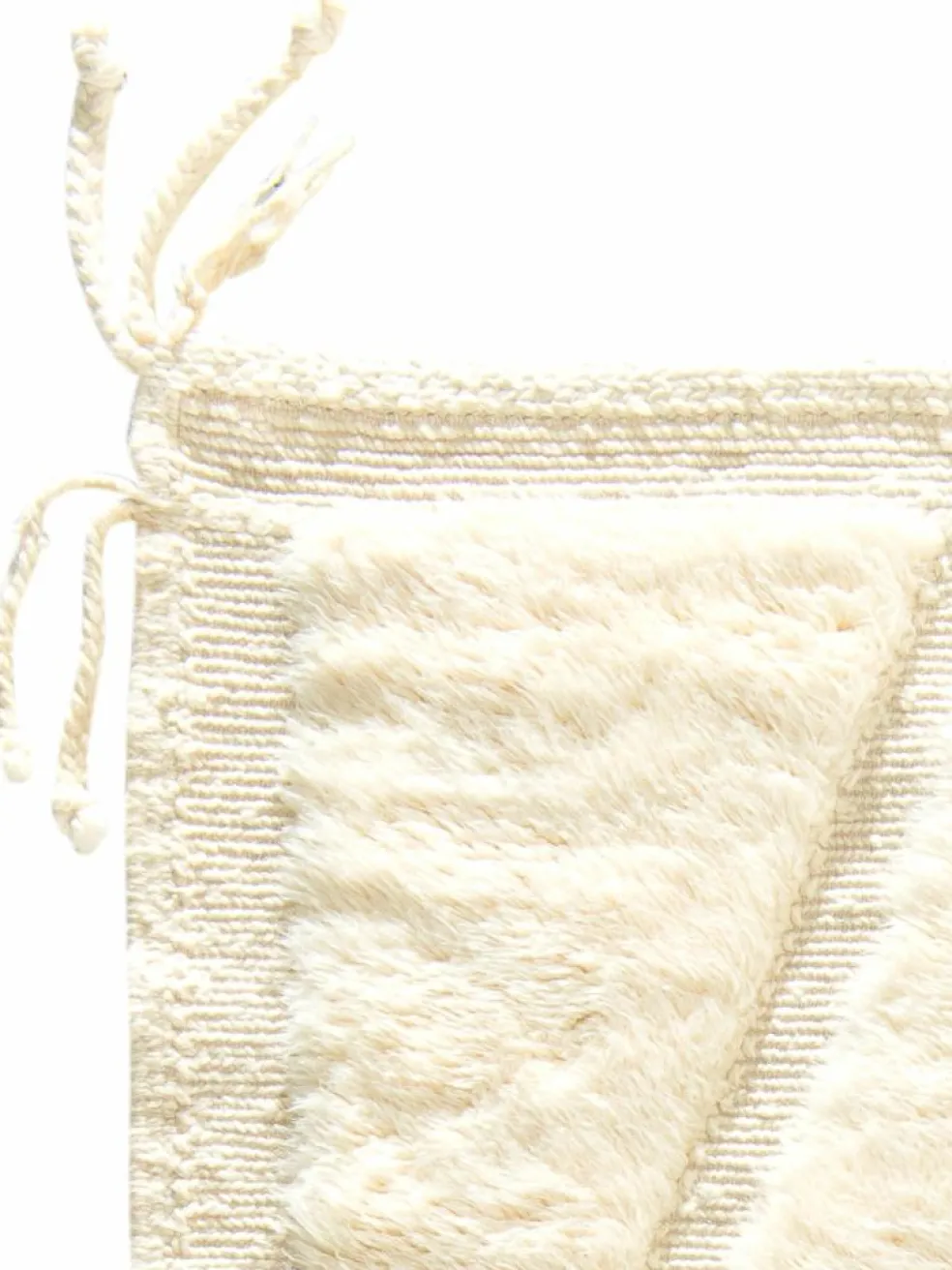 . Die Teppiche sind fast immer weißgrundig und zeichnen sich durch schwarze Zickzack-, Gitter- oder Rauten-Muster sowie einem wohnlich-zotteligen Flor aus. Kaum eine andere Teppichprovenienz passt mit ihren ursprünglichen nomadischen Designs besser in einen minimalistischen Wohnstil. Wie viele andere Nomadenteppiche auch, wurden dieBeni Ourain