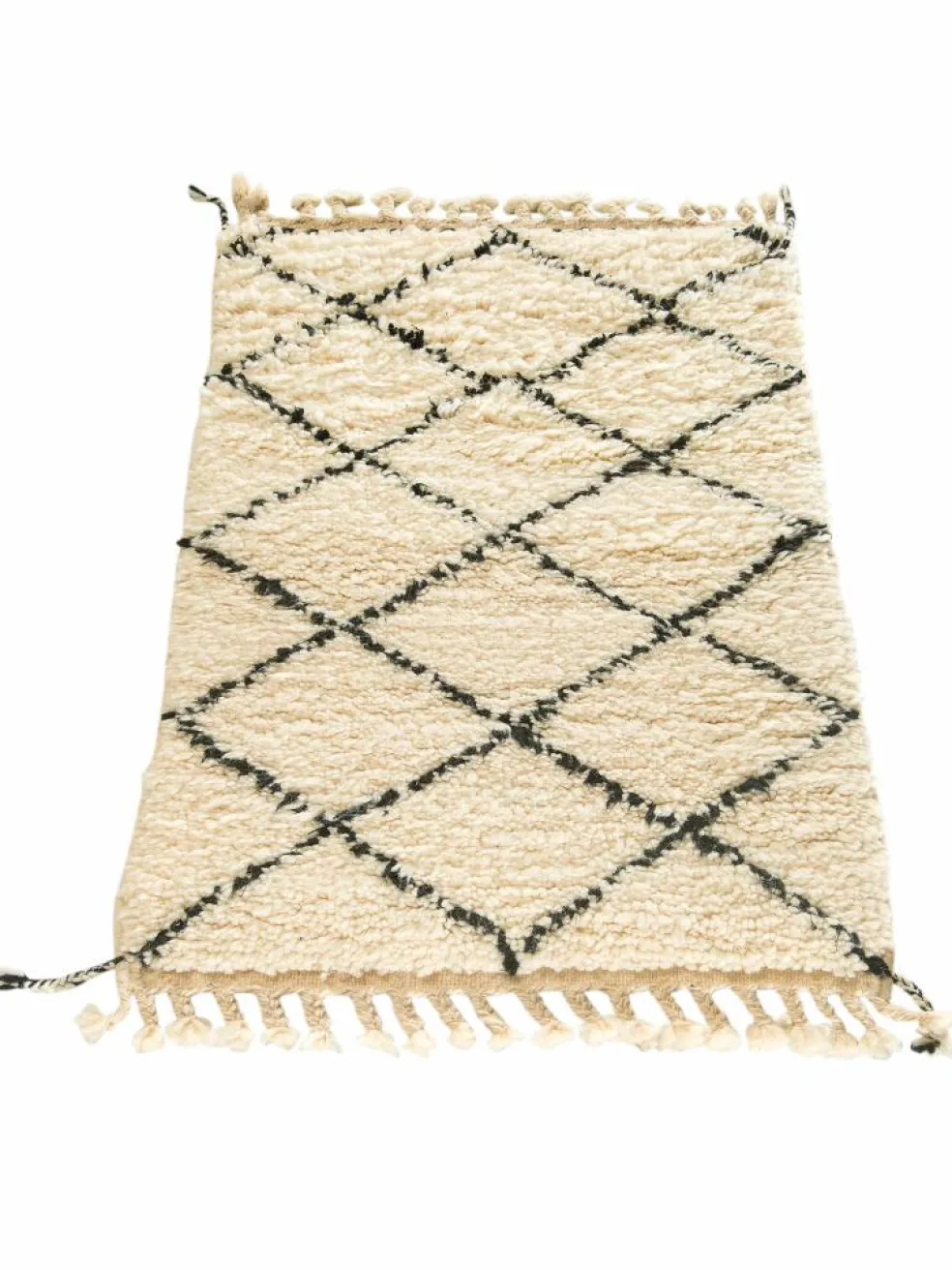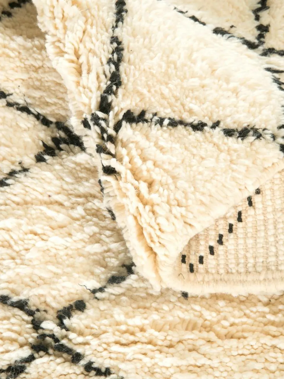 . Die Teppiche sind fast immer weißgrundig und zeichnen sich durch schwarze Zickzack-, Gitter- oder Rauten-Muster sowie einem wohnlich-zotteligen Flor aus. Kaum eine andere Teppichprovenienz passt mit ihren ursprünglichen nomadischen Designs besser in einen minimalistischen Wohnstil. Wie viele andere Nomadenteppiche auch, wurden dieBeni Ourain
