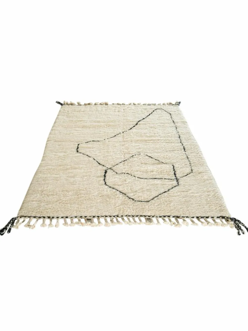 . Die Teppiche sind fast immer weißgrundig und zeichnen sich durch schwarze Zickzack-, Gitter- oder Rauten-Muster sowie einem wohnlich-zotteligen Flor aus. Kaum eine andere Teppichprovenienz passt mit ihren ursprünglichen nomadischen Designs besser in einen minimalistischen Wohnstil. Wie viele andere Nomadenteppiche auch, wurden dieBeni Ourain