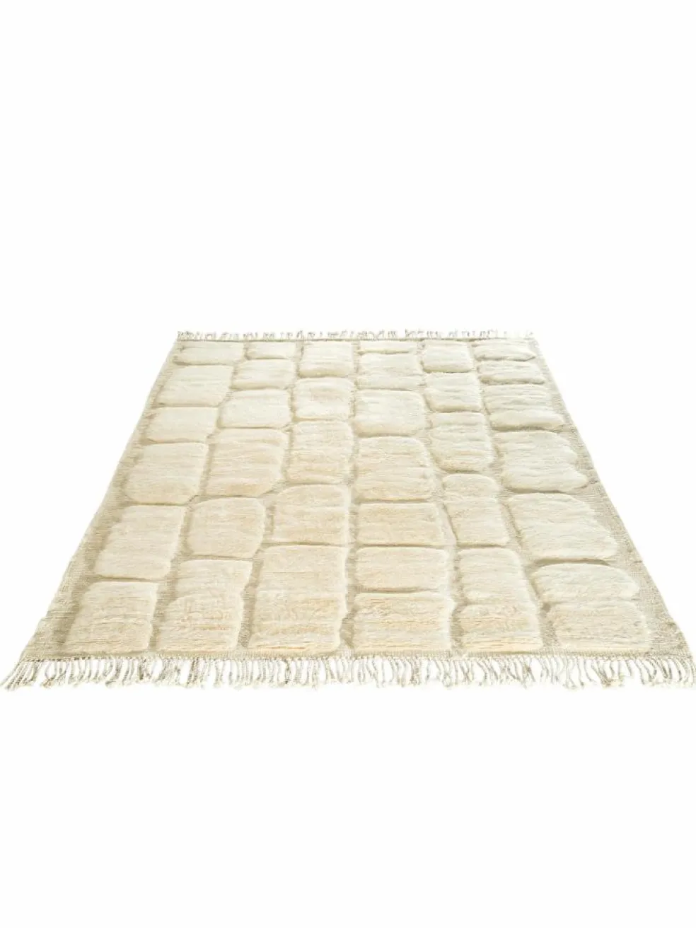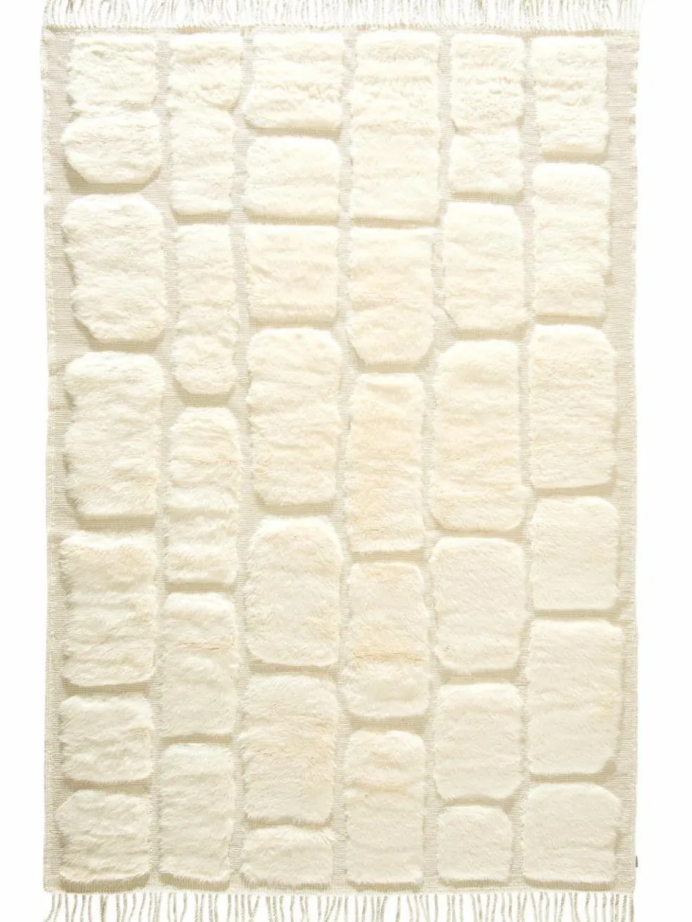 . Die Teppiche sind fast immer weißgrundig und zeichnen sich durch schwarze Zickzack-, Gitter- oder Rauten-Muster sowie einem wohnlich-zotteligen Flor aus. Kaum eine andere Teppichprovenienz passt mit ihren ursprünglichen nomadischen Designs besser in einen minimalistischen Wohnstil. Wie viele andere Nomadenteppiche auch, wurden dieBeni Ourain