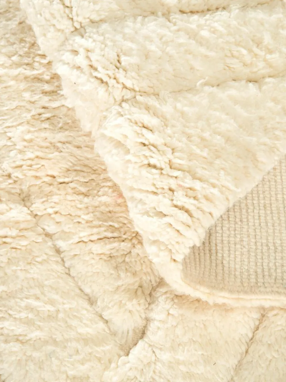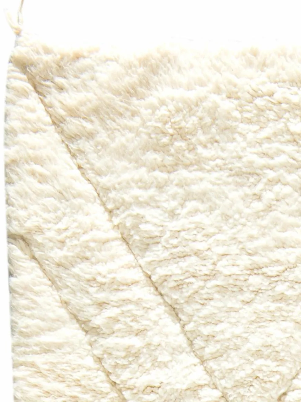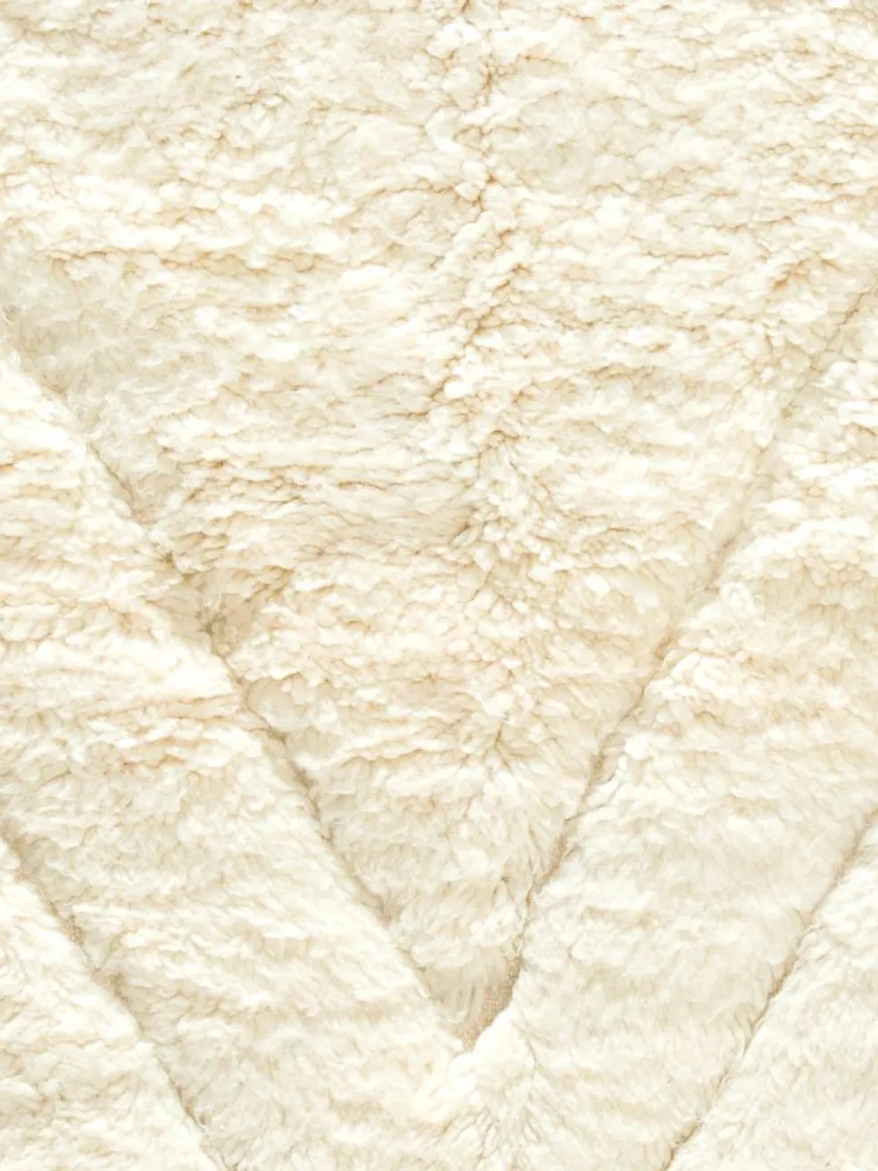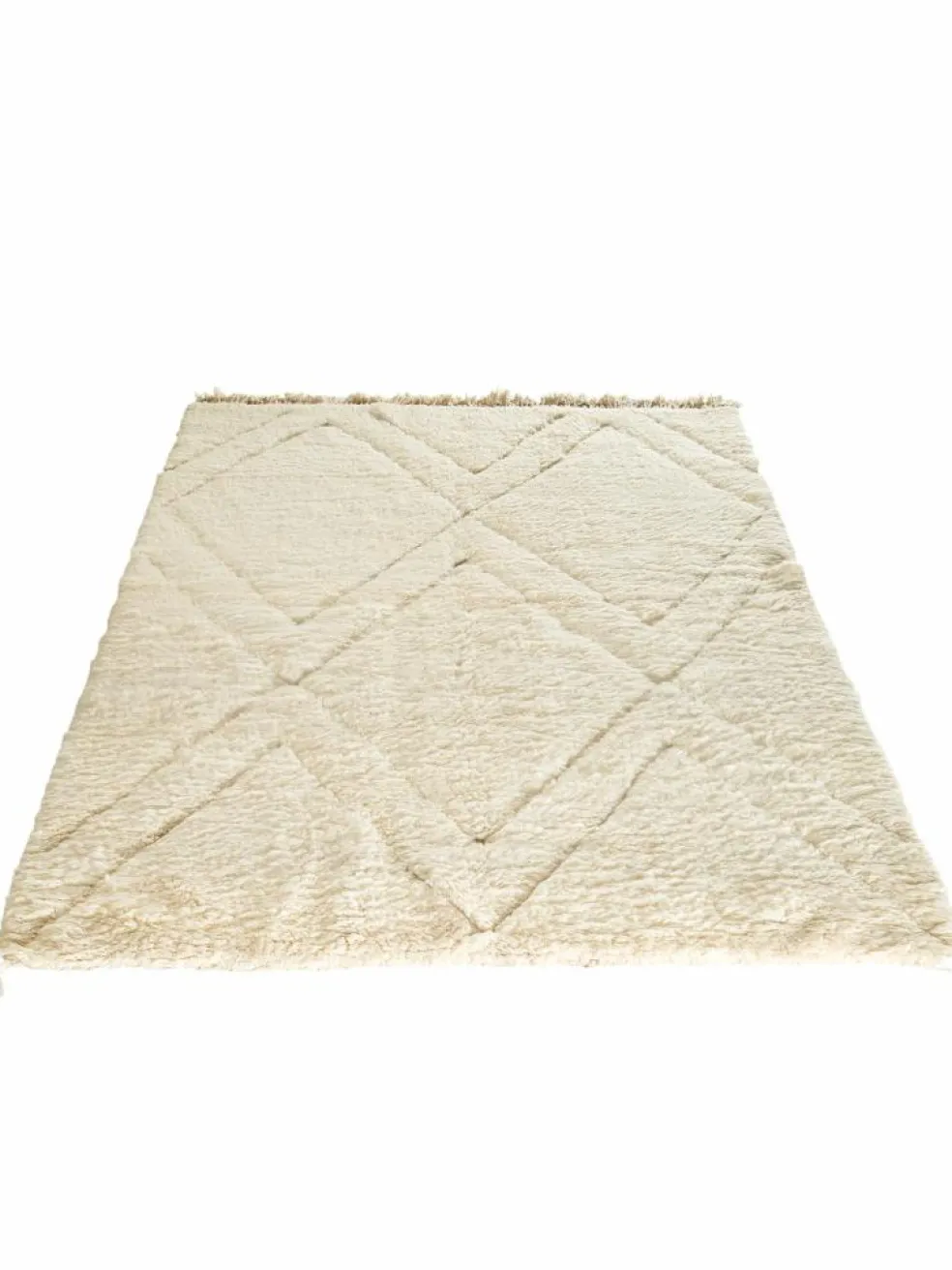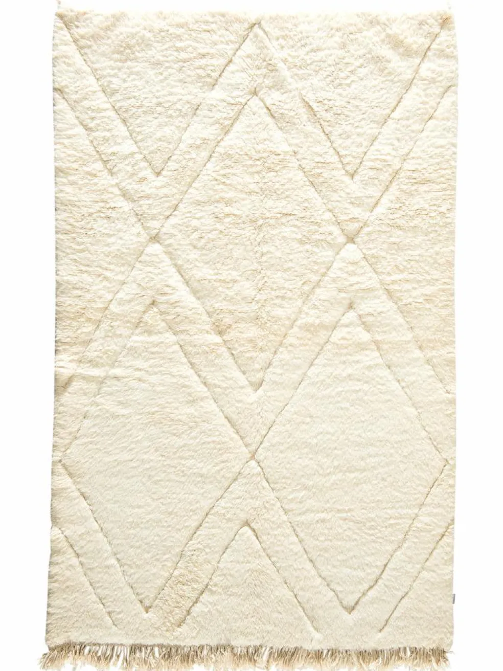 . Die Teppiche sind fast immer weißgrundig und zeichnen sich durch schwarze Zickzack-, Gitter- oder Rauten-Muster sowie einem wohnlich-zotteligen Flor aus. Kaum eine andere Teppichprovenienz passt mit ihren ursprünglichen nomadischen Designs besser in einen minimalistischen Wohnstil. Wie viele andere Nomadenteppiche auch, wurden dieBeni Ourain