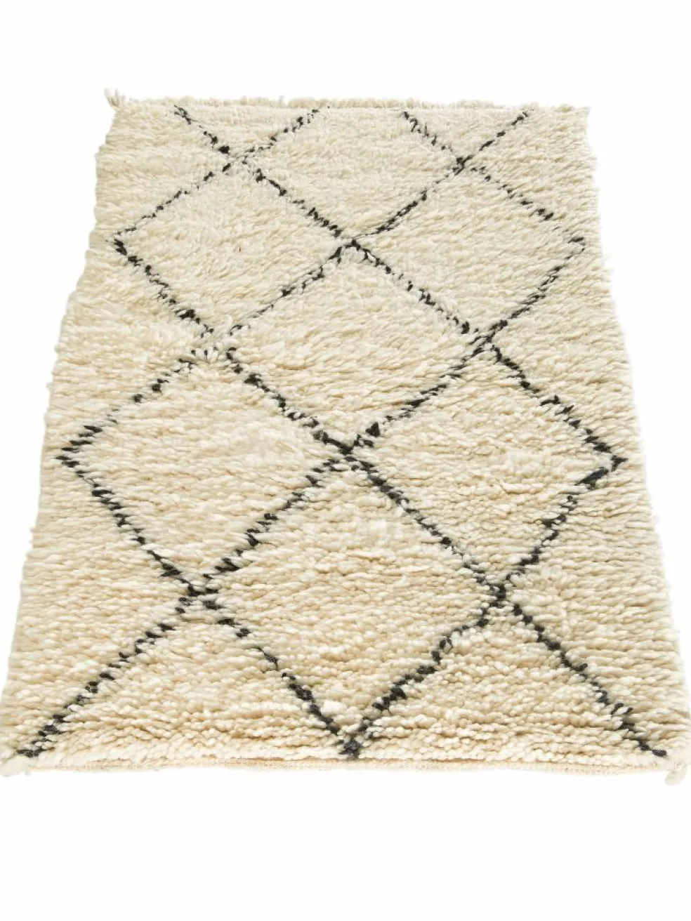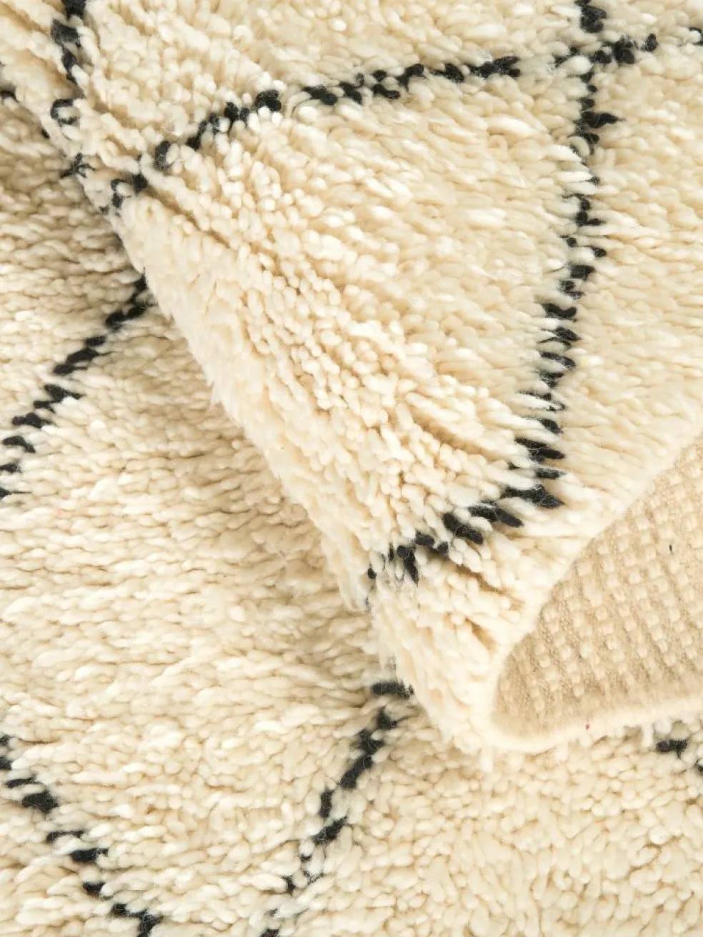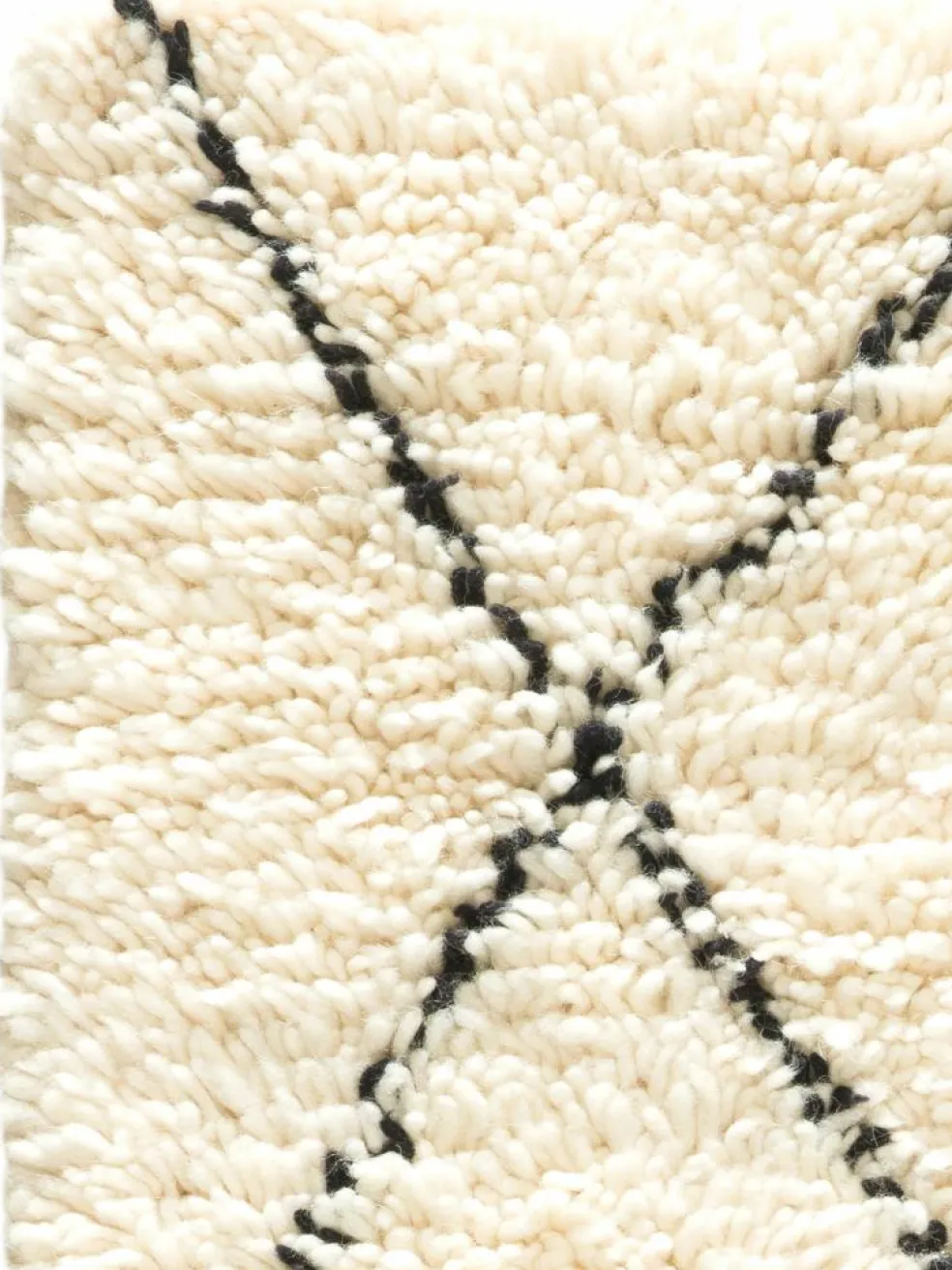 . Die Teppiche sind fast immer weißgrundig und zeichnen sich durch schwarze Zickzack-, Gitter- oder Rauten-Muster sowie einem wohnlich-zotteligen Flor aus. Kaum eine andere Teppichprovenienz passt mit ihren ursprünglichen nomadischen Designs besser in einen minimalistischen Wohnstil. Wie viele andere Nomadenteppiche auch, wurden dieBeni Ourain