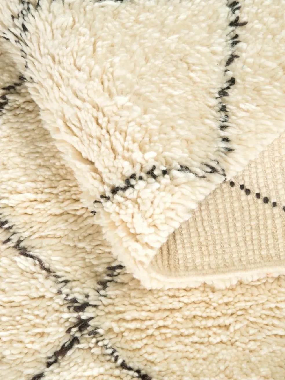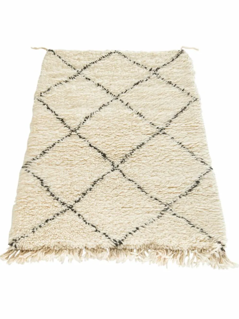 . Die Teppiche sind fast immer weißgrundig und zeichnen sich durch schwarze Zickzack-, Gitter- oder Rauten-Muster sowie einem wohnlich-zotteligen Flor aus. Kaum eine andere Teppichprovenienz passt mit ihren ursprünglichen nomadischen Designs besser in einen minimalistischen Wohnstil. Wie viele andere Nomadenteppiche auch, wurden dieBeni Ourain