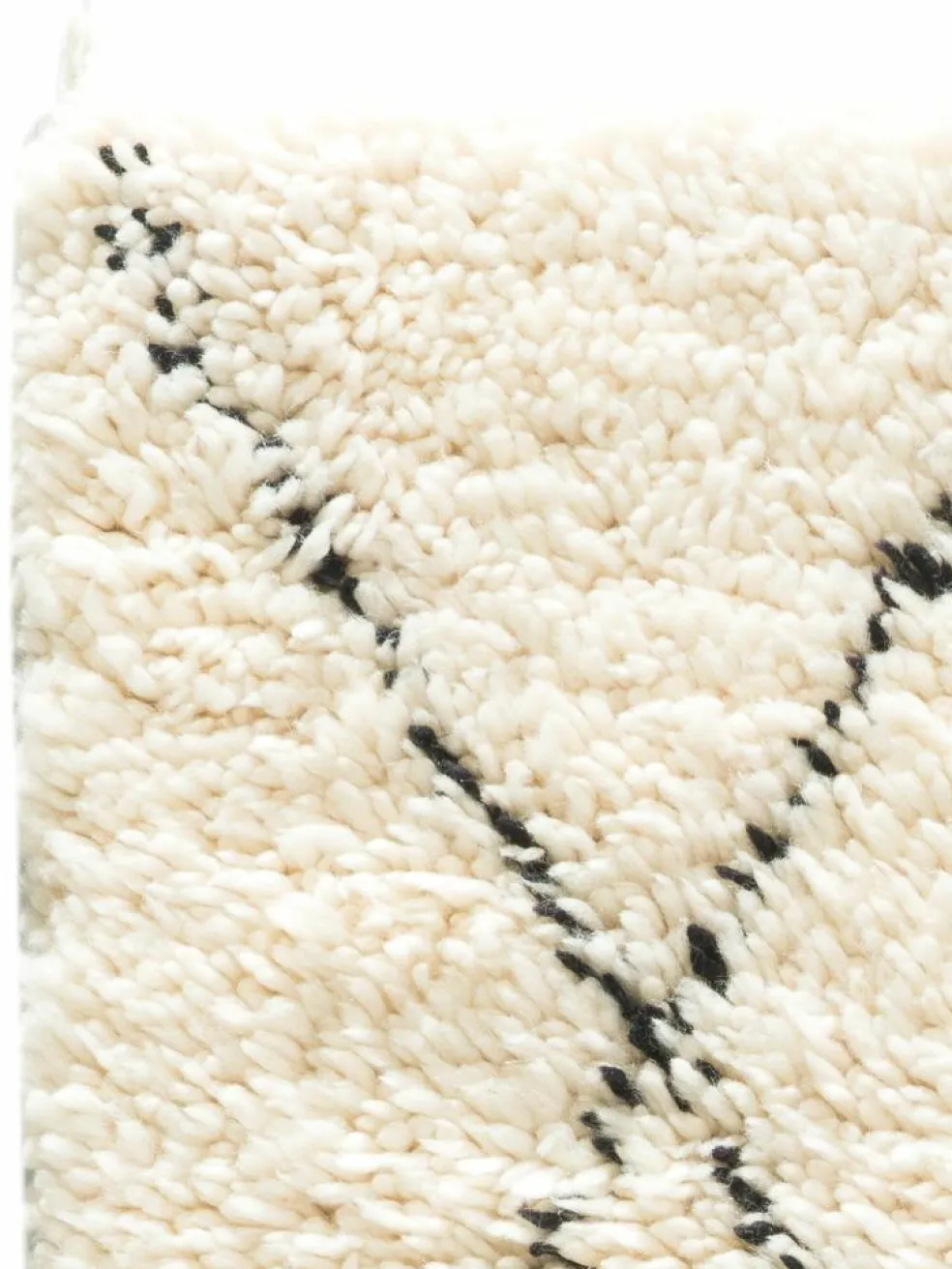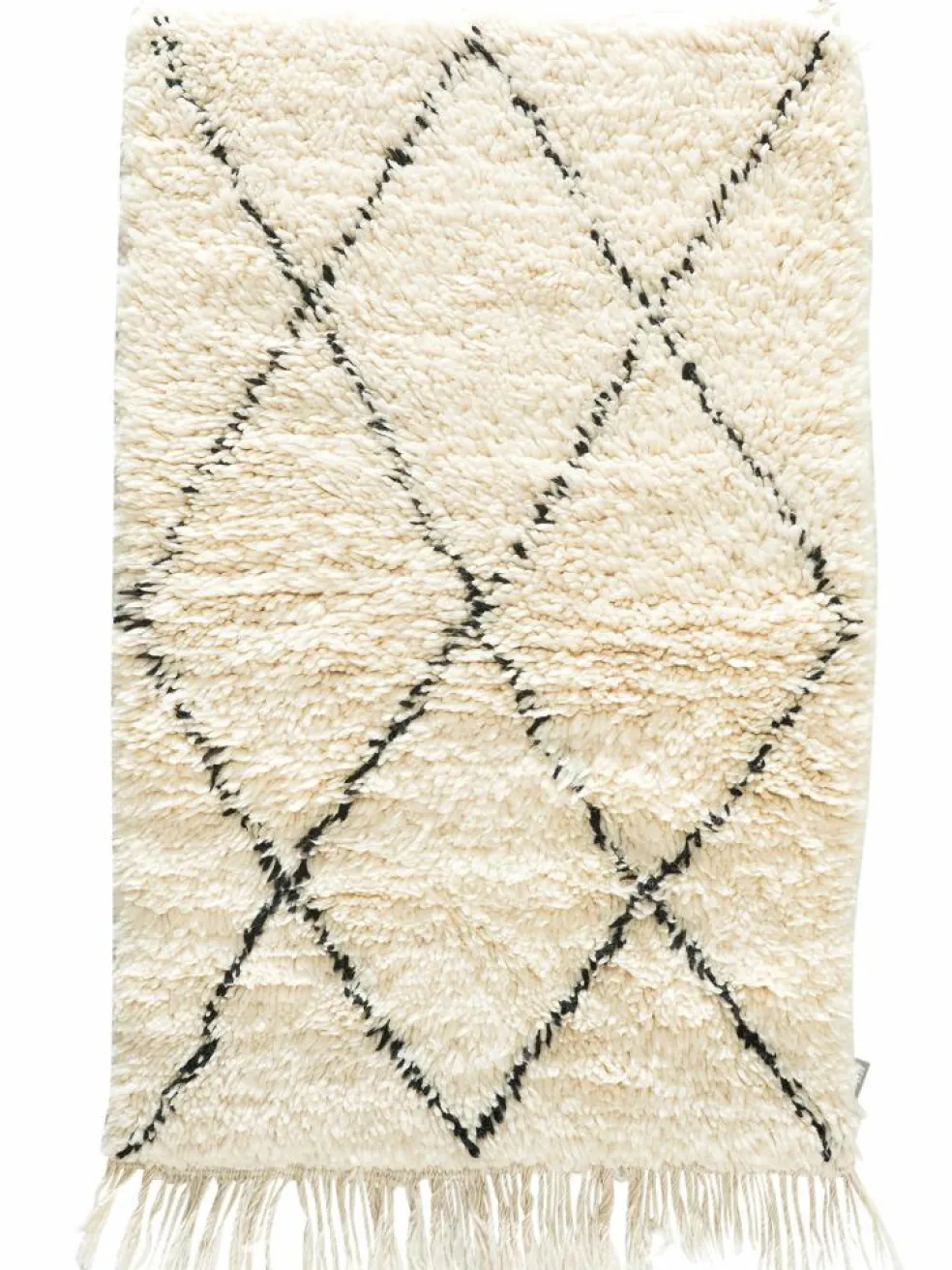 . Die Teppiche sind fast immer weißgrundig und zeichnen sich durch schwarze Zickzack-, Gitter- oder Rauten-Muster sowie einem wohnlich-zotteligen Flor aus. Kaum eine andere Teppichprovenienz passt mit ihren ursprünglichen nomadischen Designs besser in einen minimalistischen Wohnstil. Wie viele andere Nomadenteppiche auch, wurden dieBeni Ourain