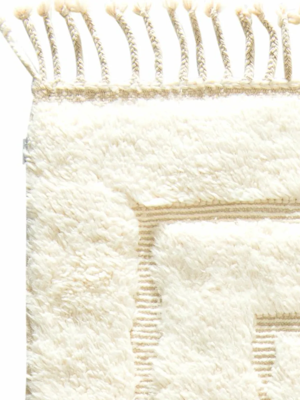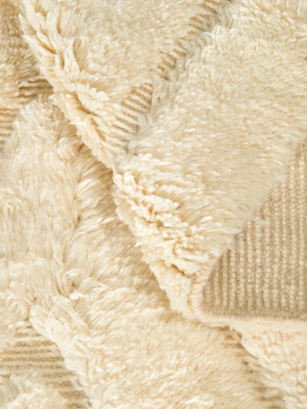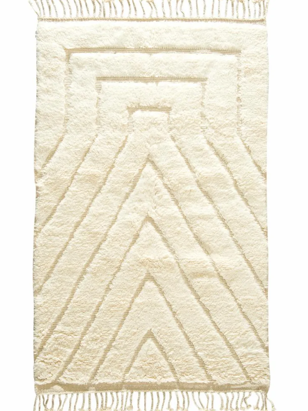 . Die Teppiche sind fast immer weißgrundig und zeichnen sich durch schwarze Zickzack-, Gitter- oder Rauten-Muster sowie einem wohnlich-zotteligen Flor aus. Kaum eine andere Teppichprovenienz passt mit ihren ursprünglichen nomadischen Designs besser in einen minimalistischen Wohnstil. Wie viele andere Nomadenteppiche auch, wurden dieBeni Ourain