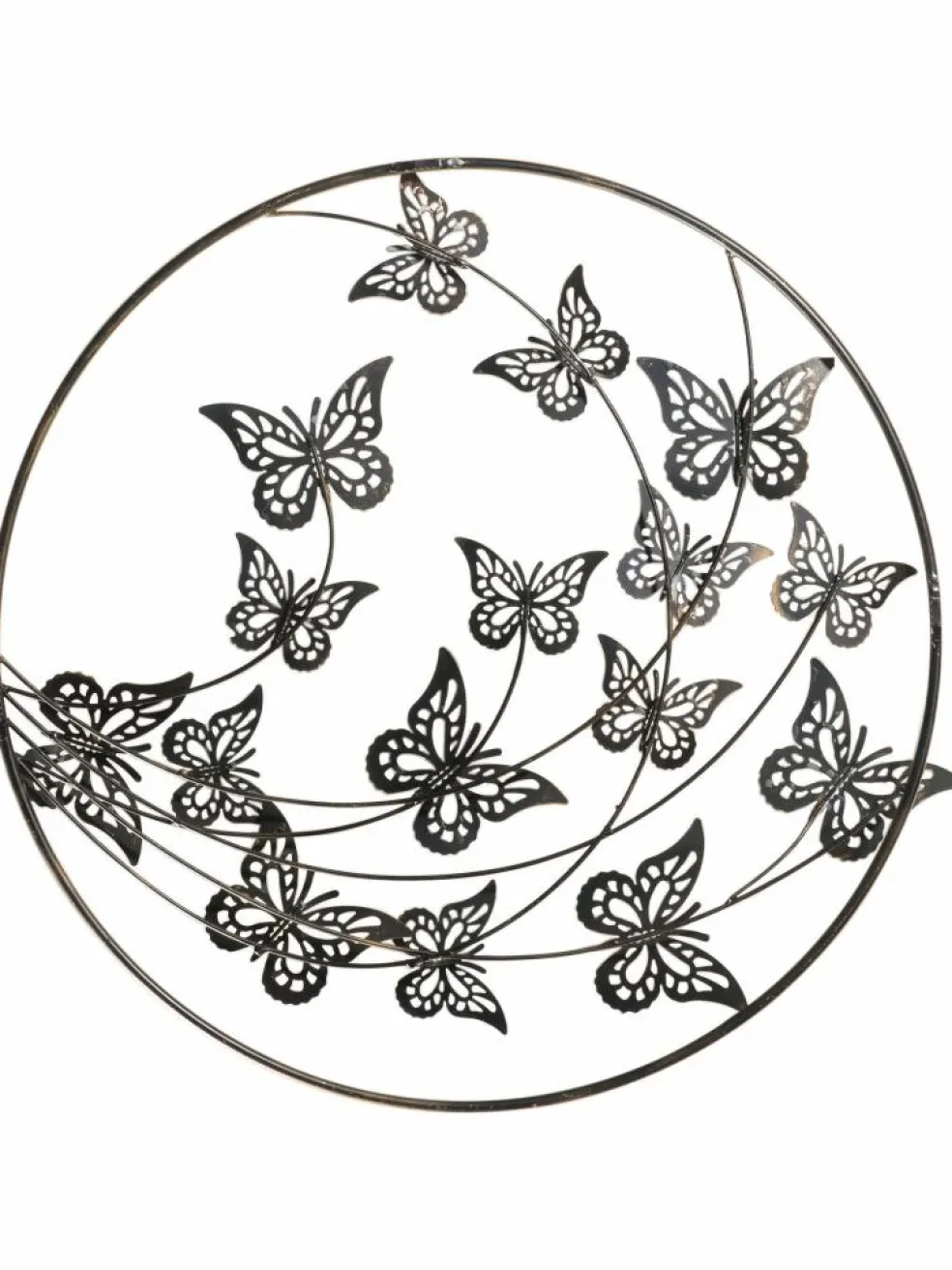 Ein bunter Schwarm Schmetterlinge! Aus Metall gefertigtes rundes Wandobjekt. Ca. 64,5 x 21,5 x 64,5 cm groß.