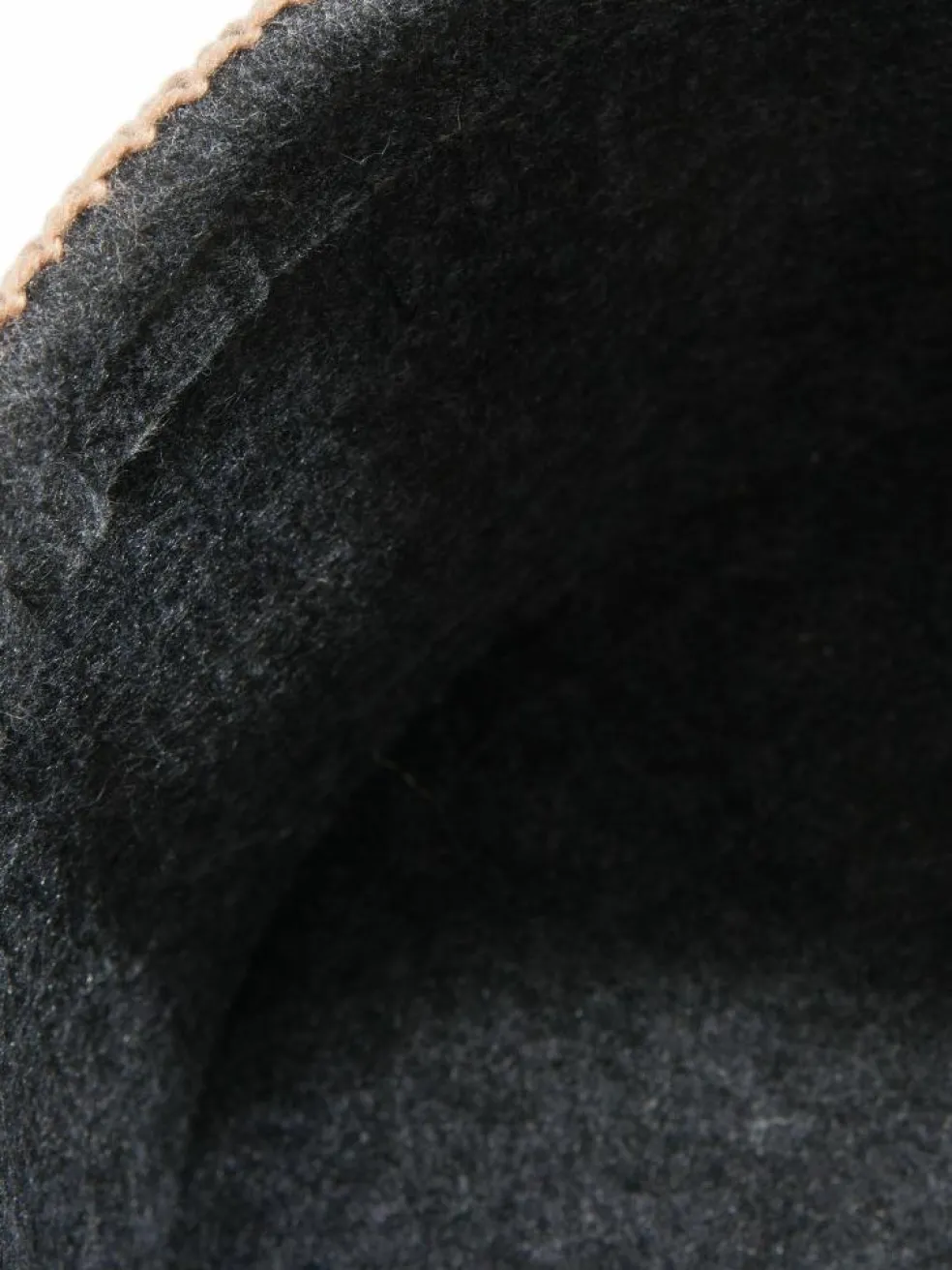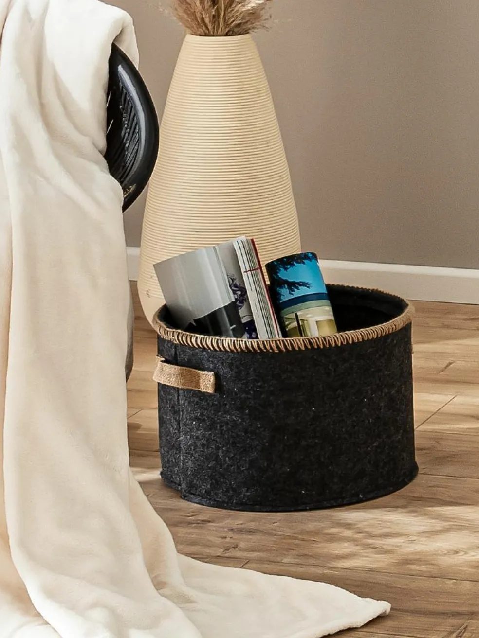 Runder Korb aus Filz mit Jute-Griffen und geketteltem Rand.