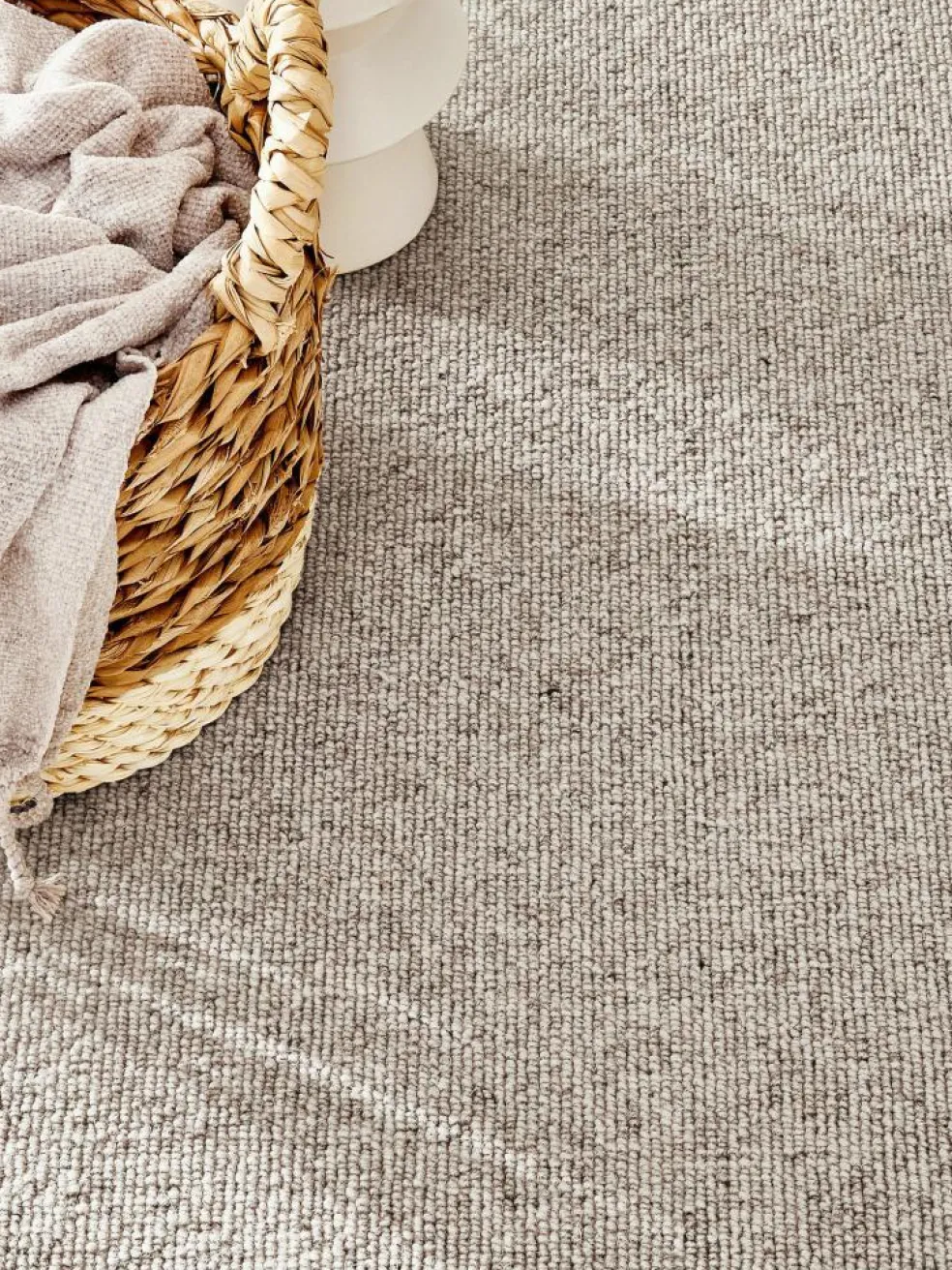 Klassischer, naturfarbener schwerer Woll-Teppichboden mit dezenter Zeichnung. Gesamtgewicht ca. 1670 g pro m². Höhe ca. 7 mm. Flor 100 %
