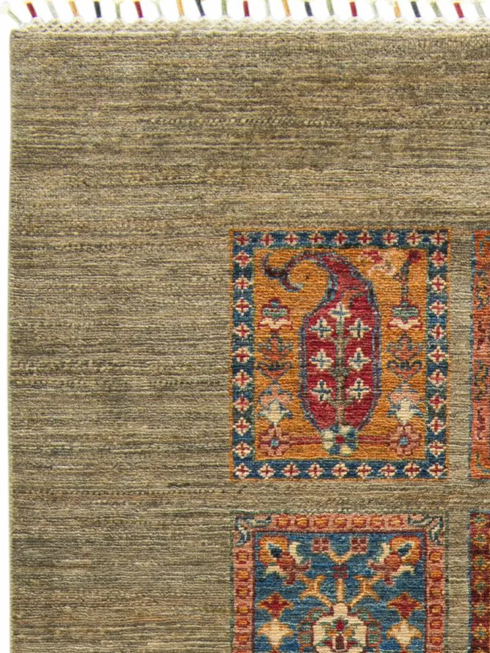 mit bunten Fäden zusammen gebunden. Durch den flachen und festen Flor ist der Teppich unempfindlich gegenüber den Belastungen des Alltags.| Gesamthöhe: | ca. 6 mm |