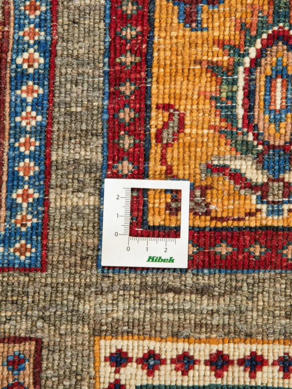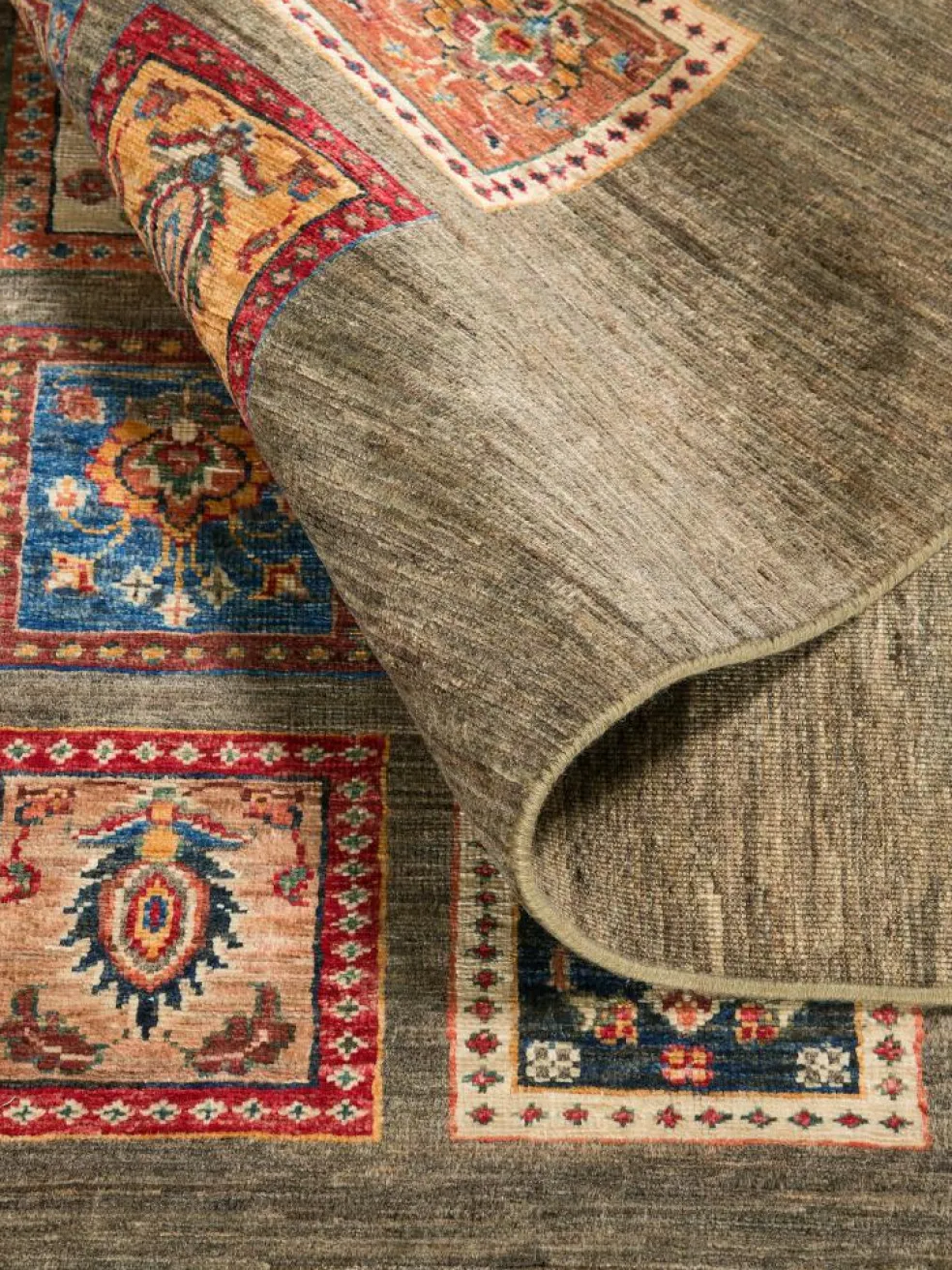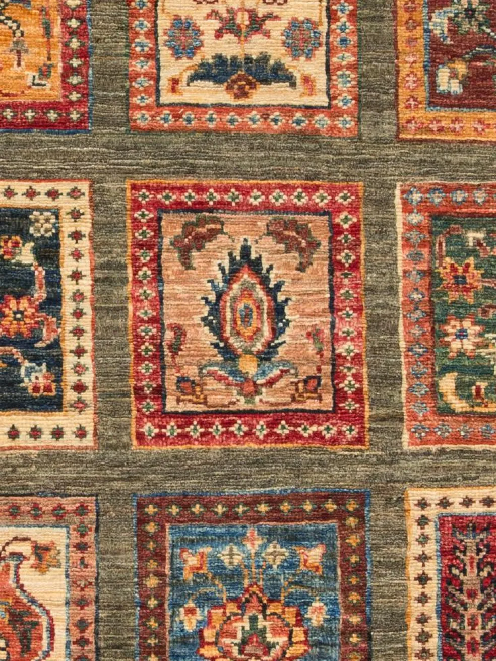 erinnert an einen üppig bewachsenen Garten mit geometrisch gegliederten, einzeln eingefassten Beeten zwischen denen die Bewässerungsgräben verlaufen. Durch den flachen und festen Flor ist der Teppich unempfindlich gegenüber den Belastungen des Alltags. – Das Besondere an diesemOrientteppich