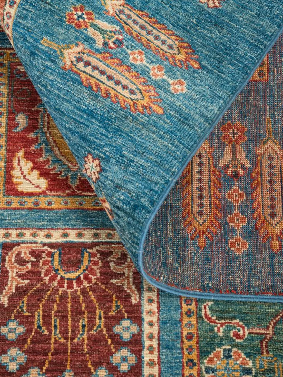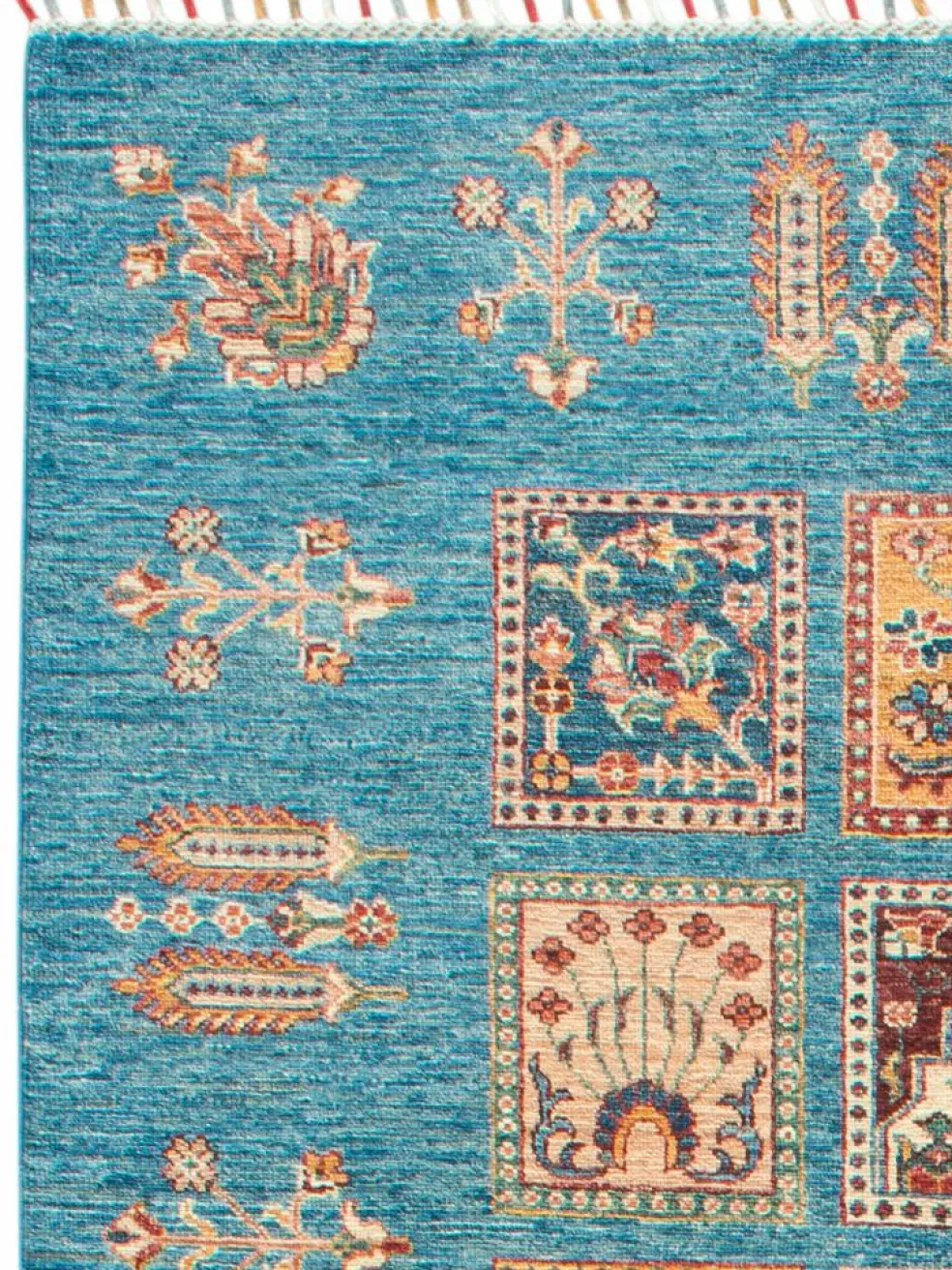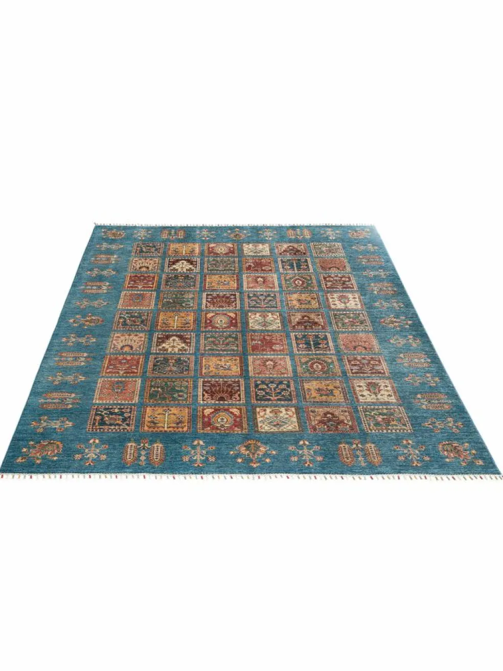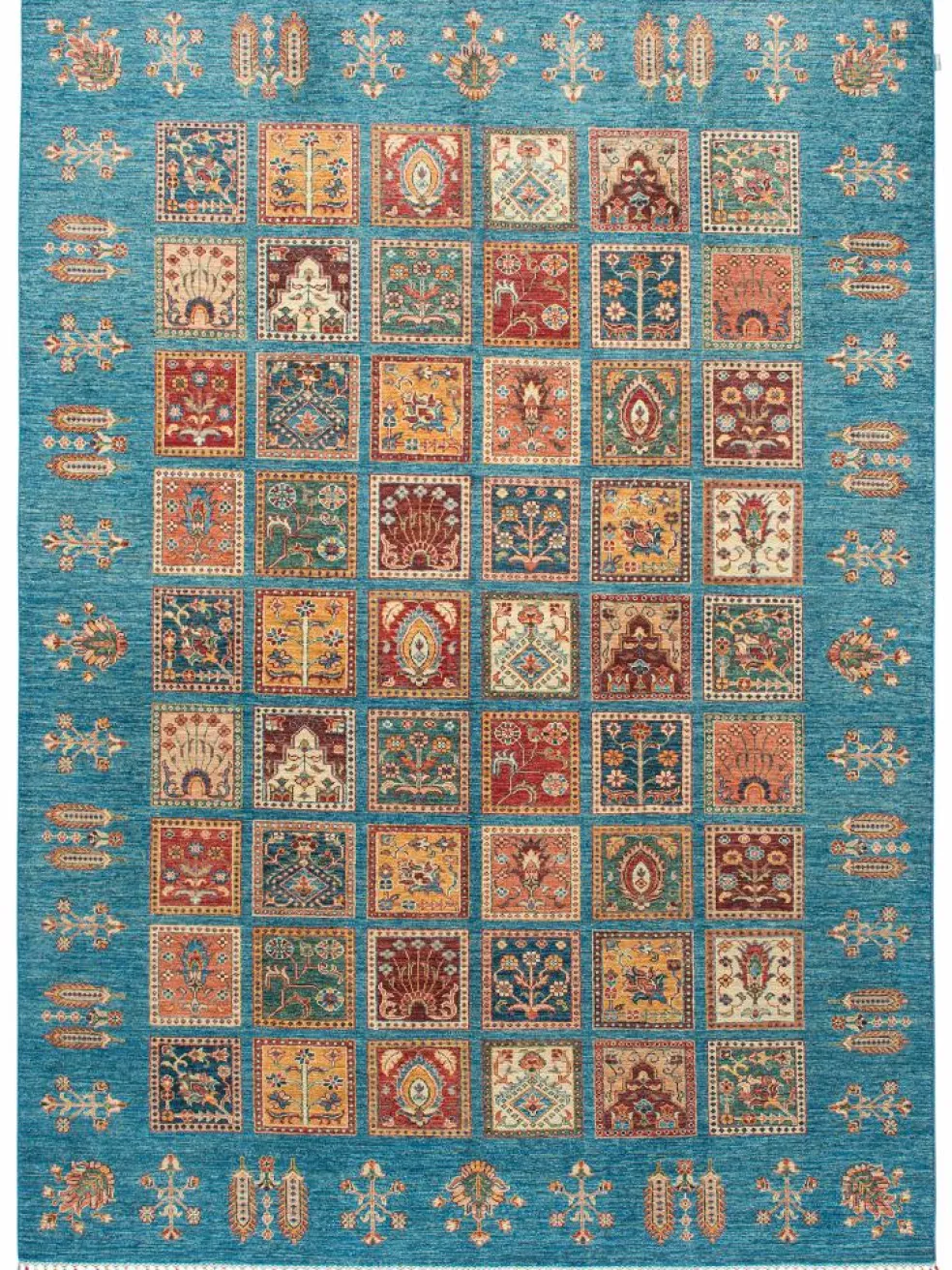 erinnert an einen üppig bewachsenen Garten mit geometrisch gegliederten, einzeln eingefassten Beeten zwischen denen die Bewässerungsgräben verlaufen. Durch den flachen und festen Flor ist der Teppich unempfindlich gegenüber den Belastungen des Alltags.- Das Besondere an diesemOrientteppich