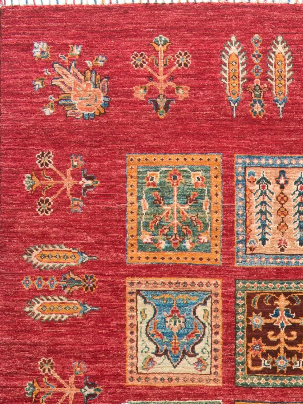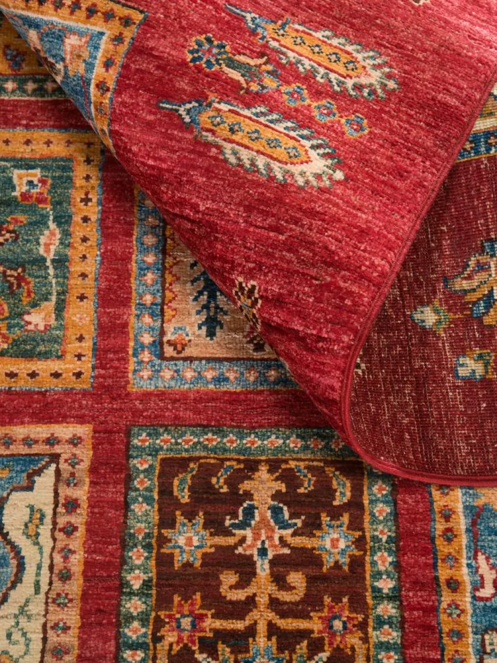 erinnert an einen üppig bewachsenen Garten mit geometrisch gegliederten, einzeln eingefassten Beeten zwischen denen die Bewässerungsgräben verlaufen. Durch den flachen und festen Flor ist der Teppich unempfindlich gegenüber den Belastungen des Alltags.- Das Besondere an diesemOrientteppich