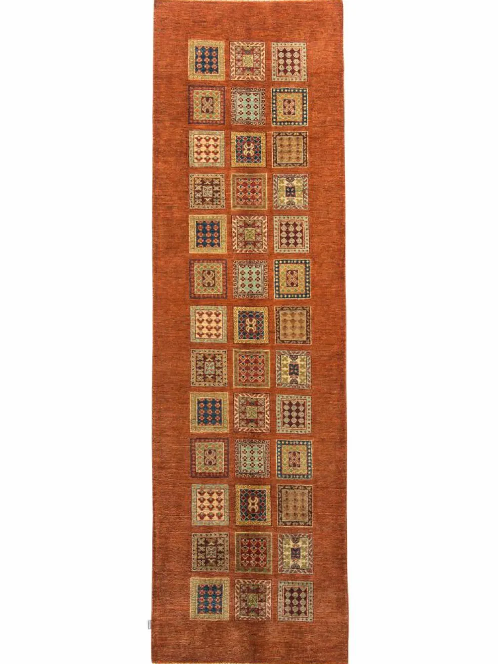 erinnert an einen üppig bewachsenen Garten mit geometrisch gegliederten, einzeln eingefassten Beeten zwischen denen die Bewässerungsgräben verlaufen. Durch den flachen und festen Flor ist der Teppich unempfindlich gegenüber den Belastungen des Alltags.- Das Besondere an diesemOrientteppich