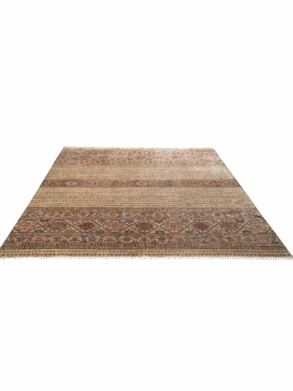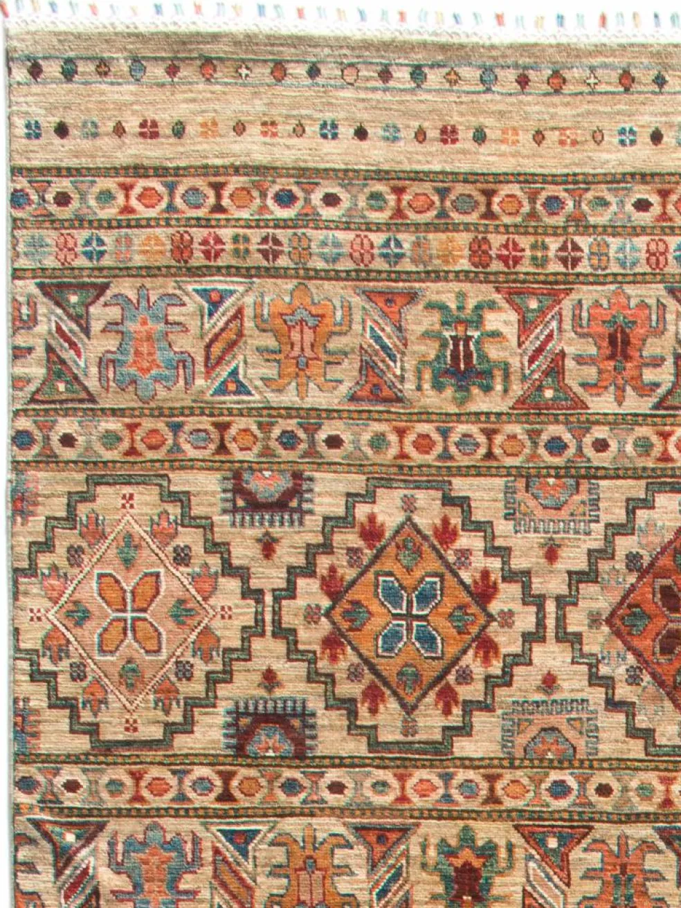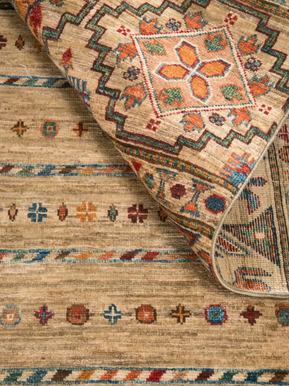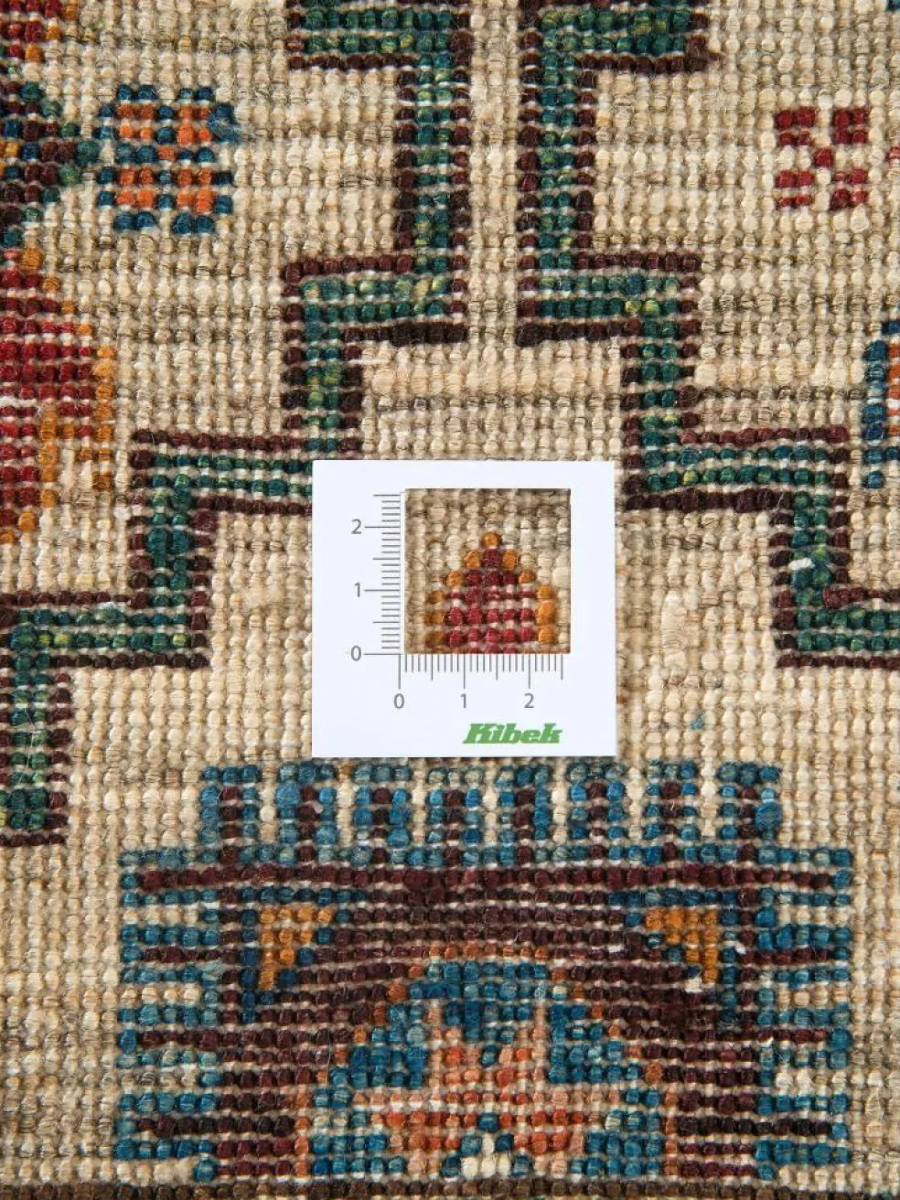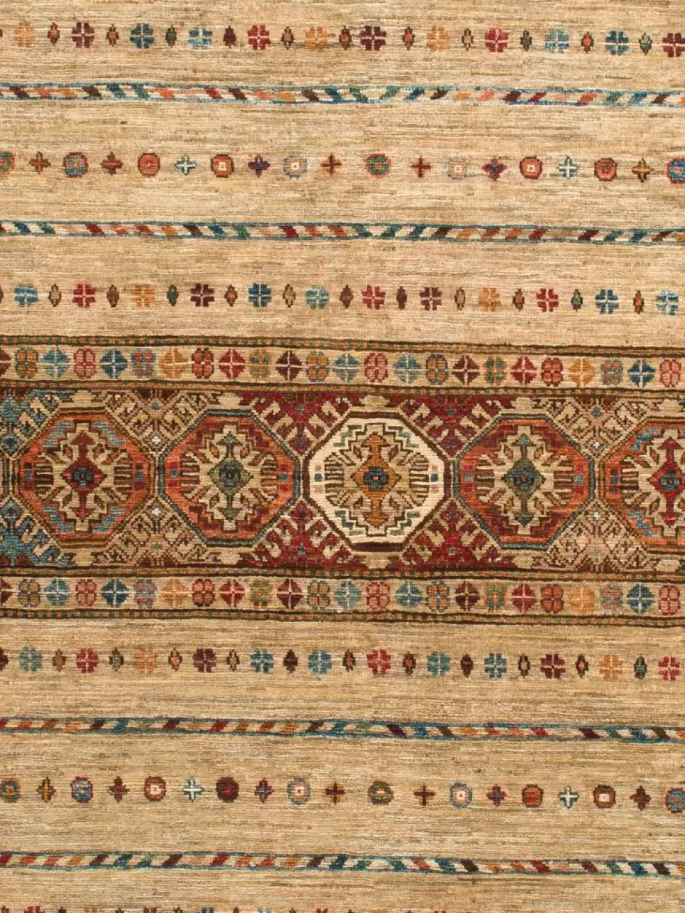 -Muster sind bunte Längsstreifen mit vielen verschiedenen Motiven gefüllt. Durch den flachen und festen Flor ist der Teppich unempfindlich gegenüber den Belastungen des Alltags.- Das Besondere an diesemOrientteppich