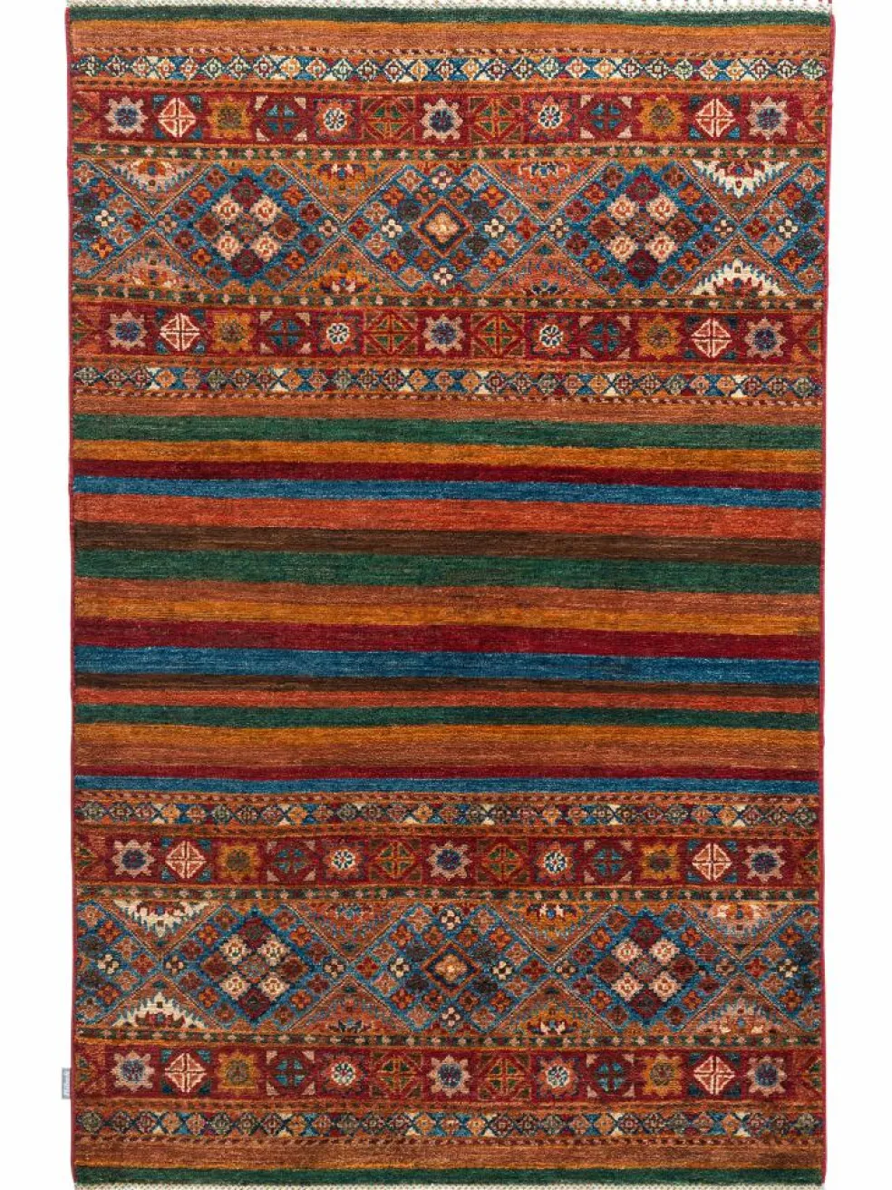 -Muster sind bunte Längsstreifen mit vielen verschiedenen Motiven gefüllt. Durch den flachen und festen Flor ist der Teppich unempfindlich gegenüber den Belastungen des Alltags.- Das Besondere an diesemOrientteppich
