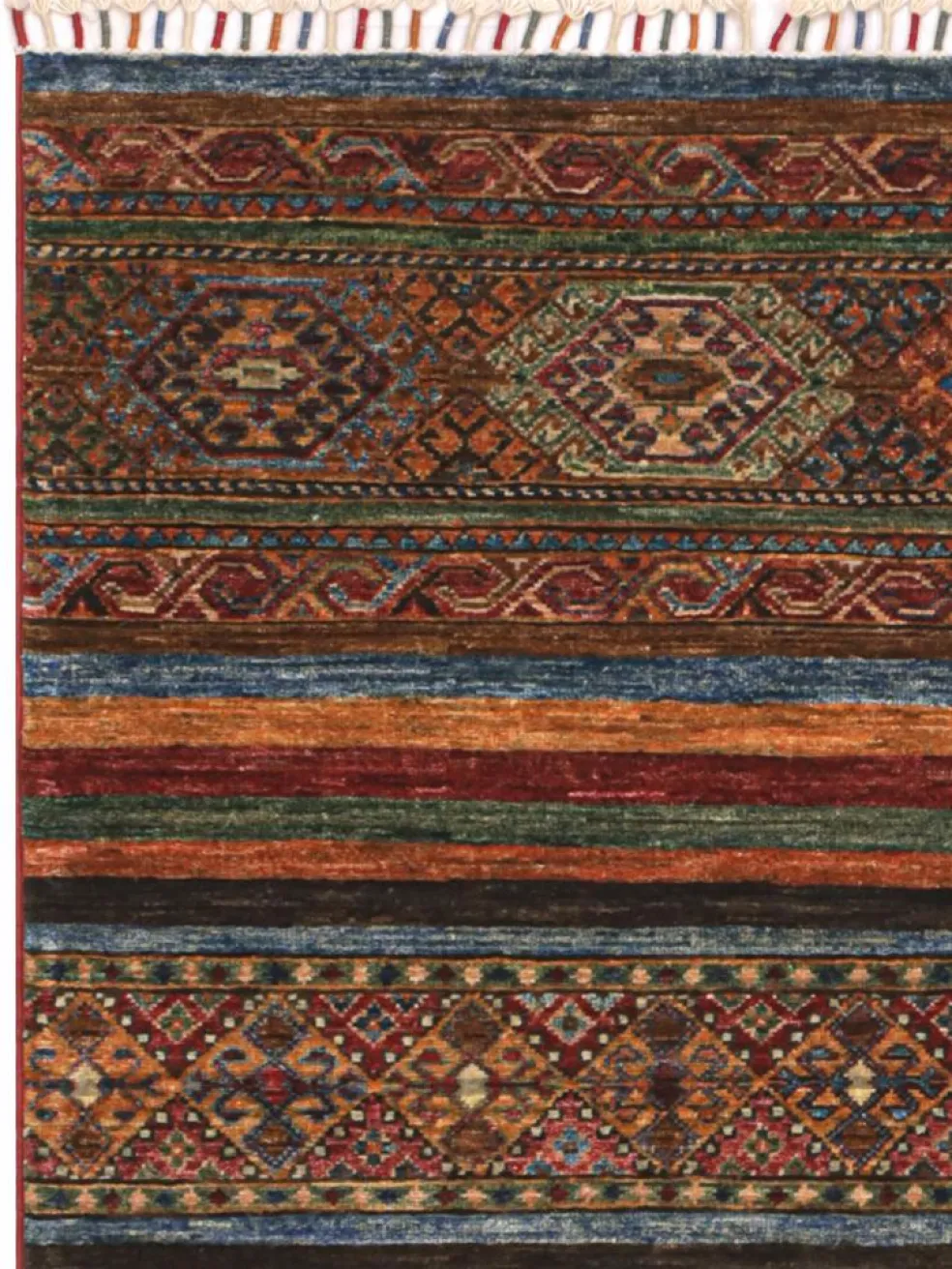 -Muster sind bunte Längsstreifen mit vielen verschiedenen Motiven gefüllt. Durch den flachen und festen Flor ist der Teppich unempfindlich gegenüber den Belastungen des Alltags. – Das Besondere an diesemOrientteppich
