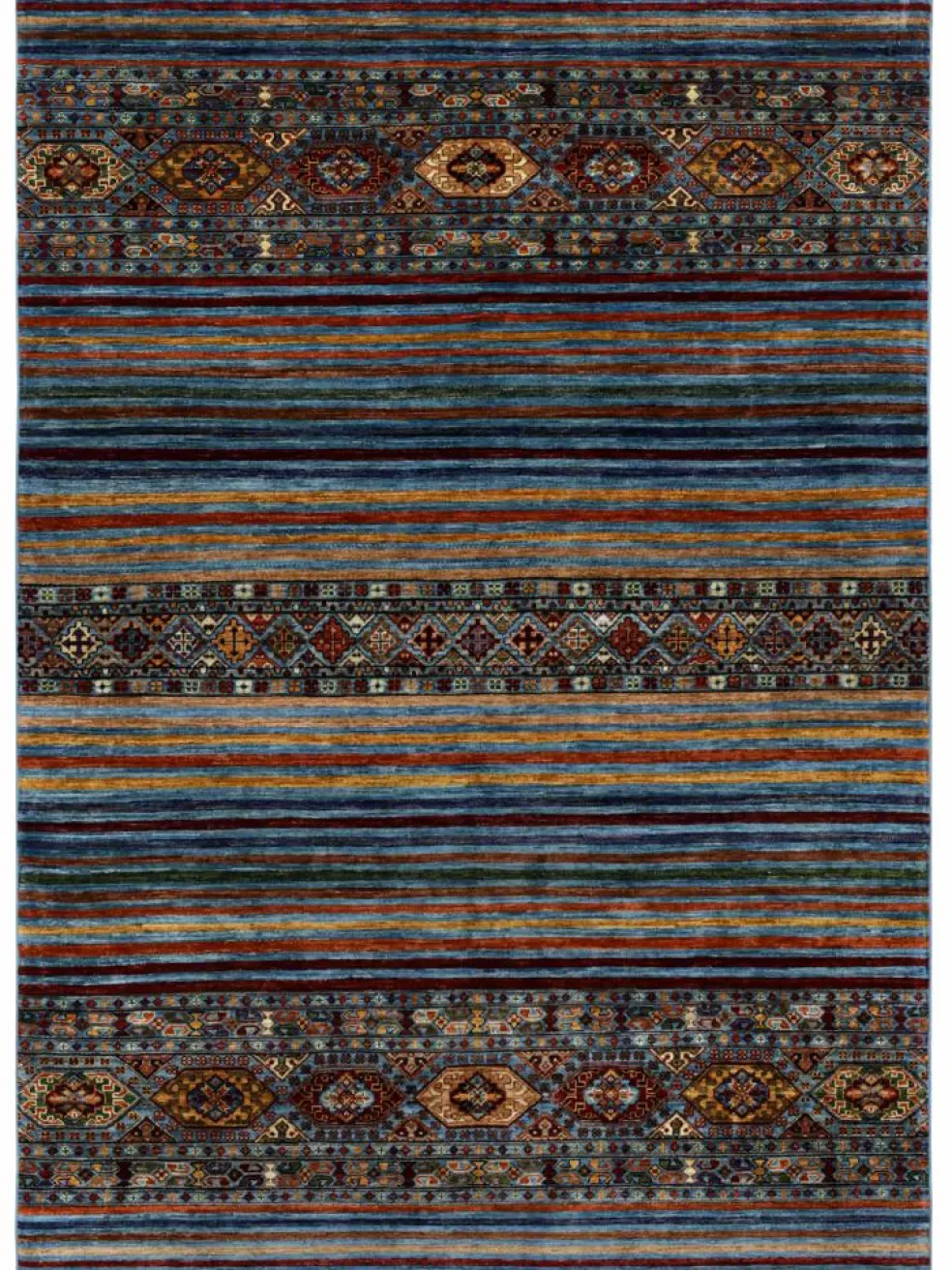 -Muster sind bunte Längsstreifen mit vielen verschiedenen Motiven gefüllt. Durch den flachen und festen Flor ist der Teppich unempfindlich gegenüber den Belastungen des Alltags. – Das Besondere an diesemOrientteppich