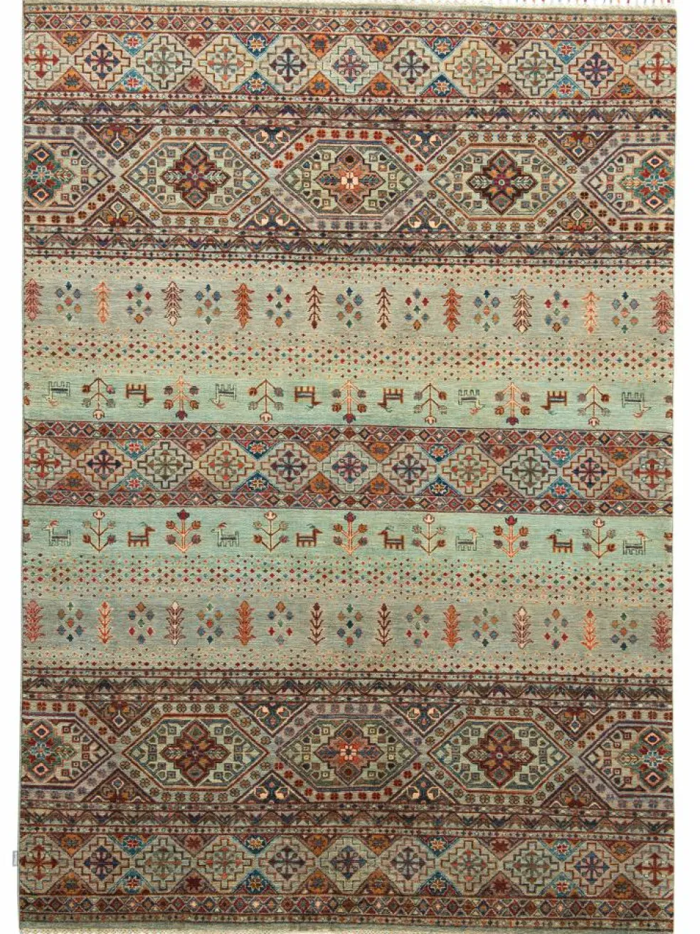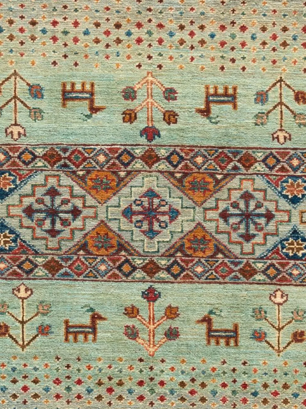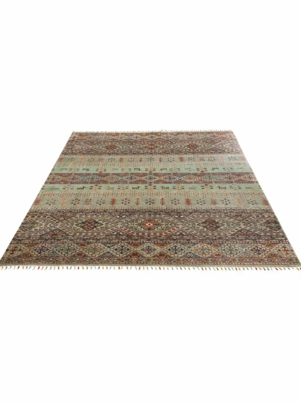 -Muster sind bunte Längsstreifen mit vielen verschiedenen Motiven gefüllt. Durch den flachen und festen Flor ist der Teppich unempfindlich gegenüber den Belastungen des Alltags.- Das Besondere an diesemOrientteppich
