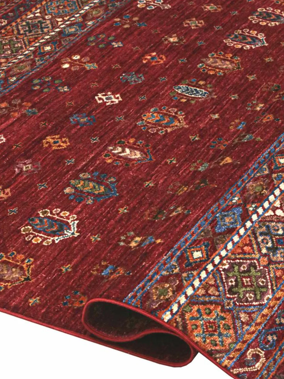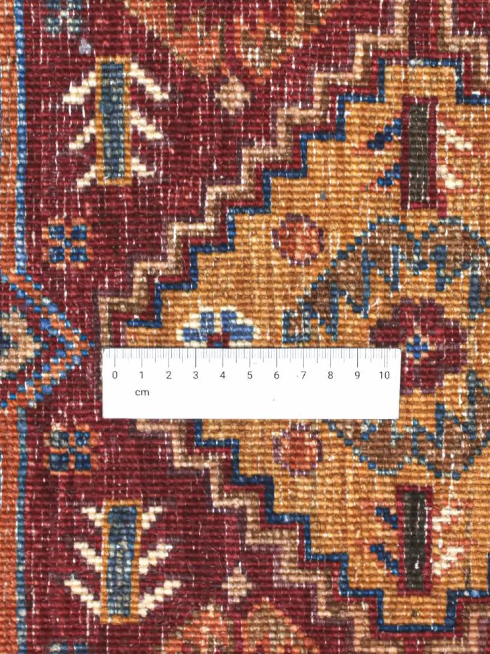 -Muster sind bunte Längsstreifen mit vielen verschiedenen Motiven gefüllt. Durch den flachen und festen Flor ist der Teppich unempfindlich gegenüber den Belastungen des Alltags. – Das Besondere an diesemOrientteppich