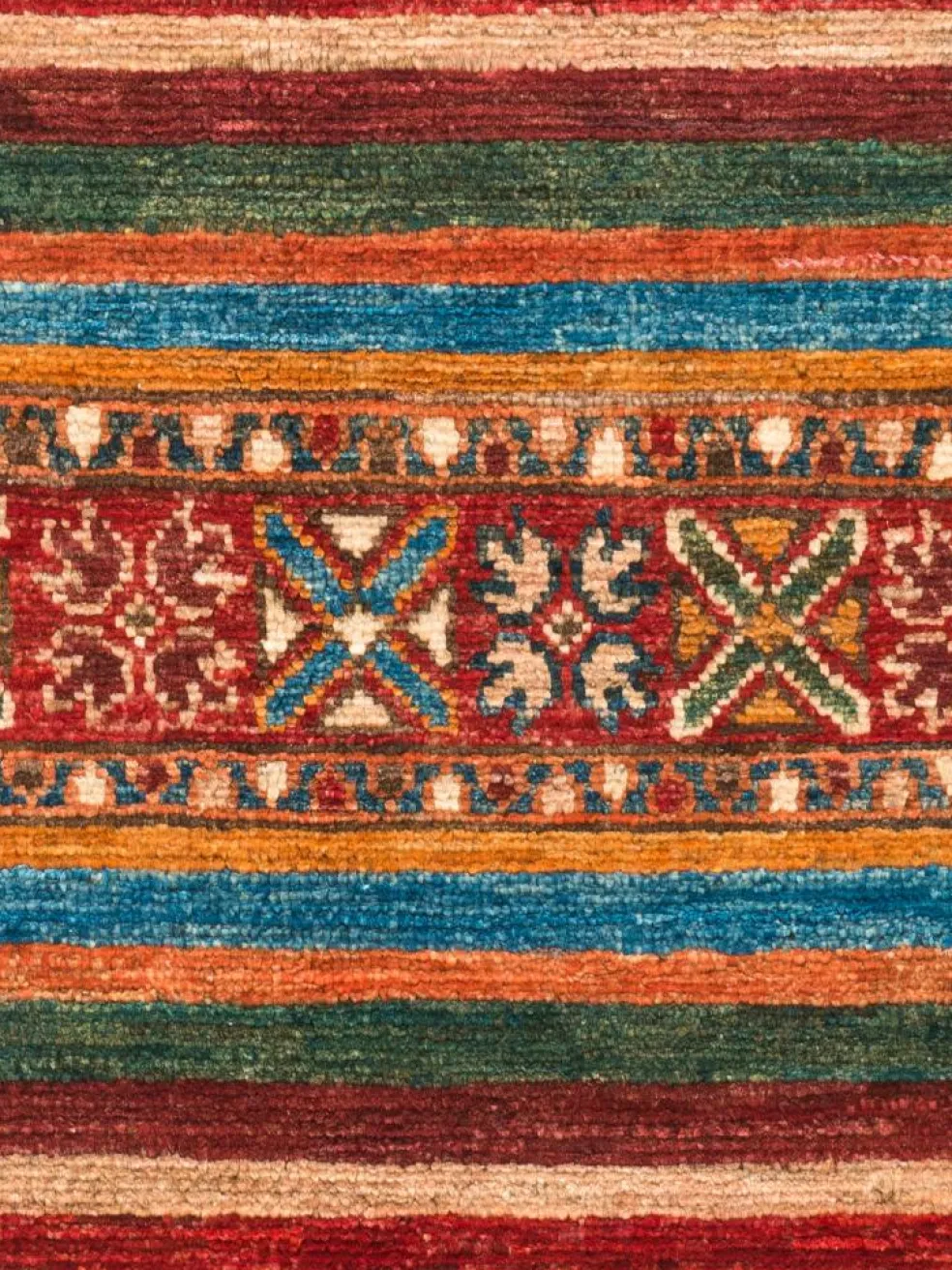 -Muster sind bunte Längsstreifen mit vielen verschiedenen Motiven gefüllt. Durch den flachen und festen Flor ist der Teppich unempfindlich gegenüber den Belastungen des Alltags.- Das Besondere an diesemOrientteppich