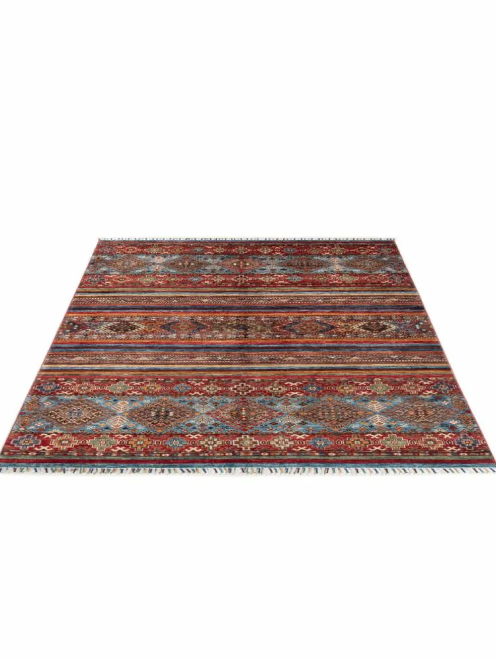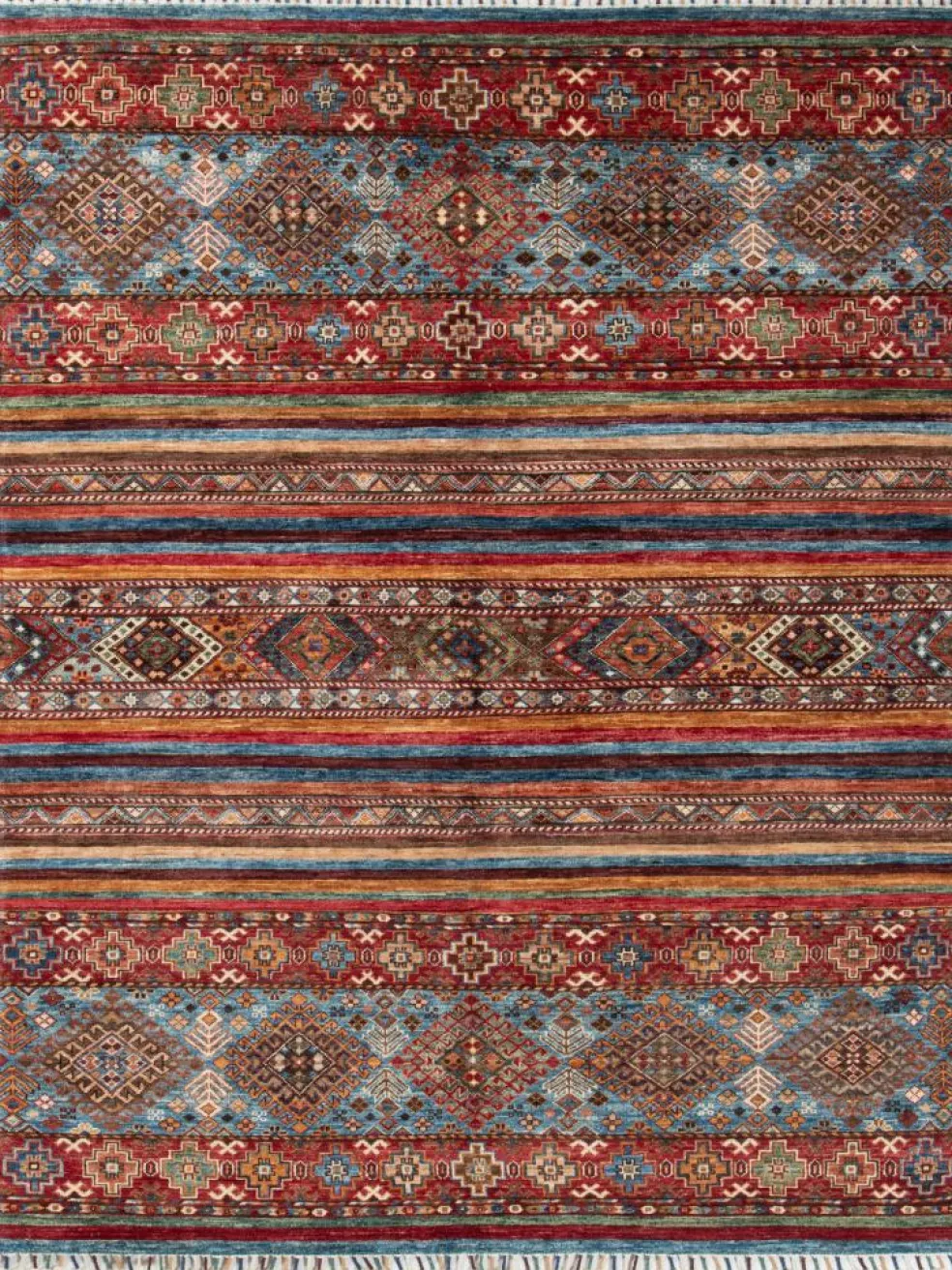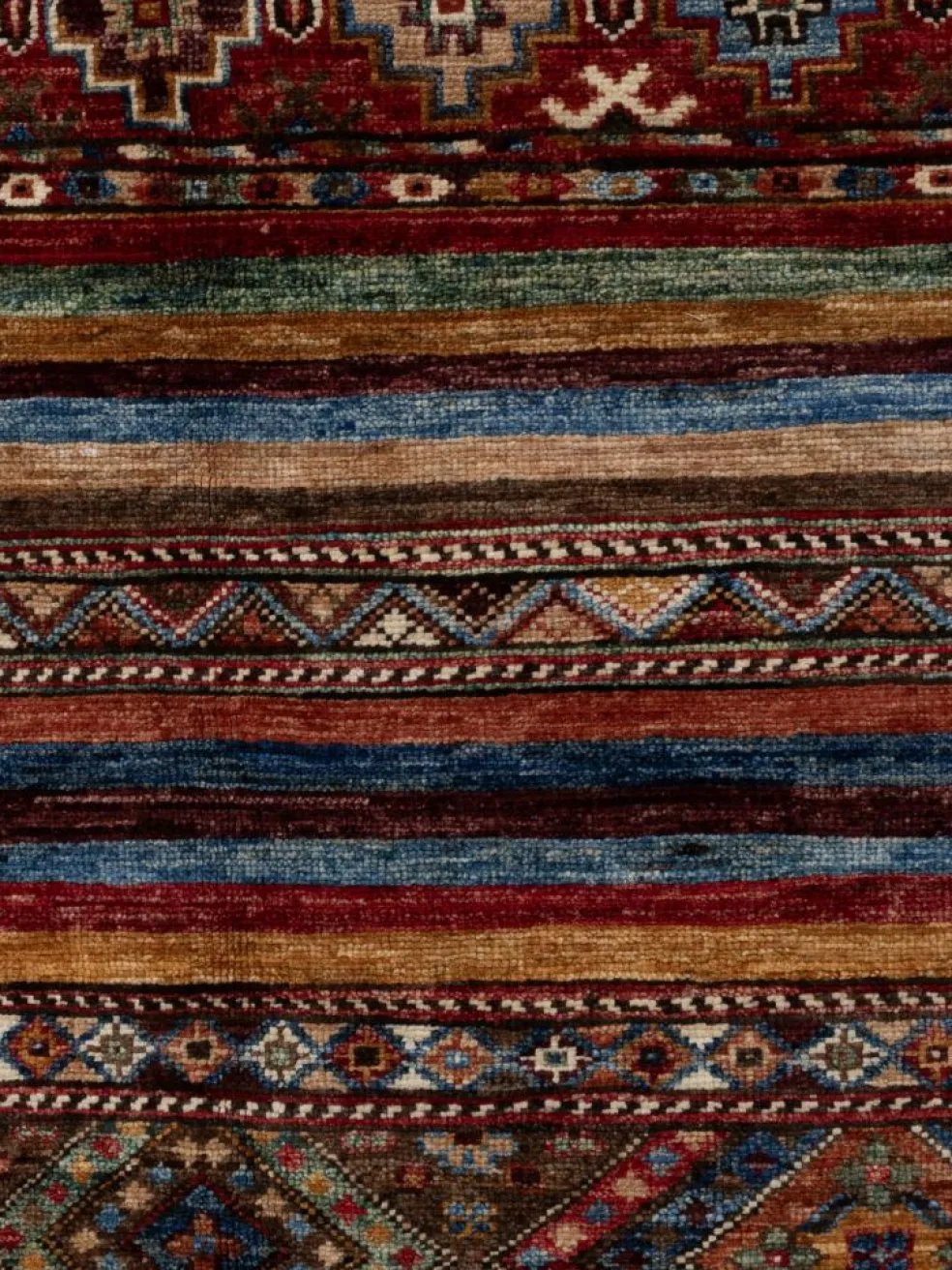 -Muster sind bunte Längsstreifen mit vielen verschiedenen Motiven gefüllt. Durch den flachen und festen Flor ist der Teppich unempfindlich gegenüber den Belastungen des Alltags. – Das Besondere an diesemOrientteppich
