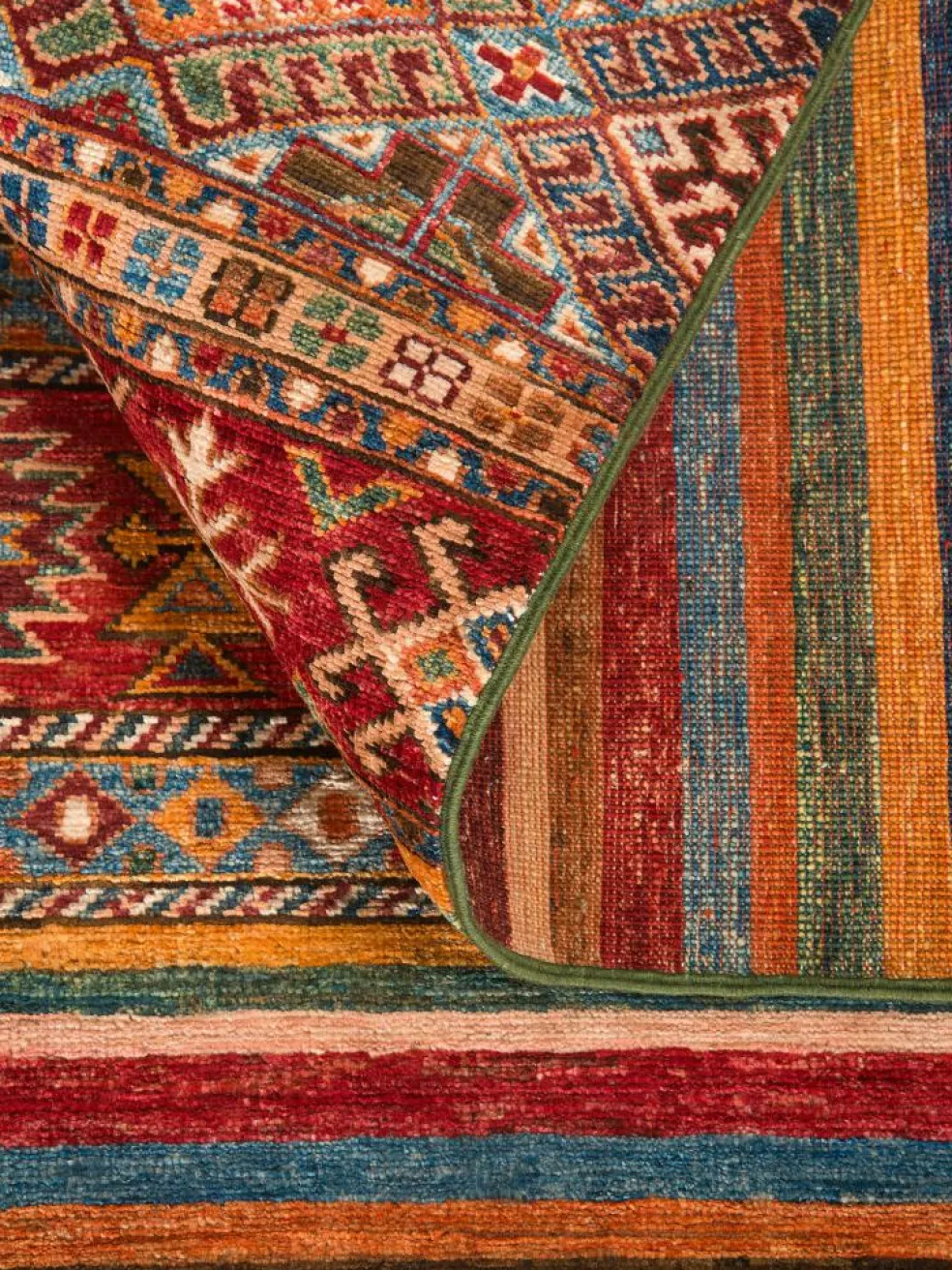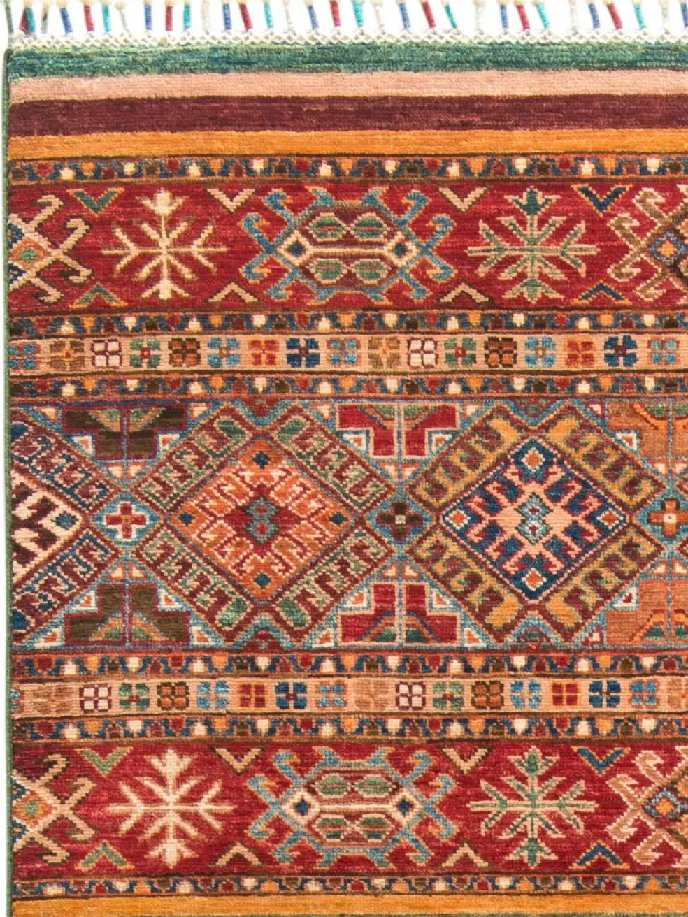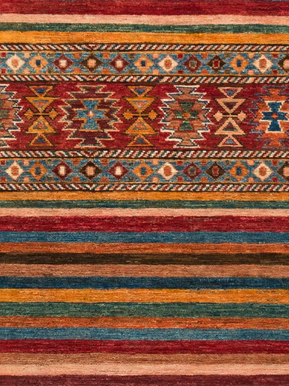 -Muster sind bunte Längsstreifen mit vielen verschiedenen Motiven gefüllt. Durch den flachen und festen Flor ist der Teppich unempfindlich gegenüber den Belastungen des Alltags.- Das Besondere an diesemOrientteppich