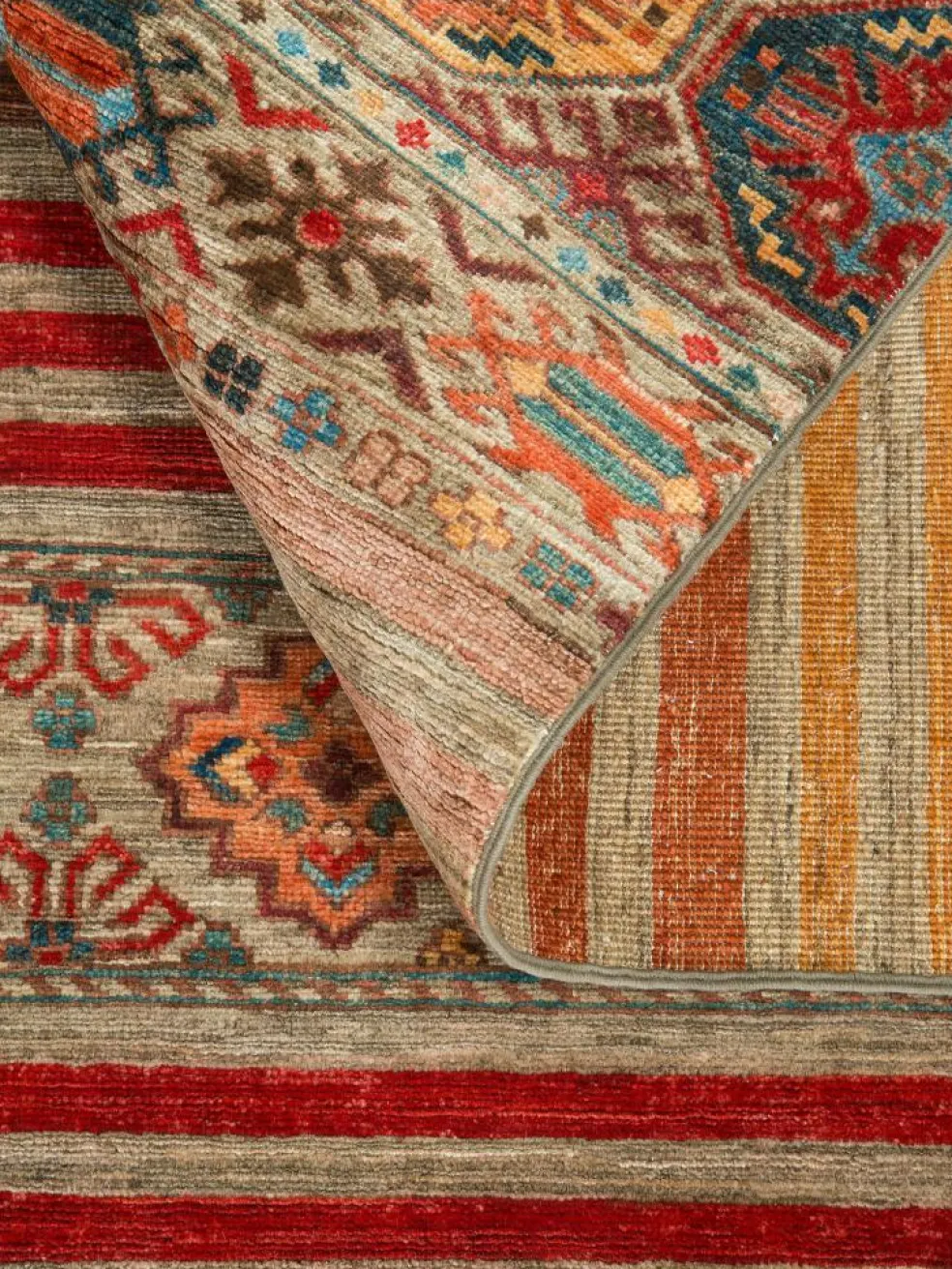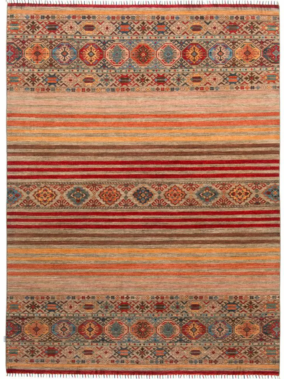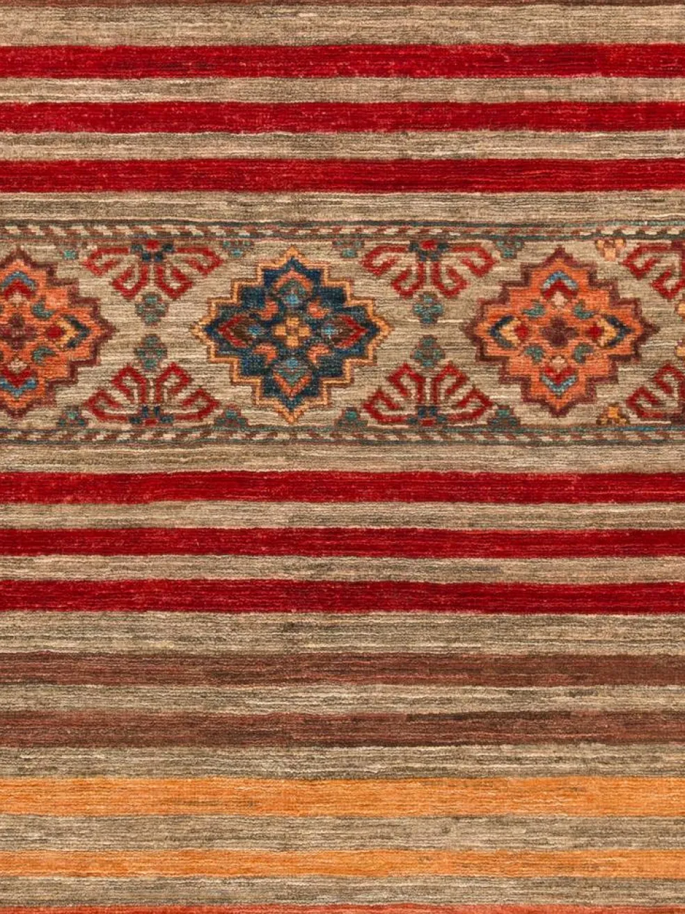 -Muster sind bunte Längsstreifen mit vielen verschiedenen Motiven gefüllt. Durch den flachen und festen Flor ist der Teppich unempfindlich gegenüber den Belastungen des Alltags.- Das Besondere an diesemOrientteppich