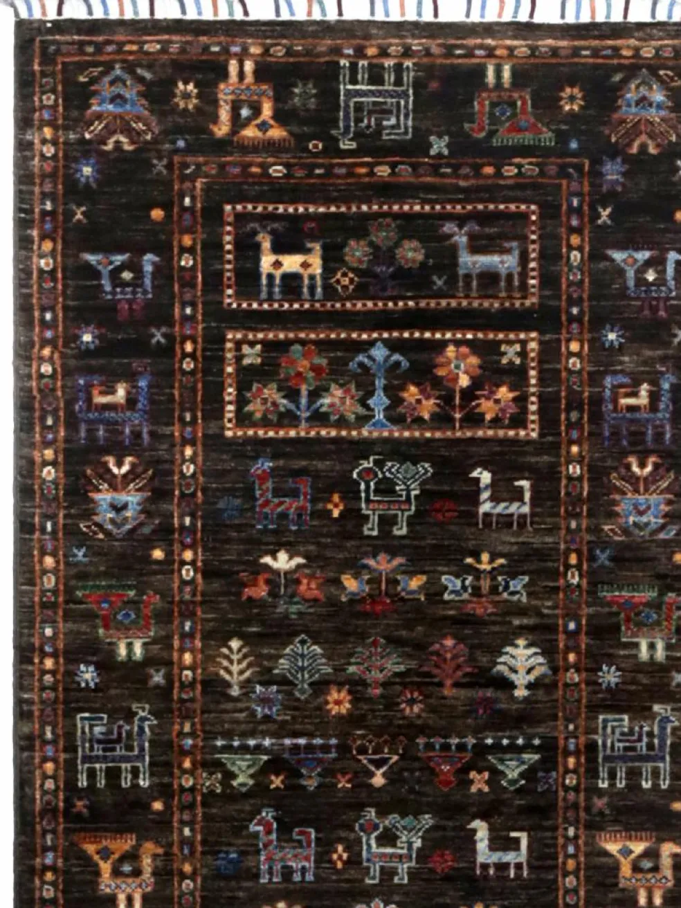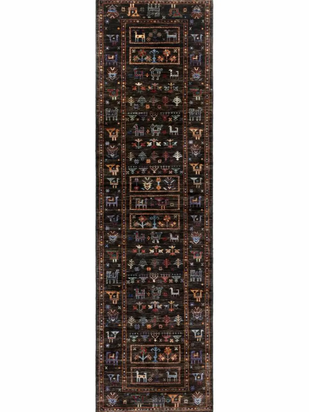 -Muster sind bunte Längsstreifen mit vielen verschiedenen Motiven gefüllt. Durch den flachen und festen Flor ist der Teppich unempfindlich gegenüber den Belastungen des Alltags. – Das Besondere an diesemOrientteppich