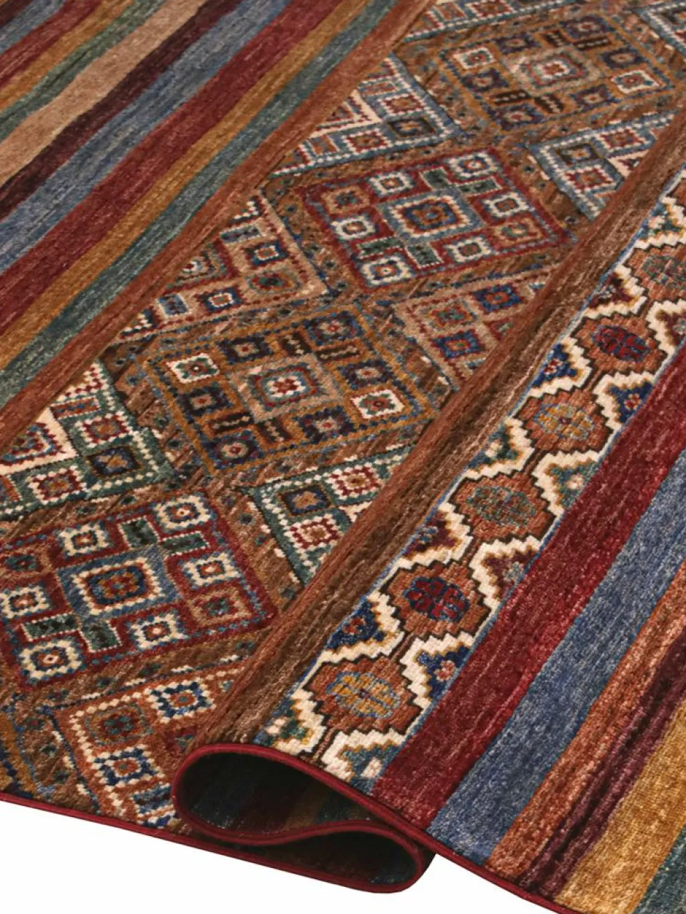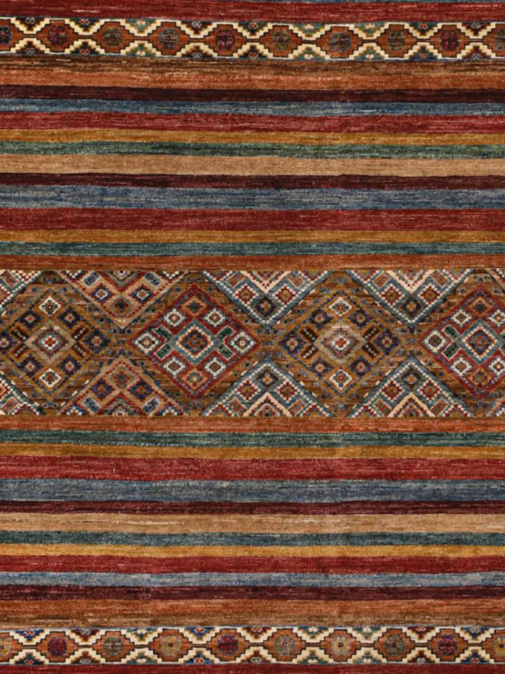 -Muster sind bunte Längsstreifen mit vielen verschiedenen Motiven gefüllt. Durch den flachen und festen Flor ist der Teppich unempfindlich gegenüber den Belastungen des Alltags. – Das Besondere an diesemOrientteppich
