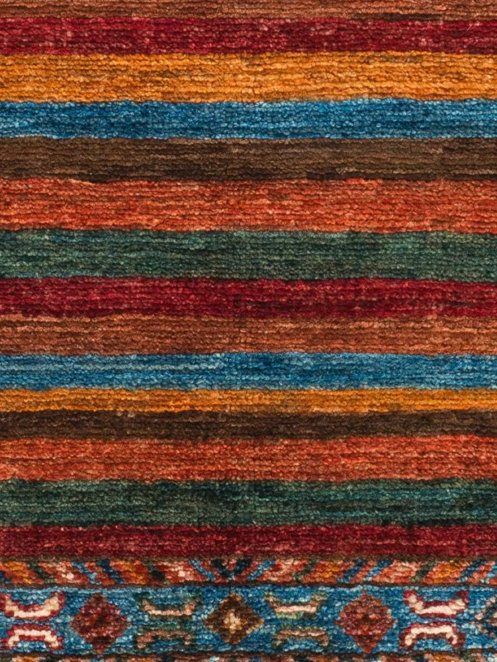 -Muster sind bunte Längsstreifen mit vielen verschiedenen Motiven gefüllt. Durch den flachen und festen Flor ist der Teppich unempfindlich gegenüber den Belastungen des Alltags.- Das Besondere an diesemOrientteppich